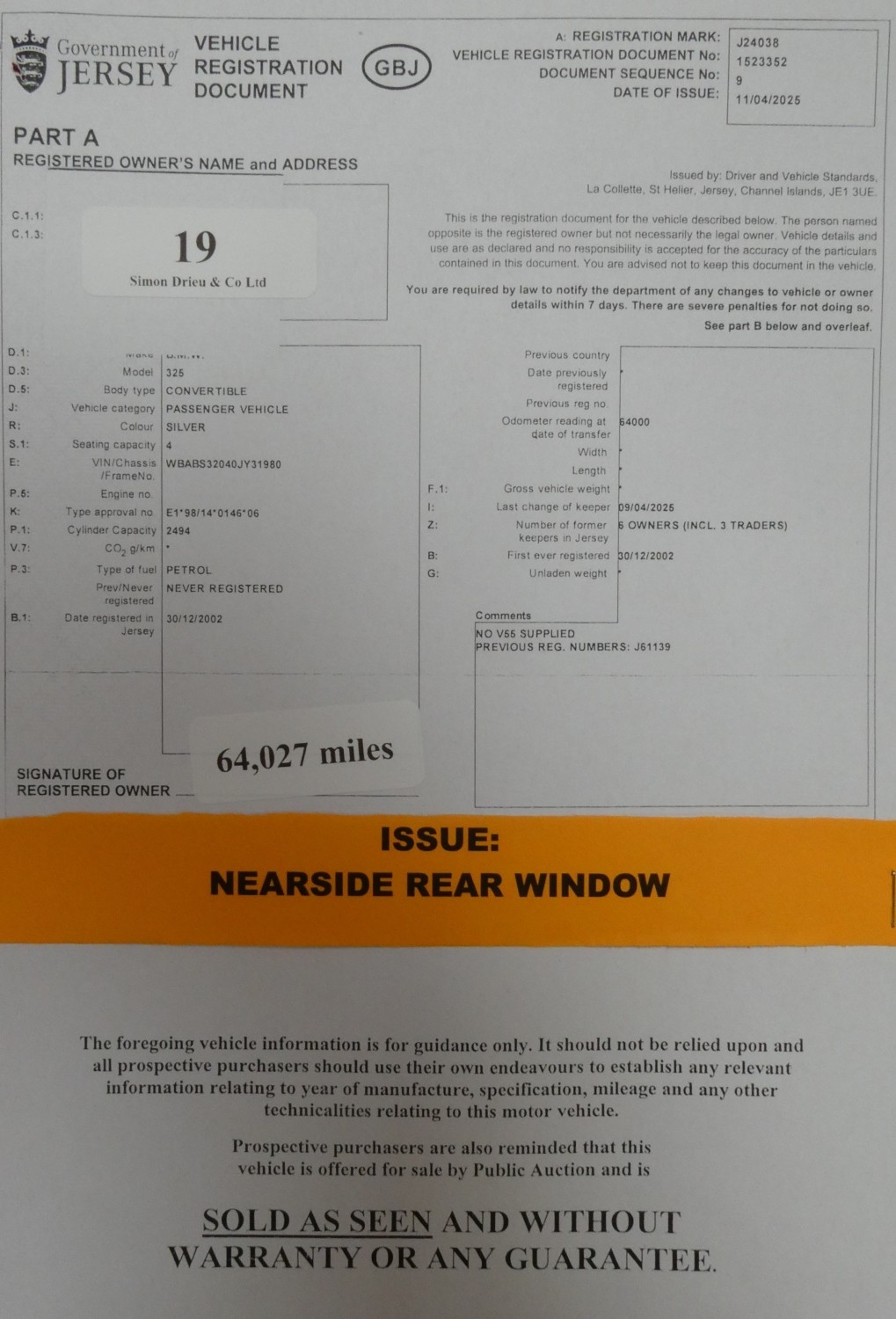 A 2002 BMW 325i 2.5 convertible J24038 (petrol/automatic), odometer reading 64,027 miles