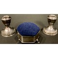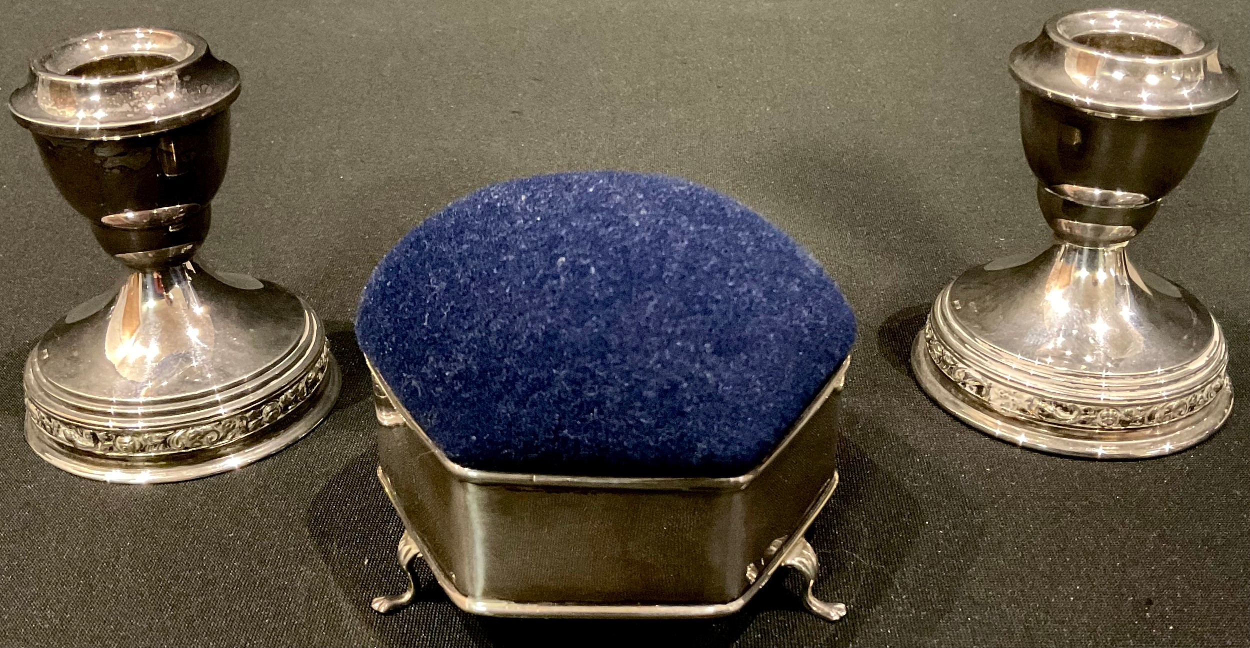 A late Edwardian hexagonal silver pin cushion, resting on three slender cabriole pad feet, domed blue velvet cover, 7.5cm wide, Birmingham 1910; a pair of silver boudoir candlesticks, marked "Silver", hollow filled, 7.5cm (3)