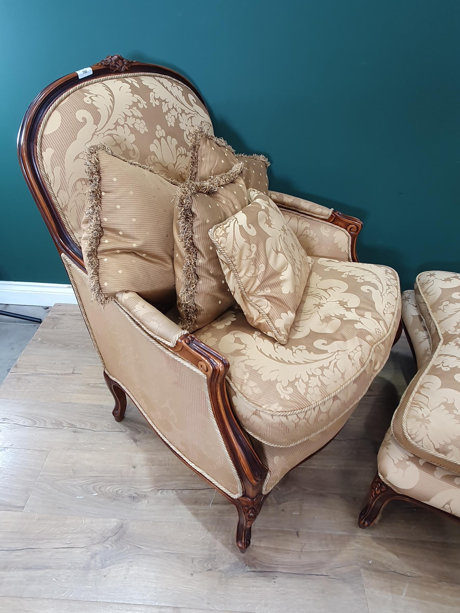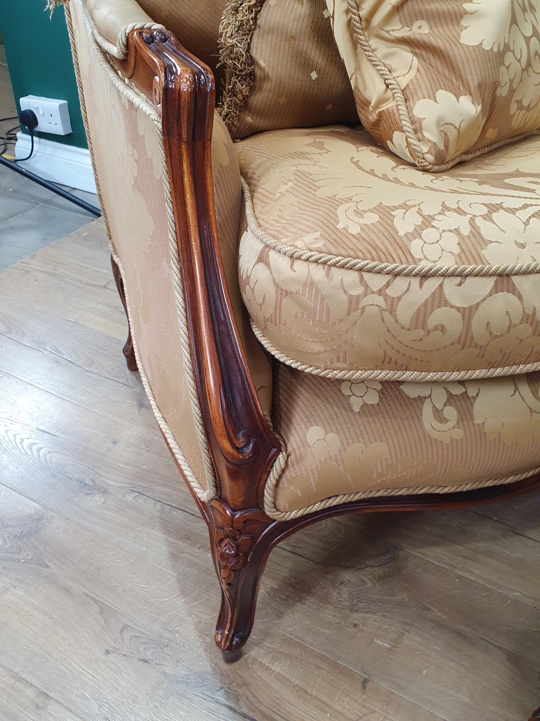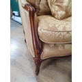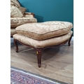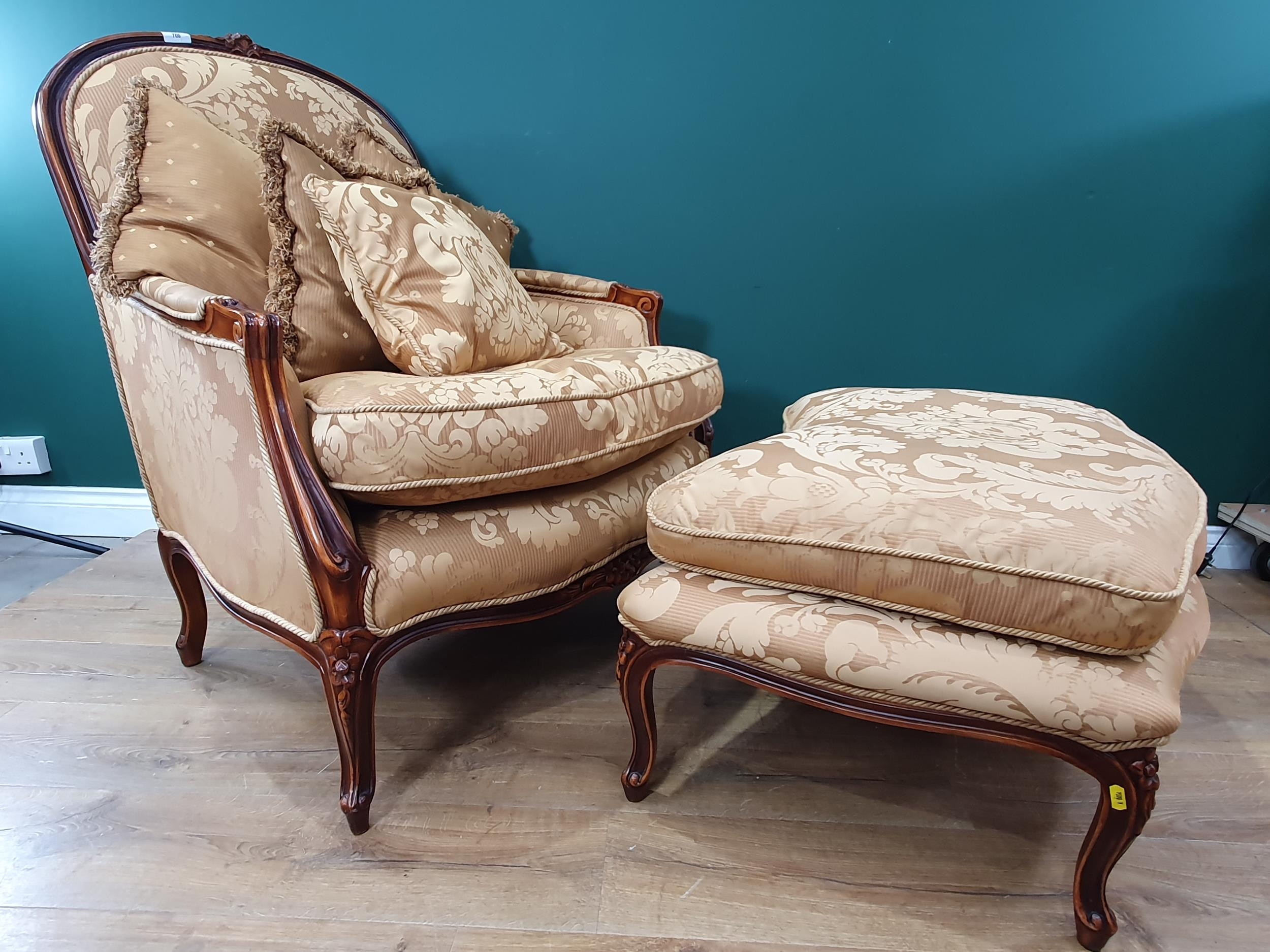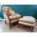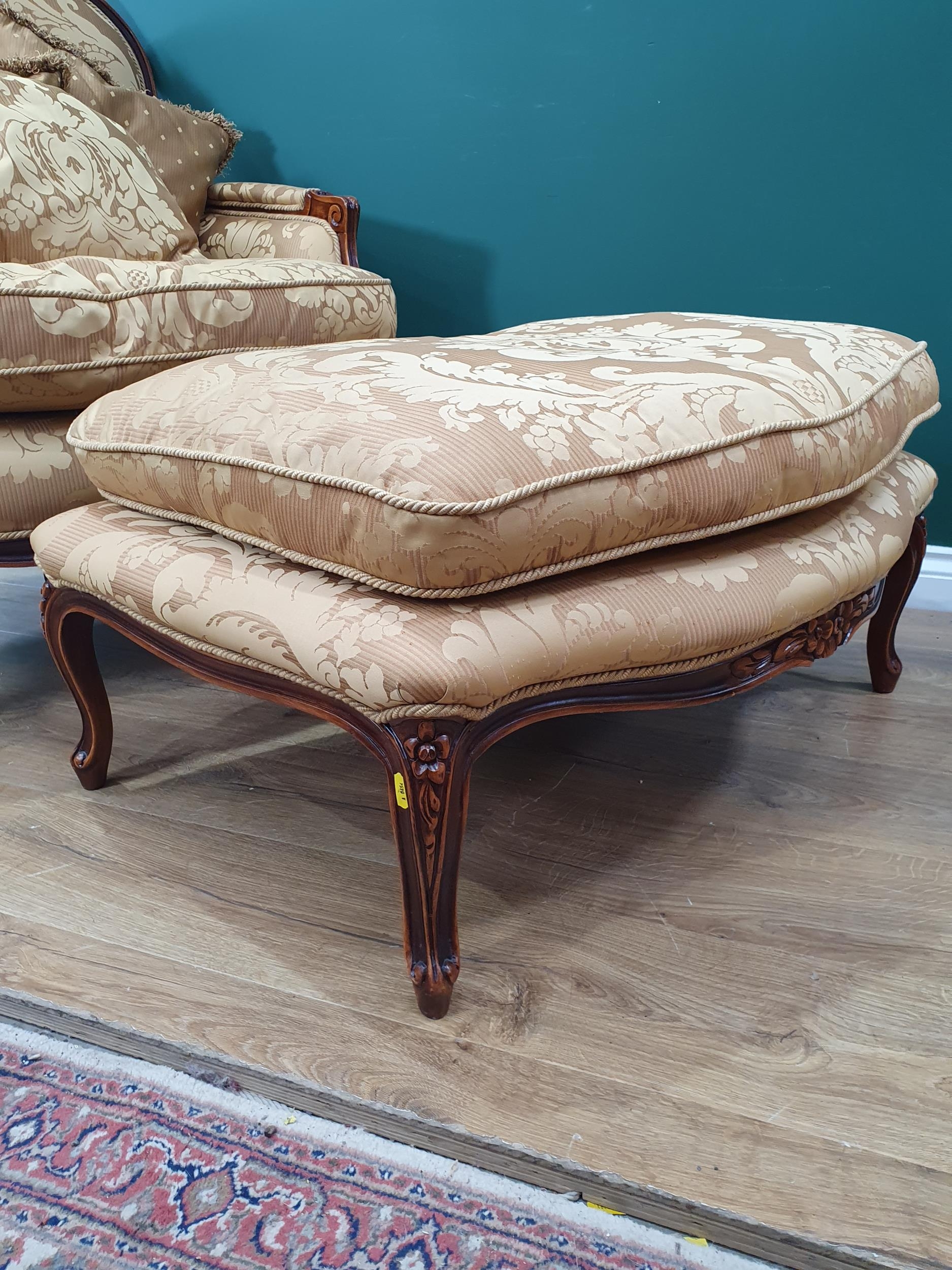 A French style Armchair with gold leafage upholstery and matching Footstool