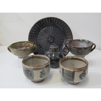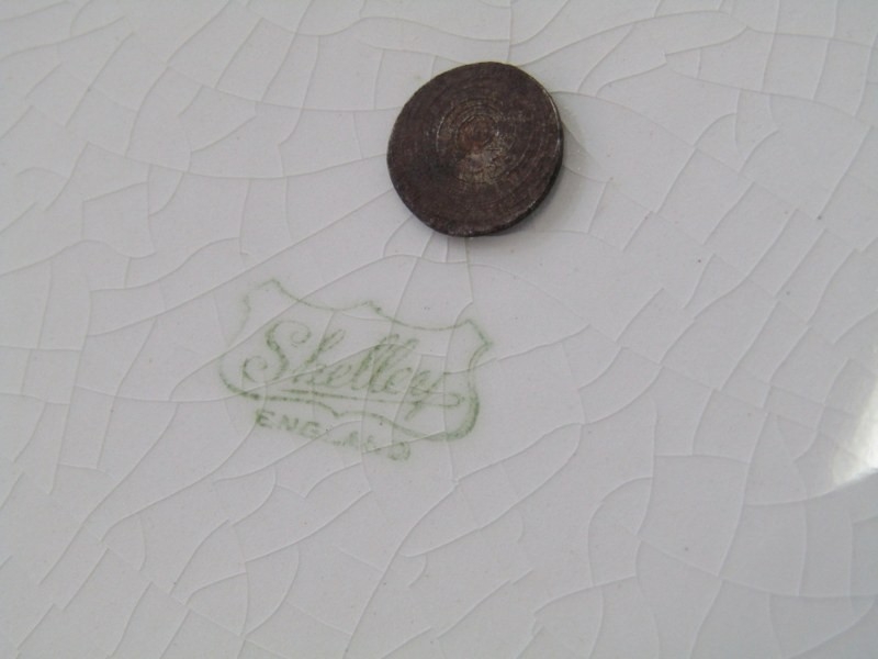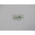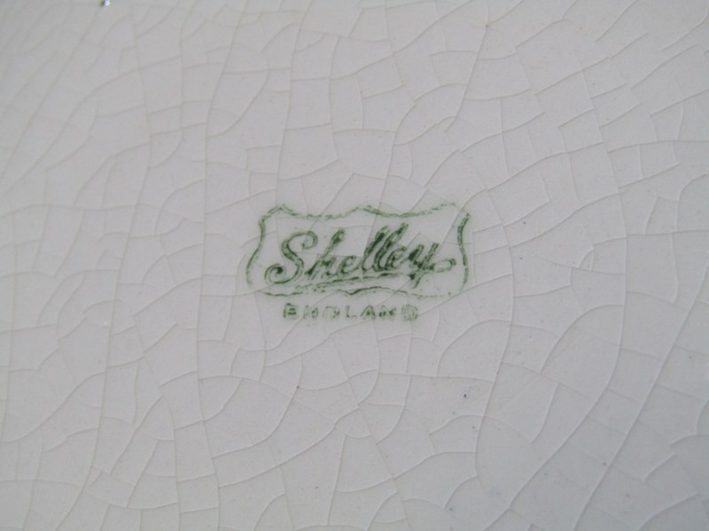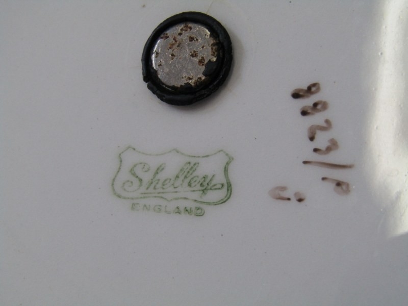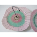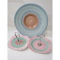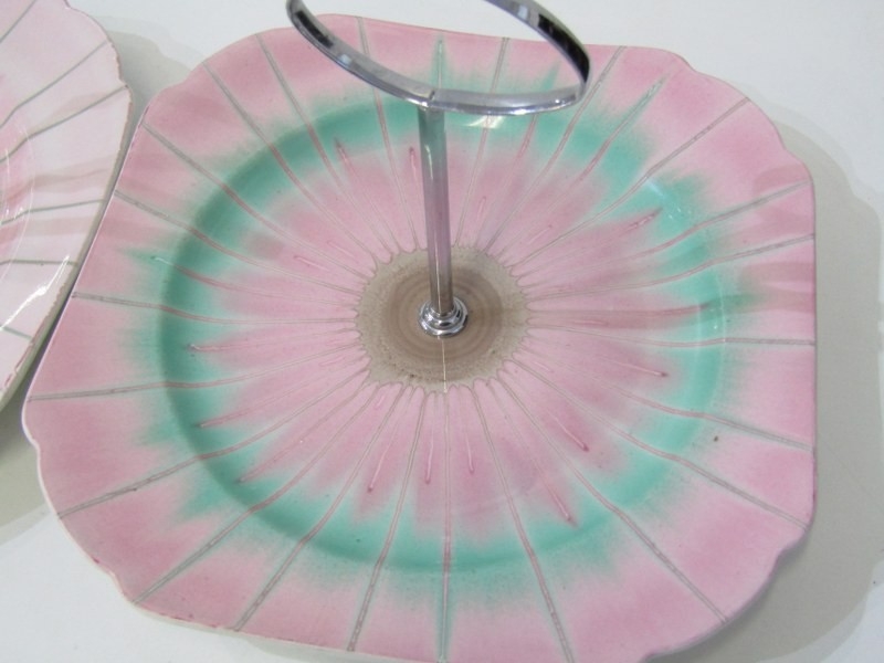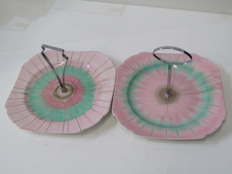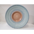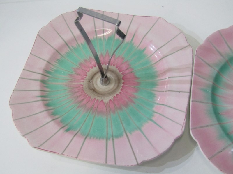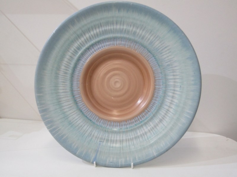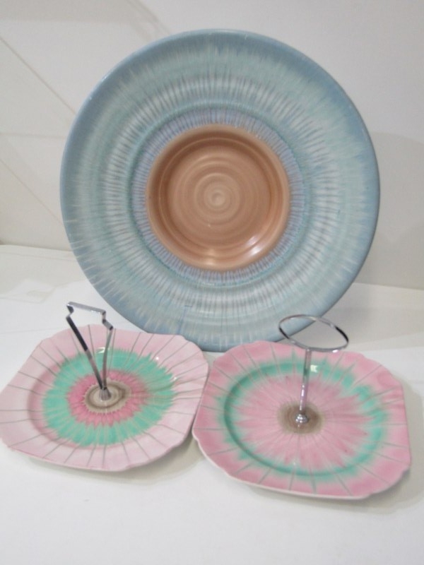 SHELLEY POTTERY, a large Shelley Art Deco shallow dish, central brown and cream ground surrounded by drip glazed blue body, 36cm diameter, together with 2 Shelley Art Deco cake stands (3)