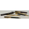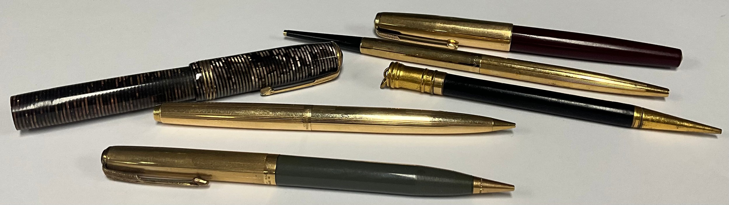 A Parker fountain pen, push close rolled gold cap, burgundy; a Parker rolled gold mechanical pencil; other Parker rolled gold and gold filled pens, pencils, etc (5)