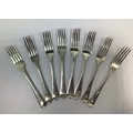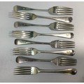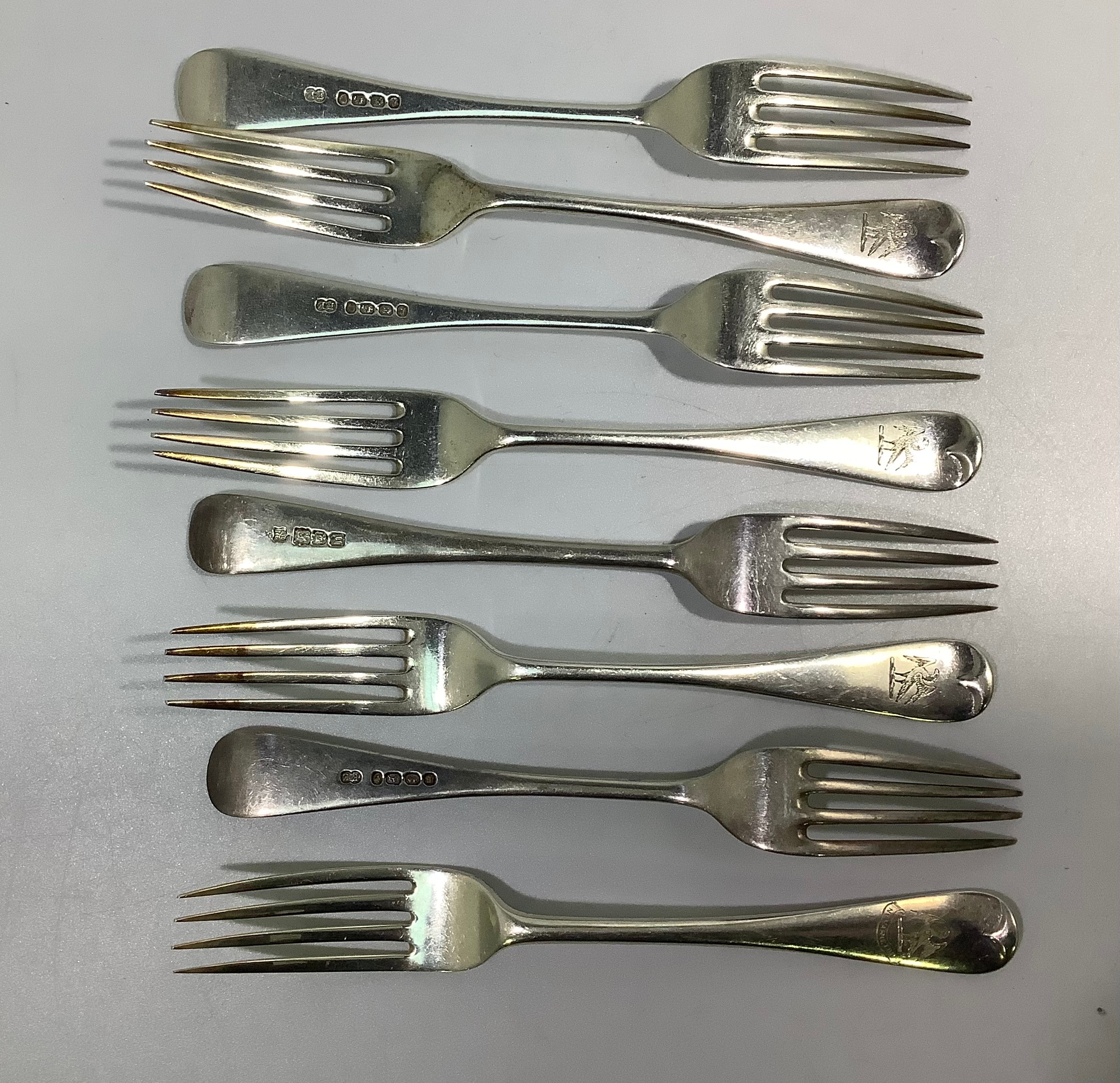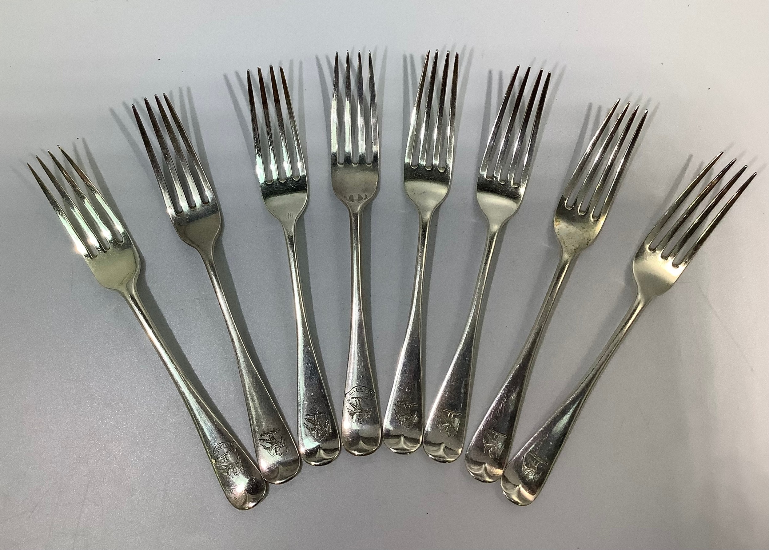 A set of six Victorian silver old English pattern forks by Elkington & Co. All etched with phoenix crest, hallmarked Birmingham, 1877, together with two similar fiddle pattern forks by Josiah Williams & co. Also with Phoenix crest and inscribed ‘Ne Varietur’ (unwavering) gross weight approximately 11.1ozt