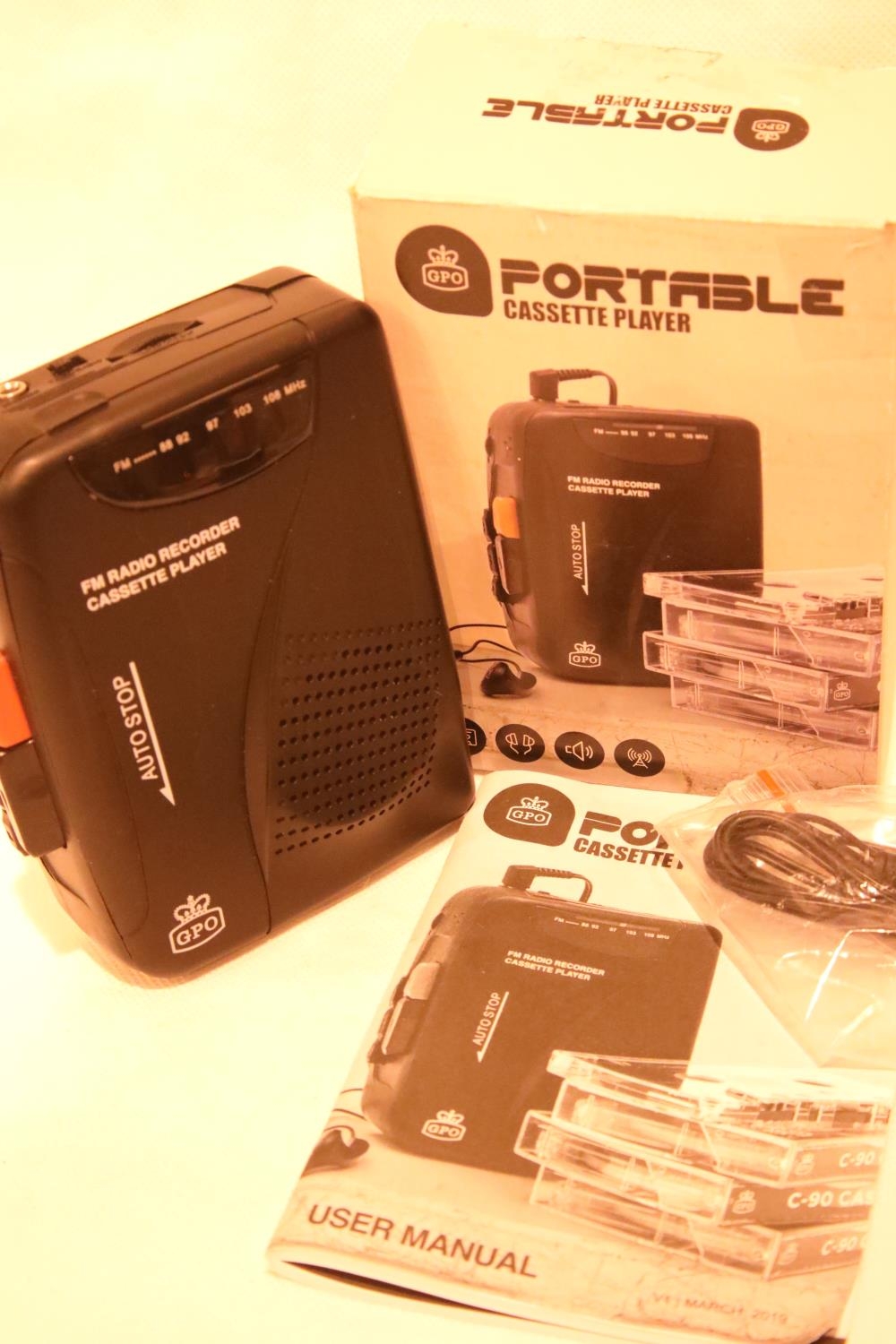 GPO Personal FM radio and cassette player, 3.5mm jack and 3V DC in jack, with built in microphone, boxed. P&P Group 1 (£14+VAT for the first lot and £1+VAT for subsequent lots)