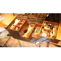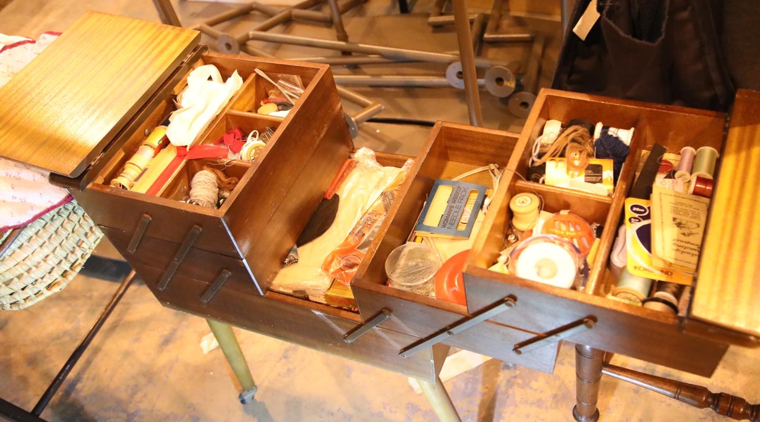 Concertina drawing walnut sewing box with contents. Not available for in-house P&P.