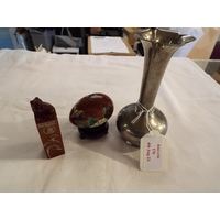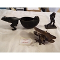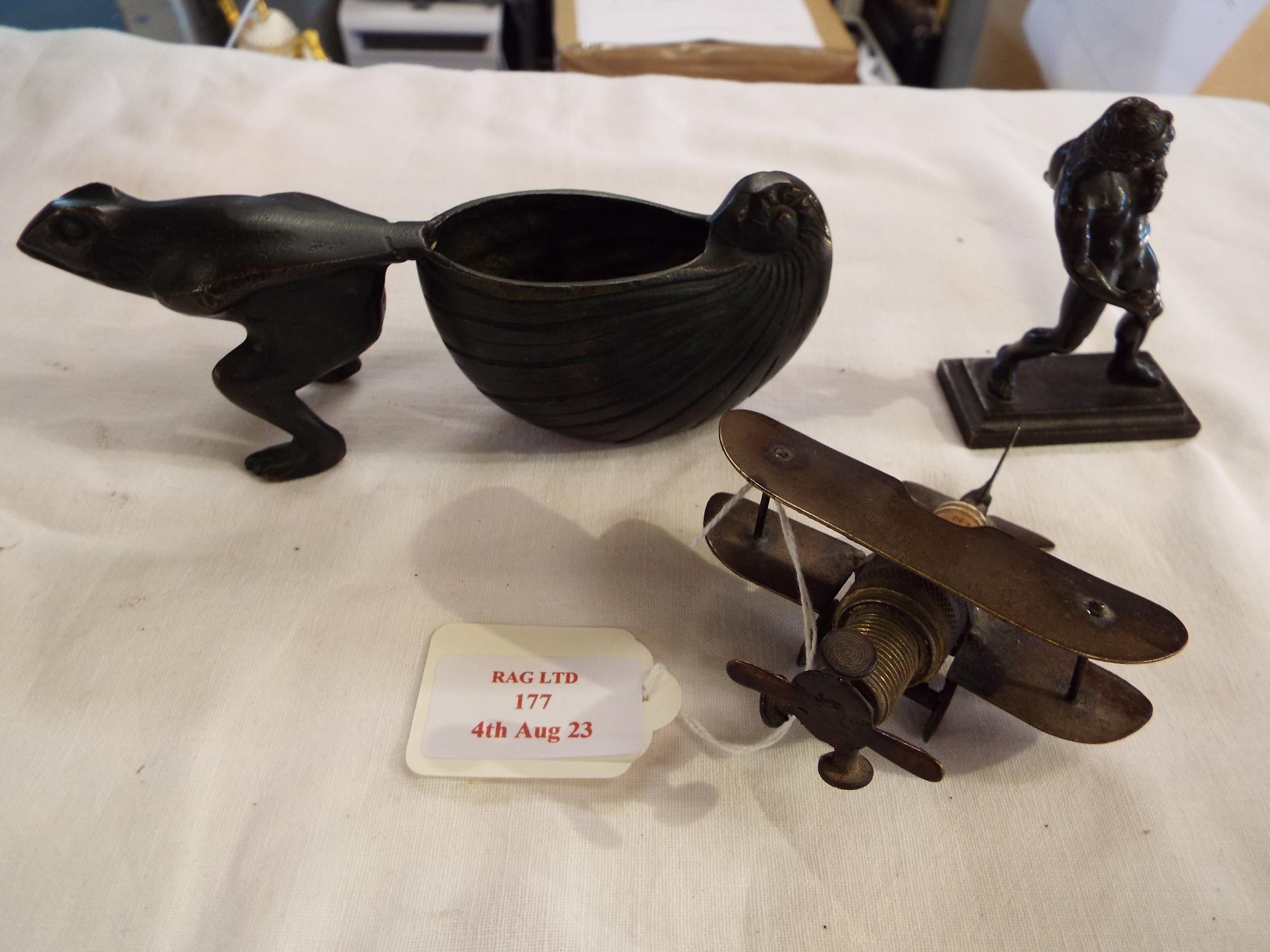 A model brass aeroplane made from a spark plug also a bronze frog pulling a shell and a bronze male figure