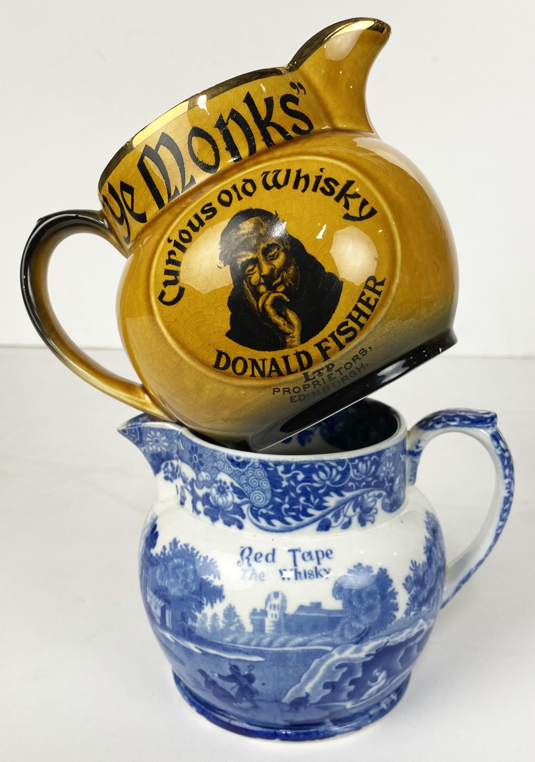 WHISKY JUG DUO. Tallest 4ins. Red Tape & Donald Fisher Ye Monks. Copeland Spodes base p.m. Lip chip. (2)