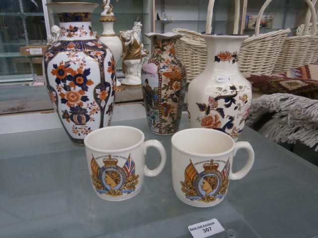 Two coronations cups and three ornate vases
