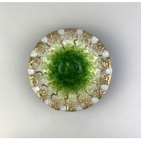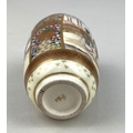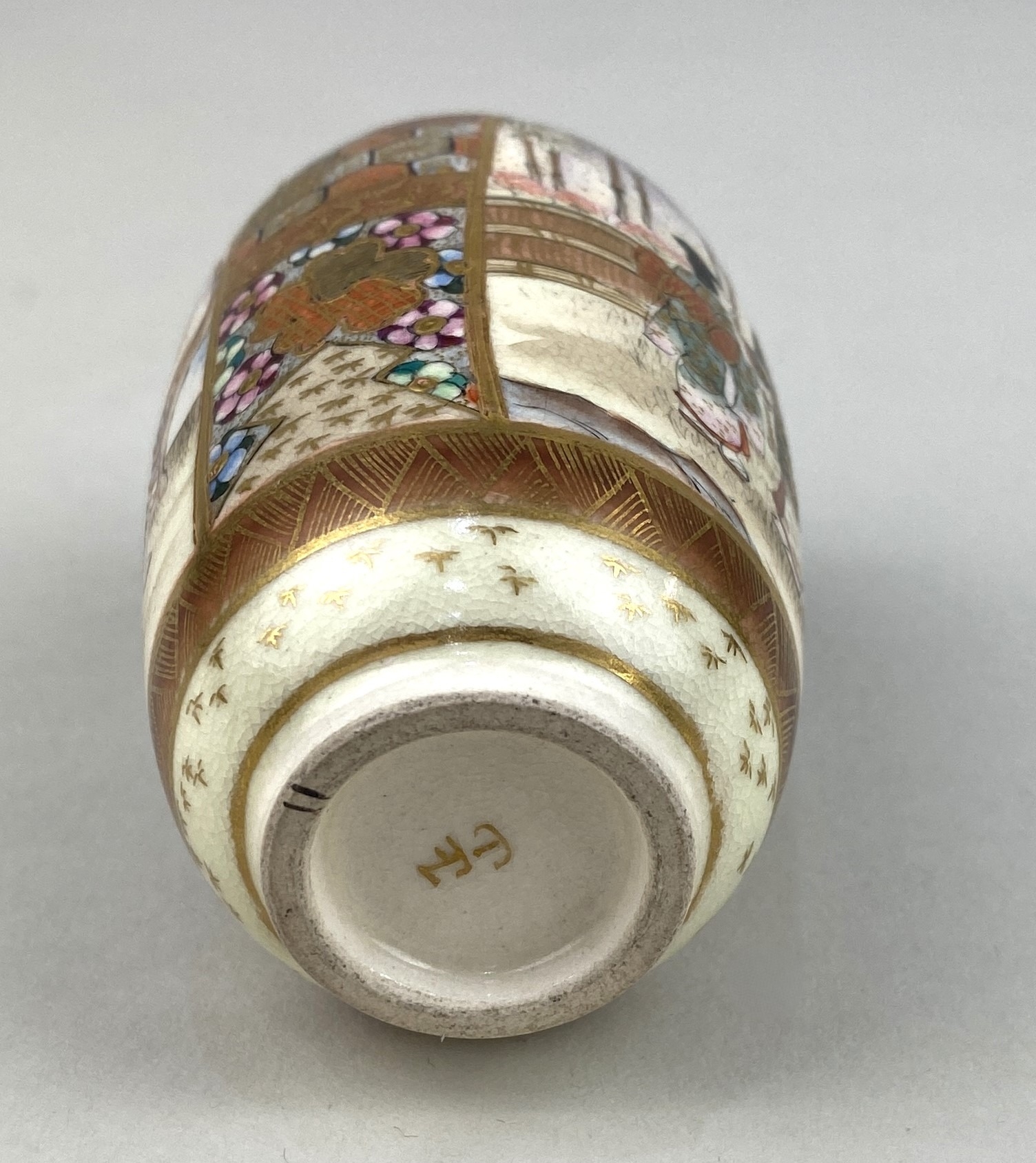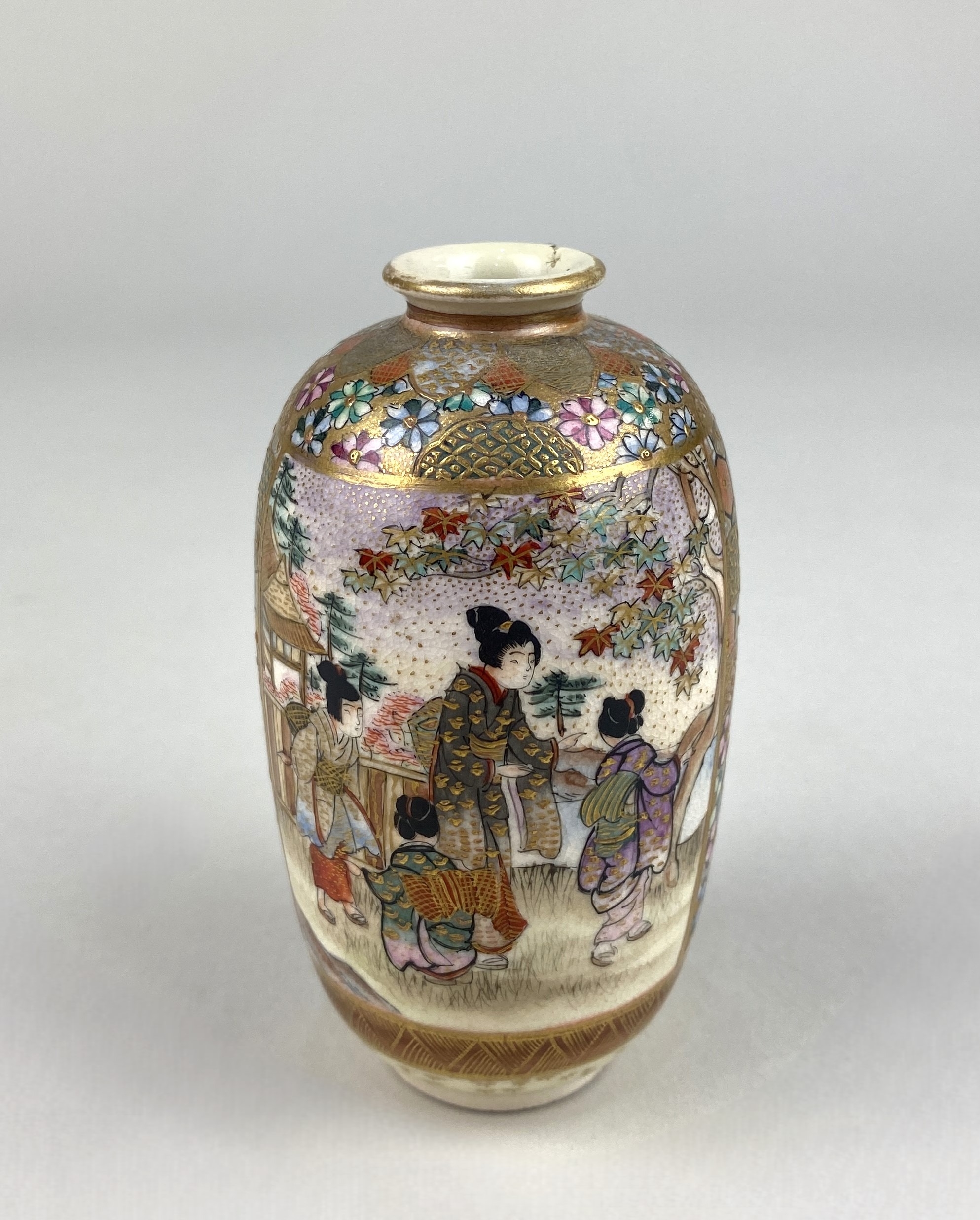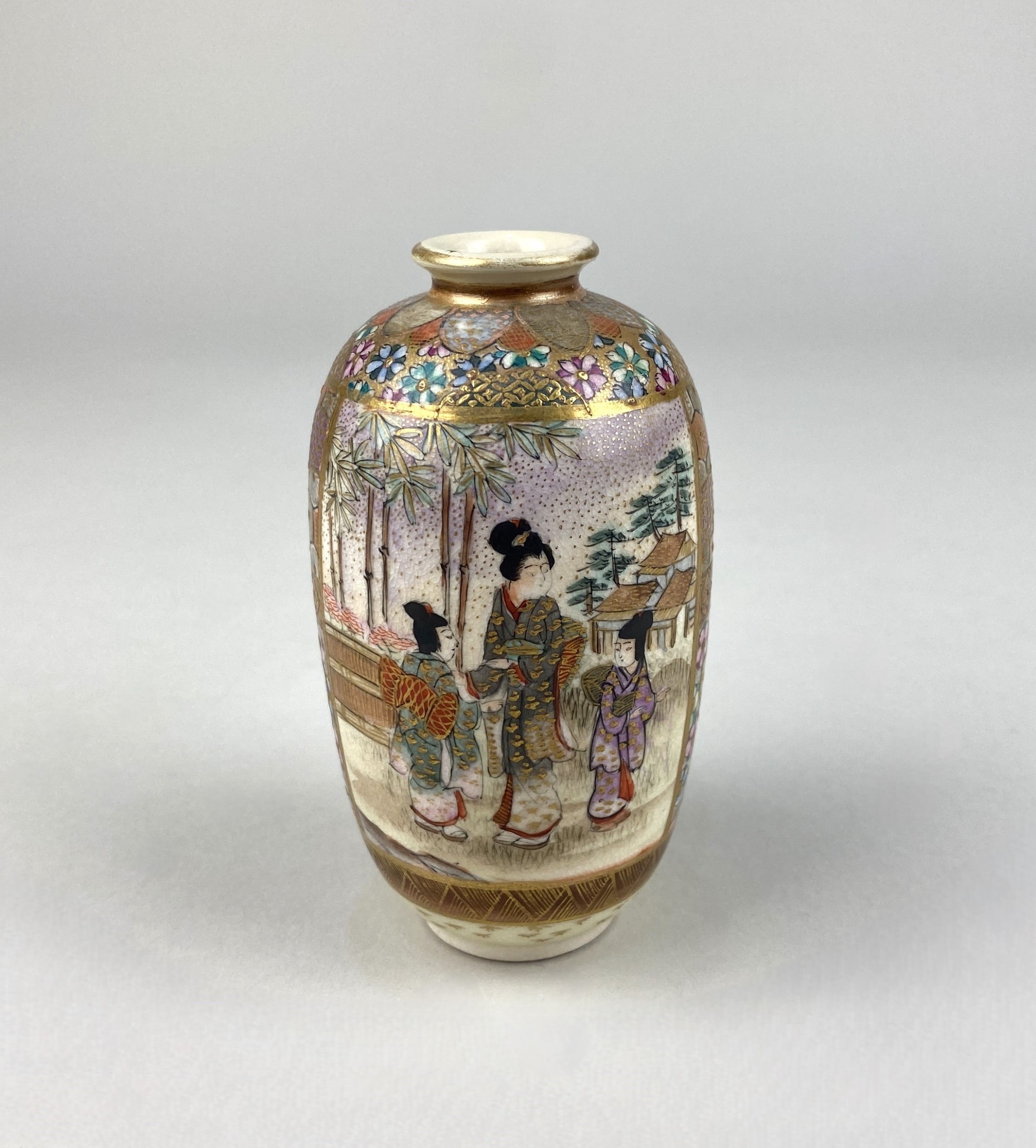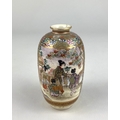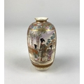 A Japanese small satsuma vase decorated with opposing panels of figures in a garden, 10cm
