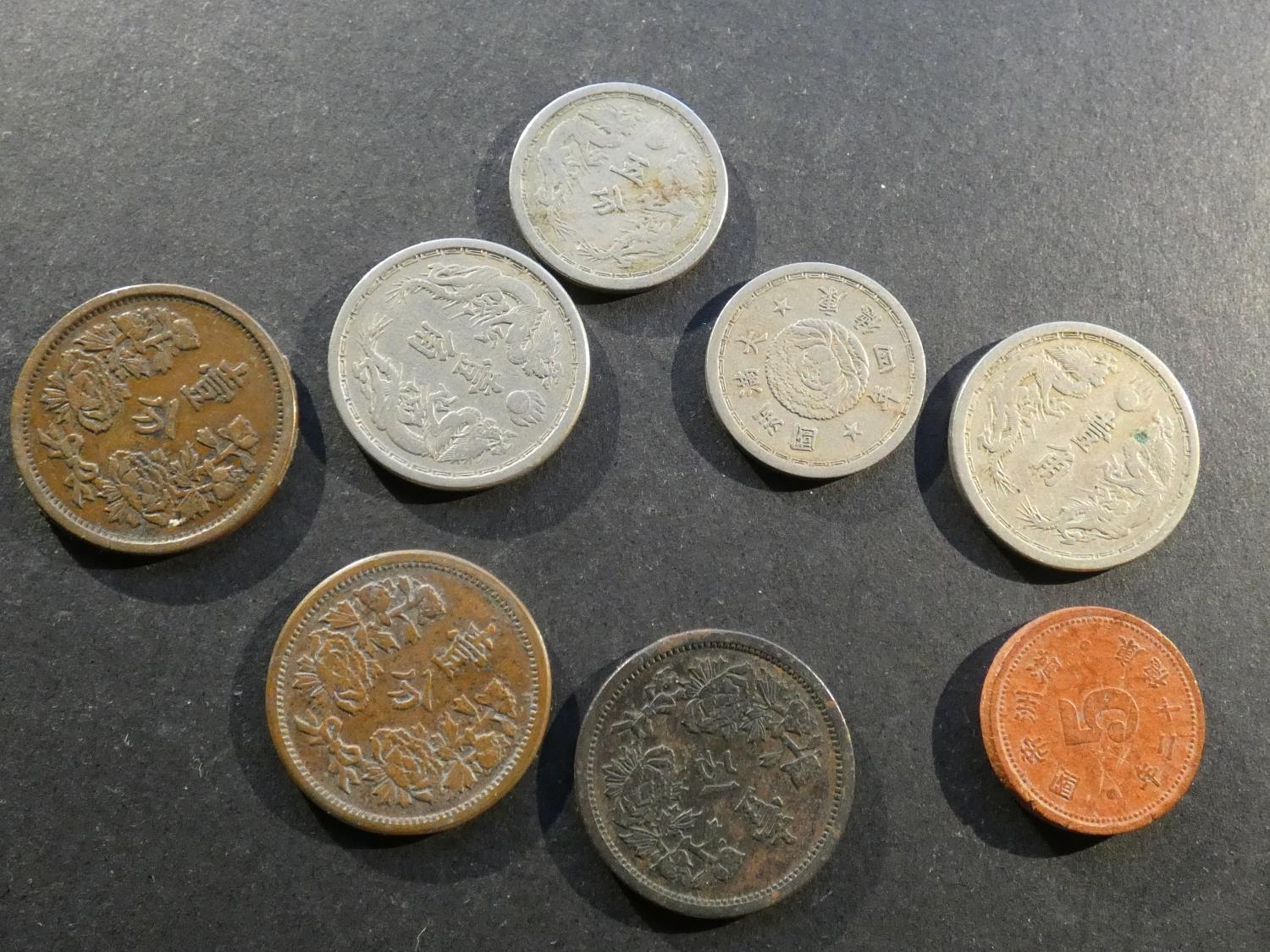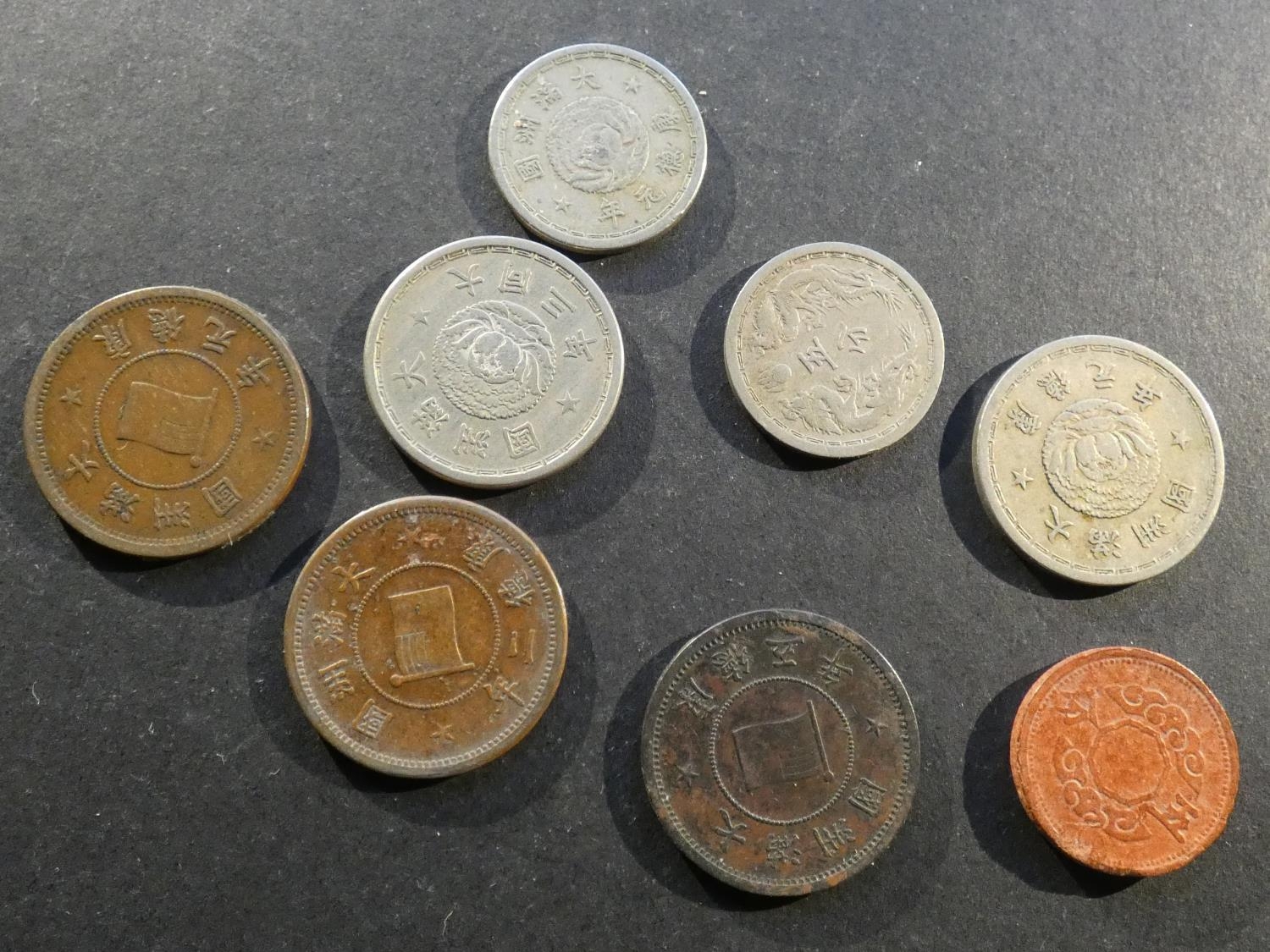 CHINA. Manchukuo, Japanese occupation, 1 Fen, KT Years 1, 2 & 5 (1934, 1935, 1938), Y6, 5 Fen, KT Years 1 & 4 (1934, 1937), Y7, and 10 Fen, TT Year 3 (1934) & KT Year 1 (1934), plus red fibre 5 Fen, KT Year 2 (1945), YA13a. F to VF (8)