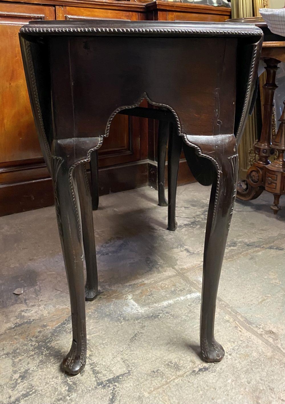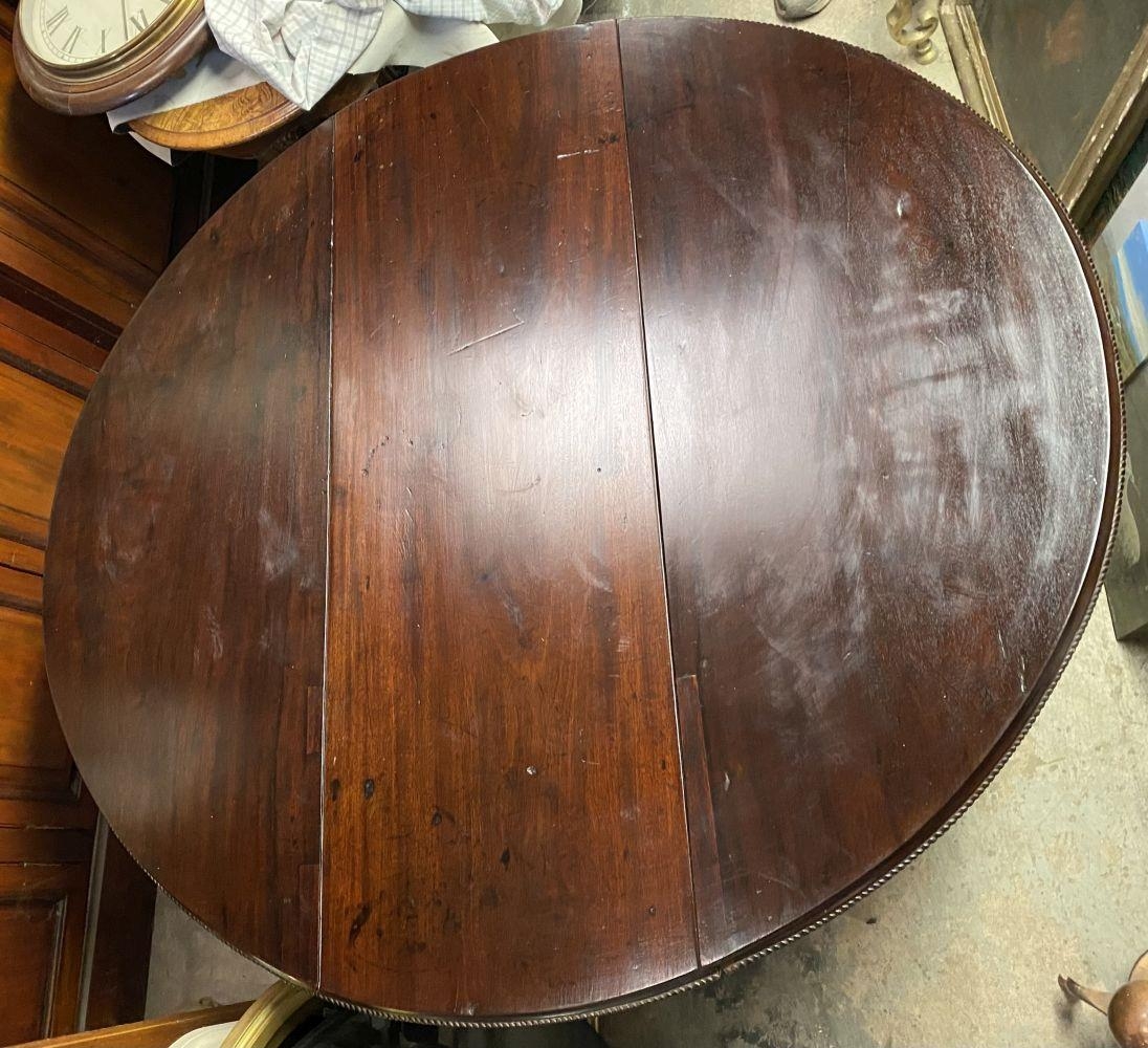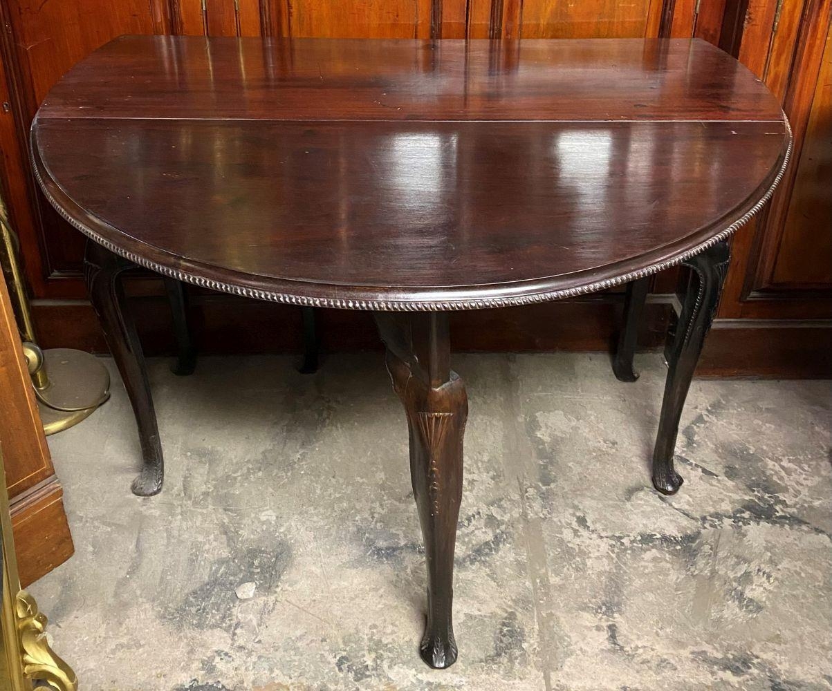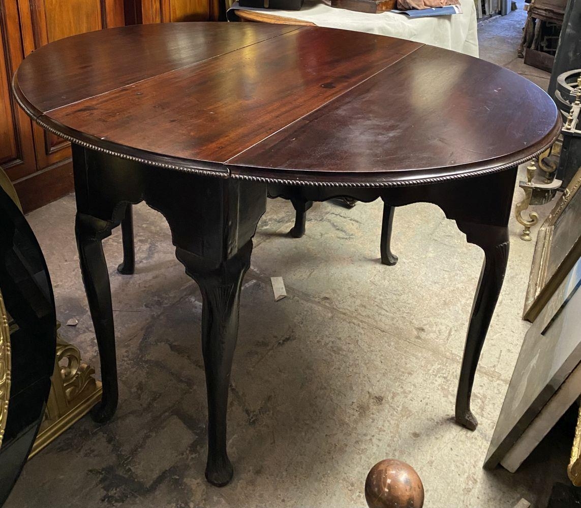 AN 18TH CENTURY MAHOGANY DROP LEAF DINING TABLE, circular top with carved beaded border raised on legs with carving to knee, on carved pad feet. Dimensions: when opened: 126cm wide x 113cm deep x 74cm high approx.