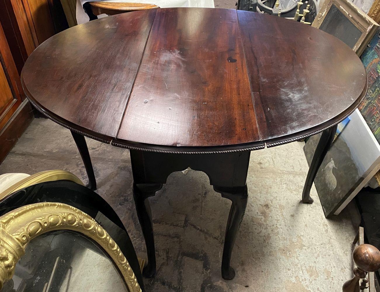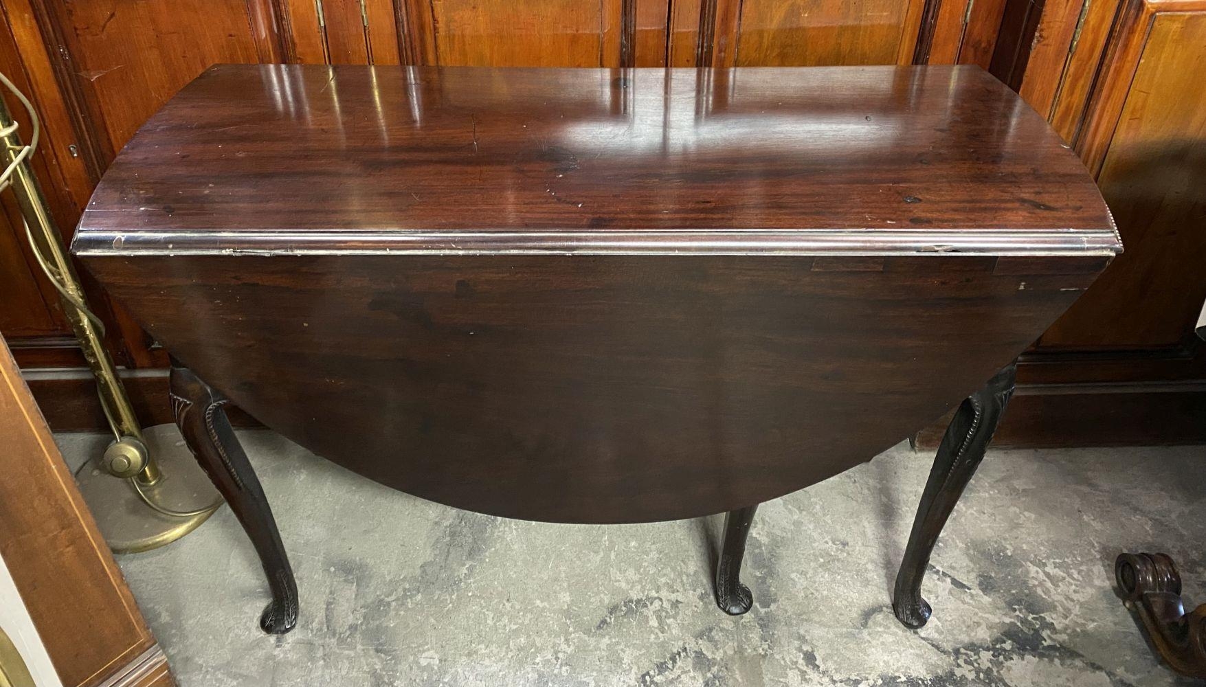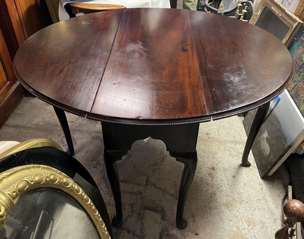 AN 18TH CENTURY MAHOGANY DROP LEAF DINING TABLE, circular top with carved beaded border raised on legs with carving to knee, on carved pad feet. Dimensions: when opened: 126cm wide x 113cm deep x 74cm high approx.