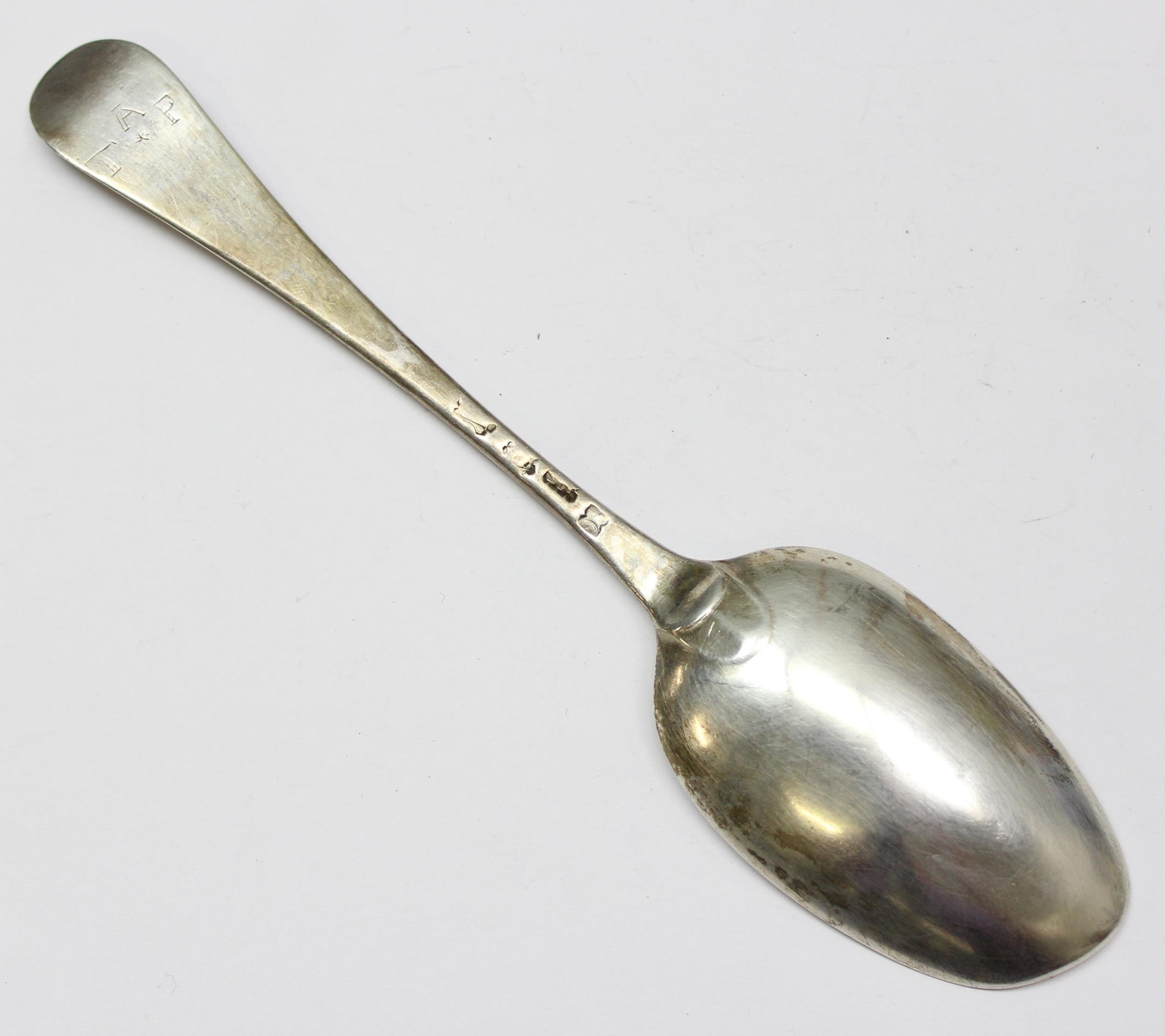 [51.31g] - an early to mid 18th century silver serving spoon, marks rubbed London hallmark for Ebenezer Coker 1739-1748