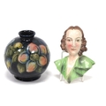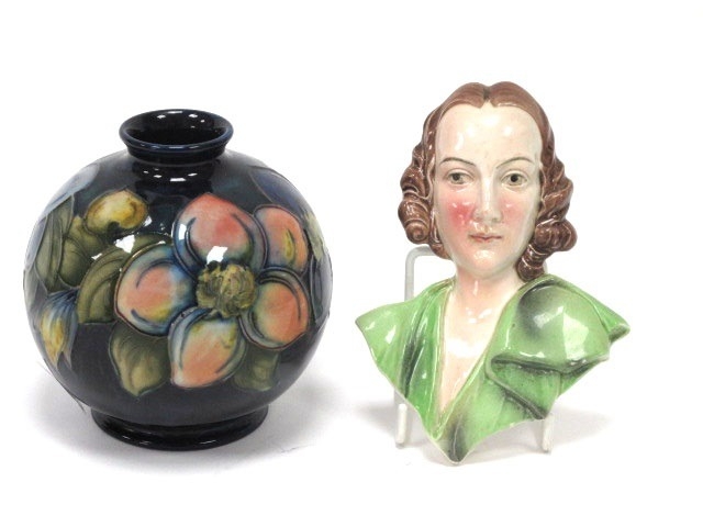 A Moorcroft Pottery Vase, of globular form with short neck, painted in the 'Anemone' pattern against dark blue ground, impressed marks, 11cm high and a small Art Deco Continental wall mask in the form of a lady wearing a green blouse, 12.5cm long. (2)