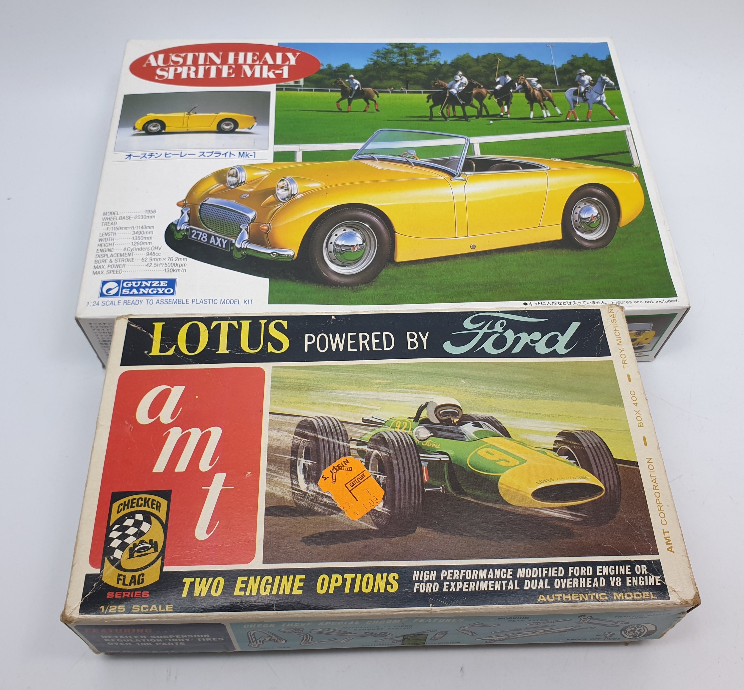 Gunze Sangyo 1:24 scale model car kit 'Austin Healy Sprite MK-1' and other model kirs and part kits.