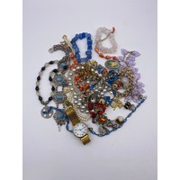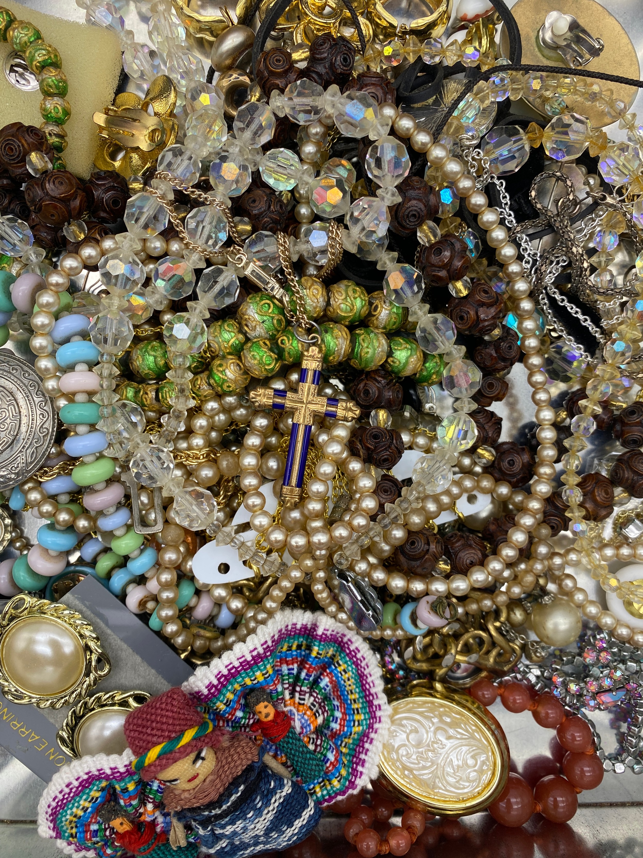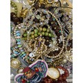 SELECTION OF GLASS AND BEAD NECKLACES, SIMULATED PEARL CHOKERS, SELECTION OF CLIP ON DRESS EARRINGS
