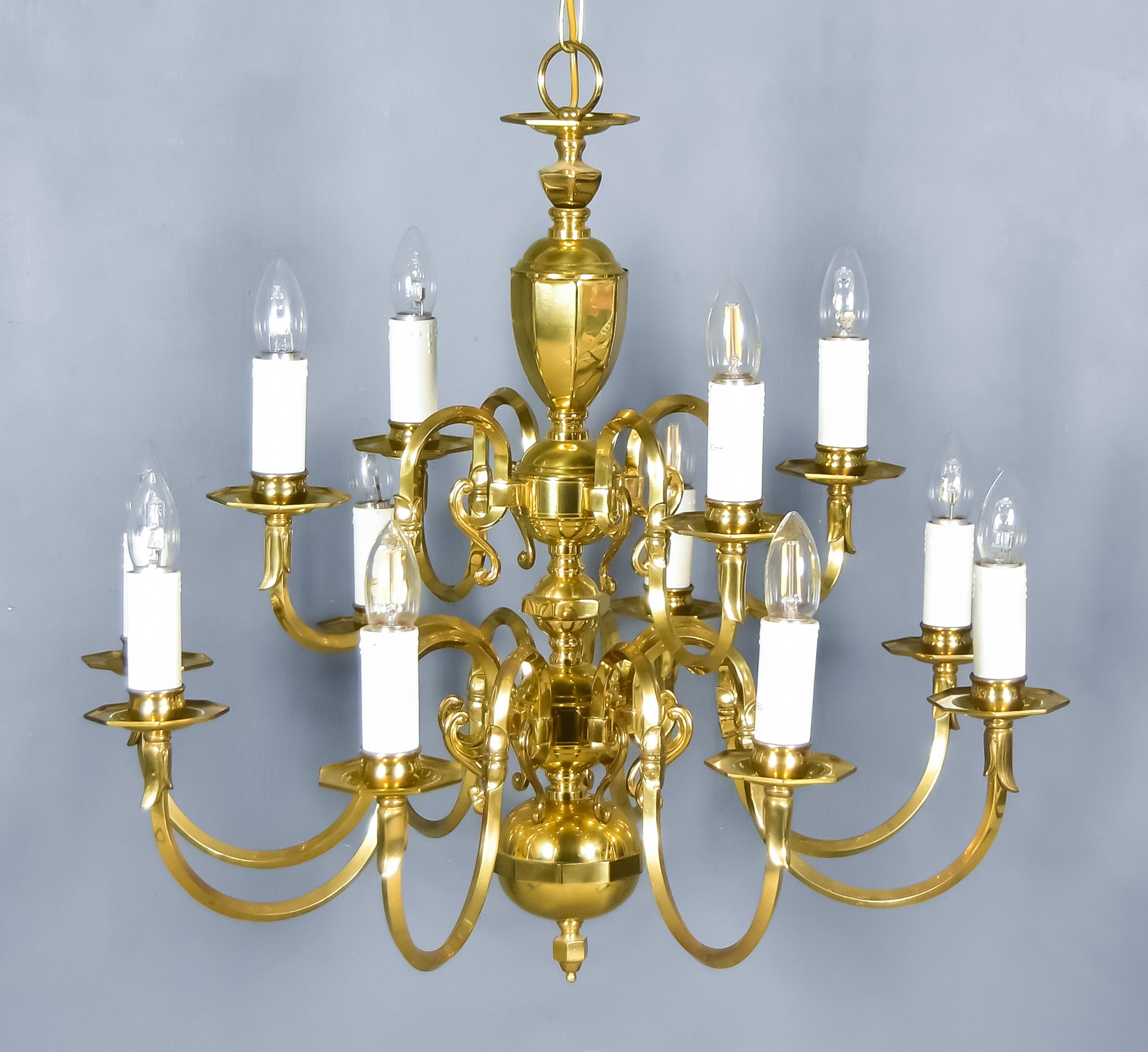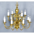 A Pair of Brass Electroliers of Dutch 17th Century Design, the knopped columns with scroll branches terminating in candle fitments, 27ins diameter x 23ins high