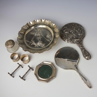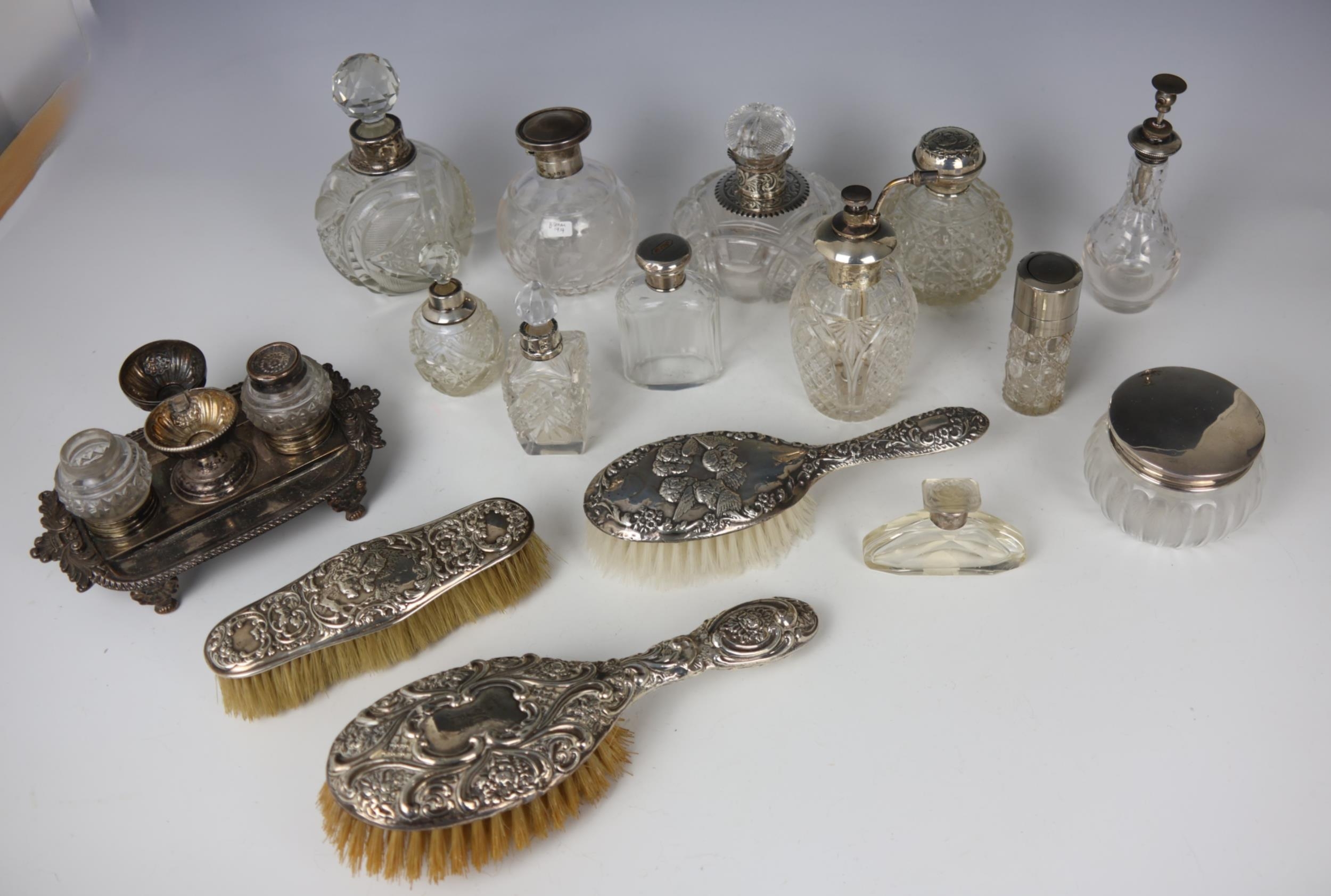 A large selection of 19th/20th century silver mounted dressing table jars, of various shapes and sizes, including examples with embossed silver collars, with silver mounted dressing table part set, a silver plated desk tidy and further silver and silver plated pieces (qty) (at fault)