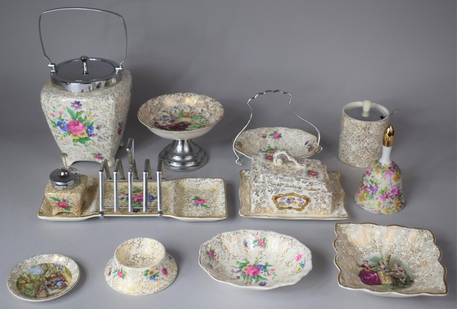 A Collection of Mid/Late 20th Century Chintz Pattern China to Include Silver Plated Lidded Biscuit Barrel, Butter Dish on Stand, Various Cruets, Pots, Toast Racks etc