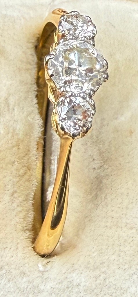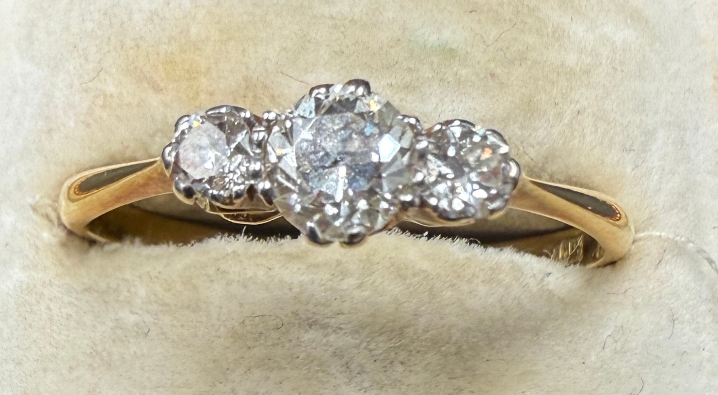 A three stone diamond ring set in 18 carat gold and platinum. Size S. Weight 2gm.