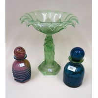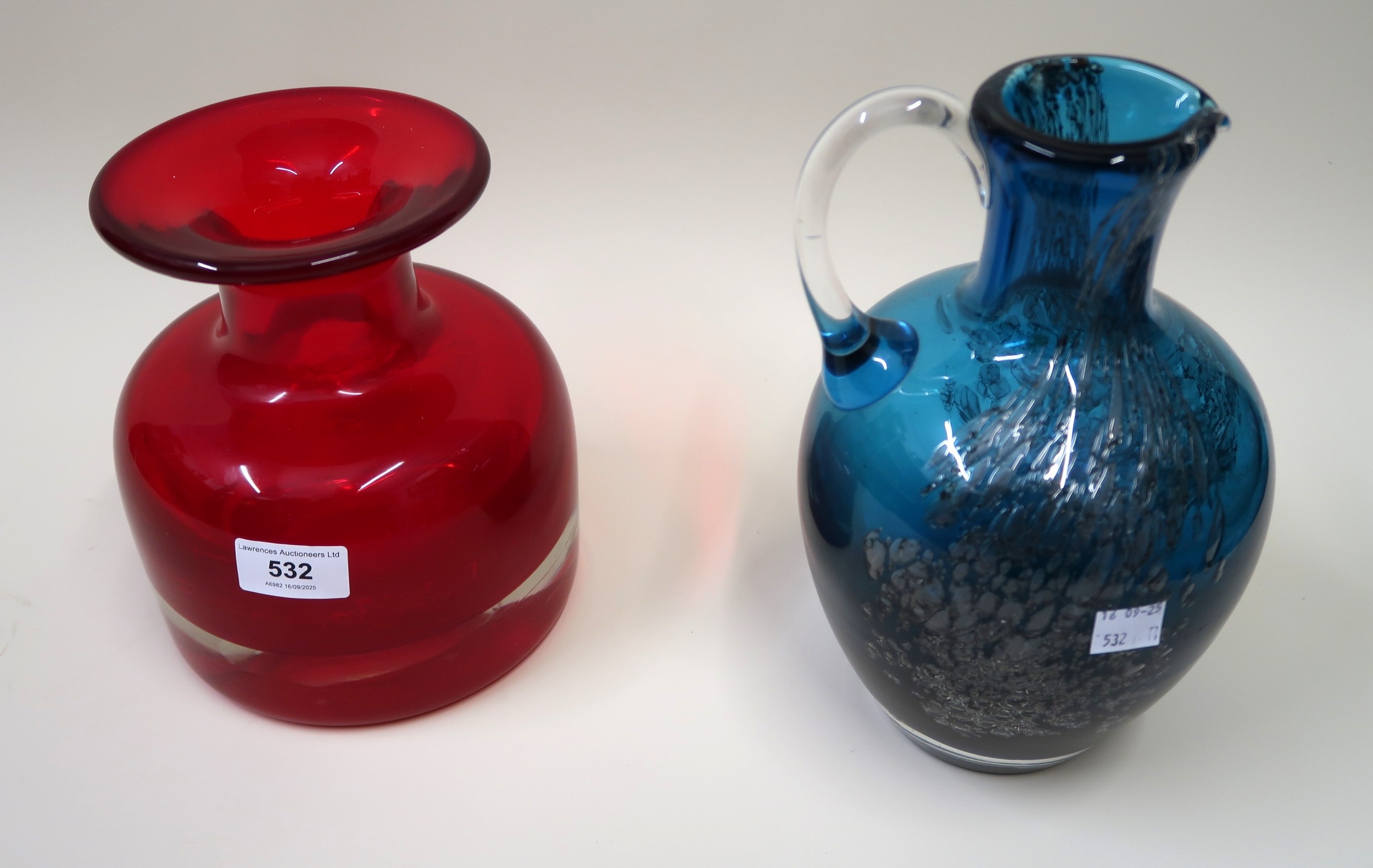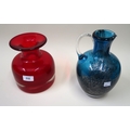 Swedish mid Century red glass vase, 19cm tall, together with a blue art glass jug, 25cm tall