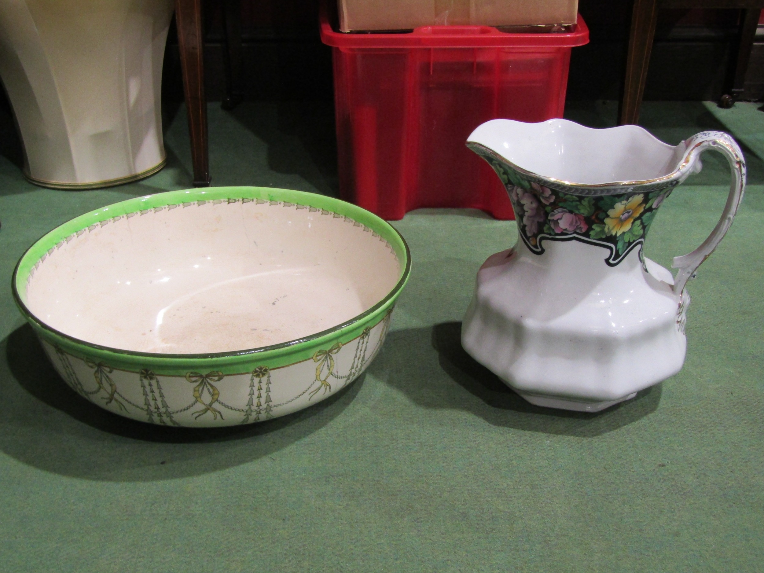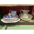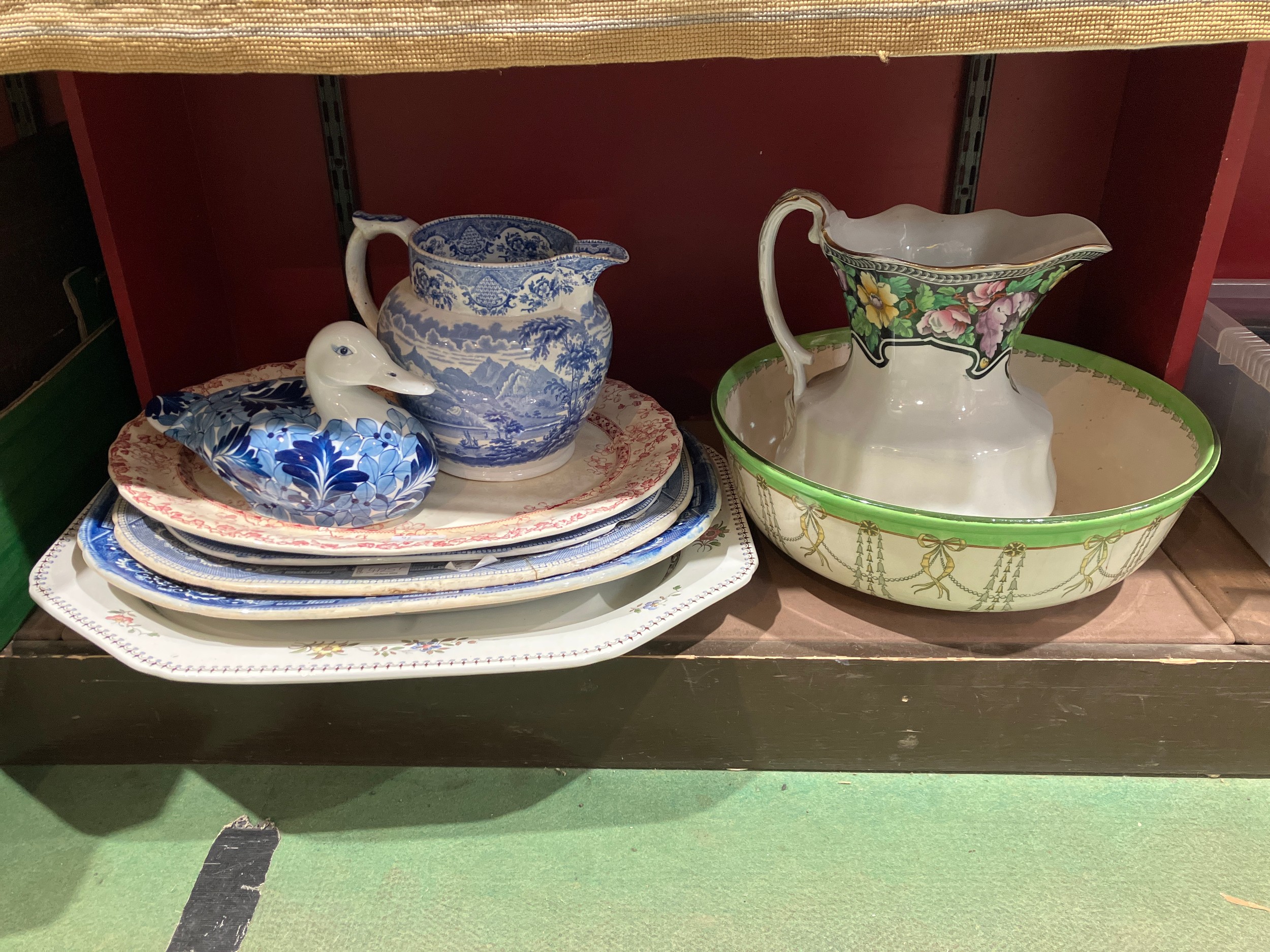 Blue and white meat plates, ceramic duck, jug, wash bowl and wash jug etc. Some a/f