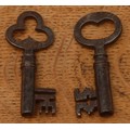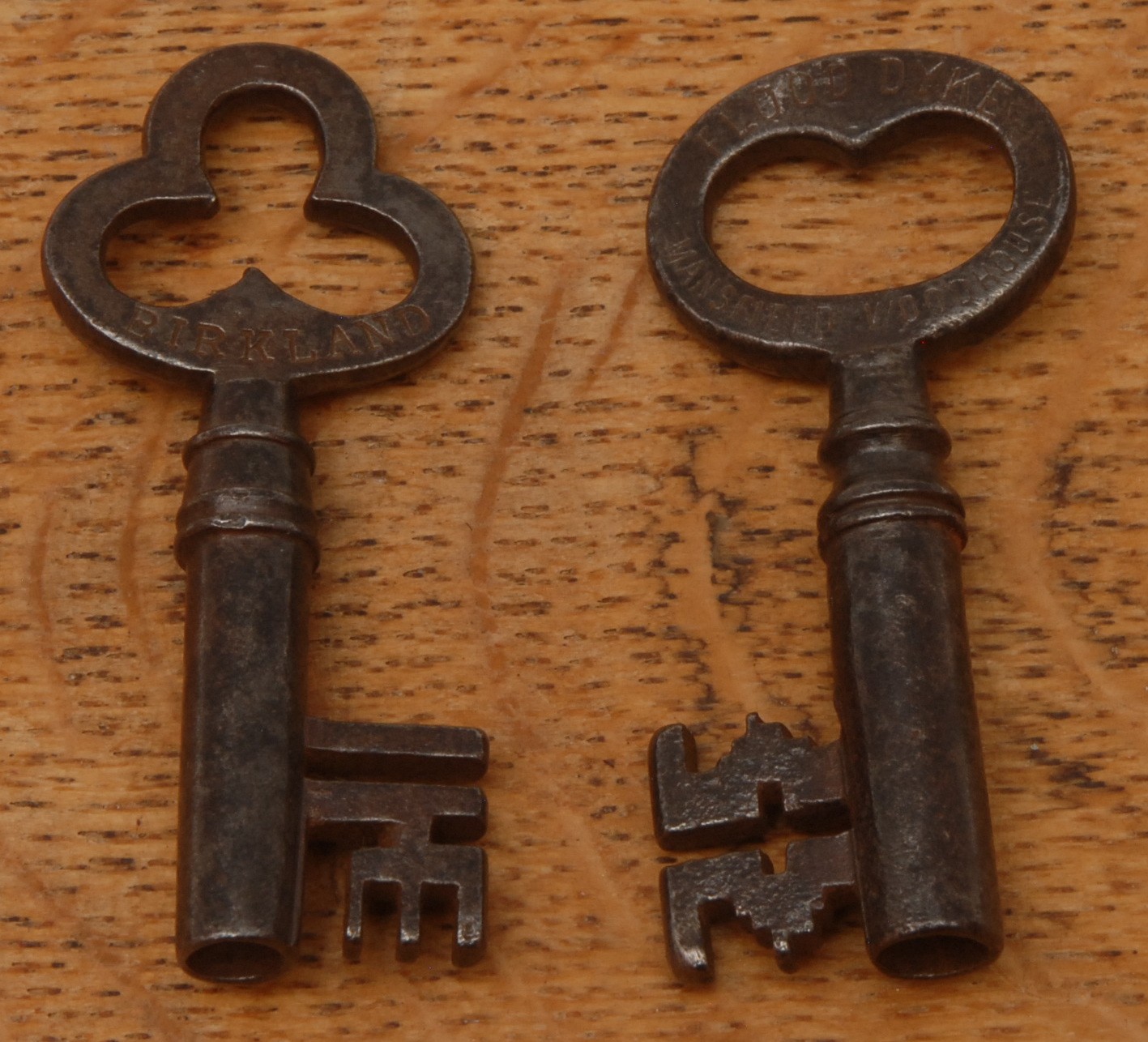 Copoclephily - Nottinghamshire - a 19th century steel country house estate key, the bow inscribed Flood Dyke, Mansfield Woodhouse, 6cm long; another, the Gothic Revival bow pierced with a tracery trefoil and inscribed Birkland, 6.5cm long (2)