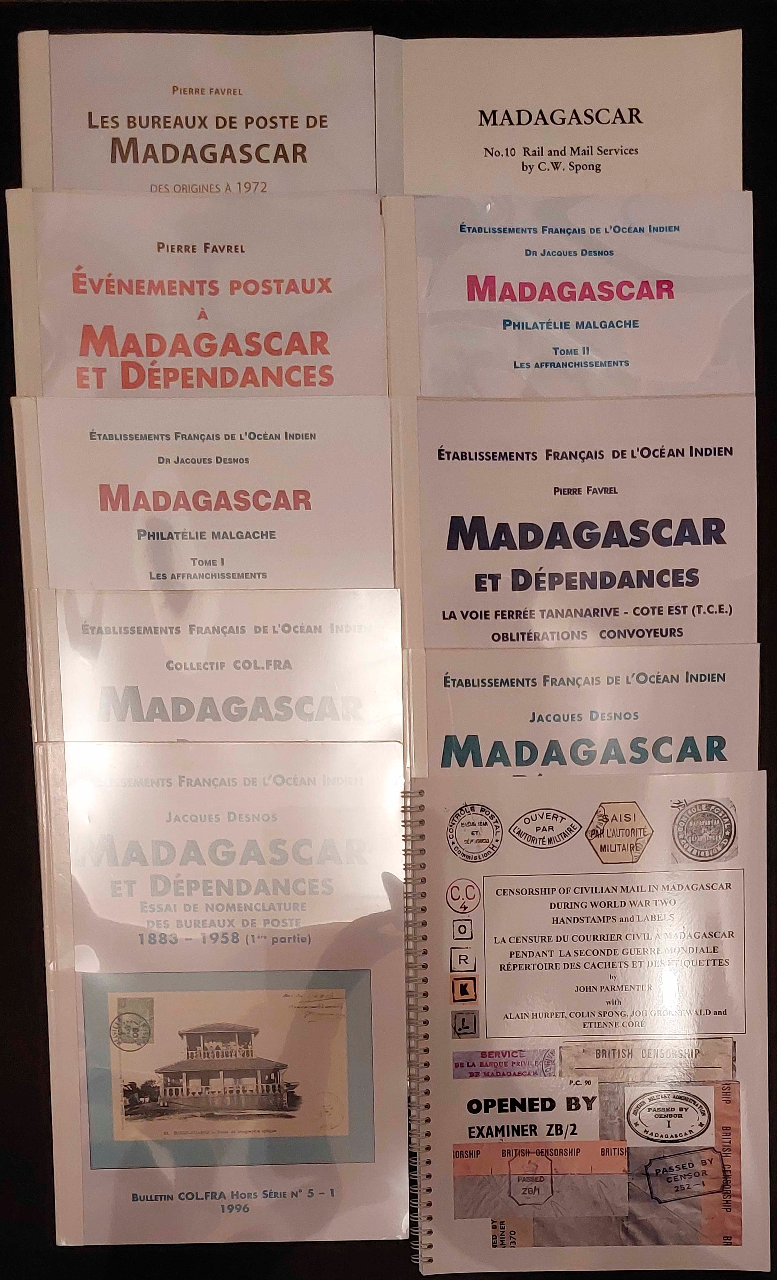MADAGASCAR SELECTION: Eight softbound publications by Col.Fra on various aspects of Madagascar; in French. Also Madagascar Rail and Mail Services by Spong (2003); and Civilian Censorship During World War Two by Parmenter et al. (10) Cross Reference: MADAGASCAR, MILITARY - CENSORED MAIL, MILITARY - WWII