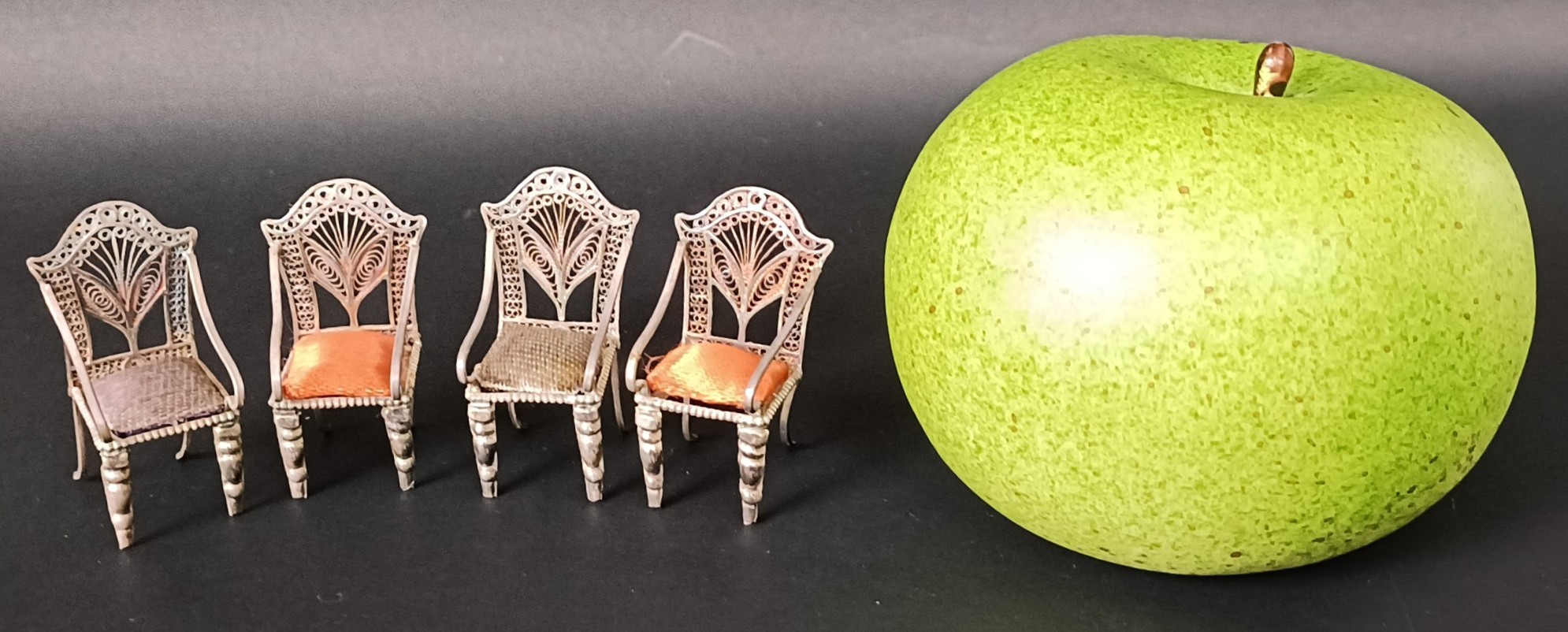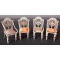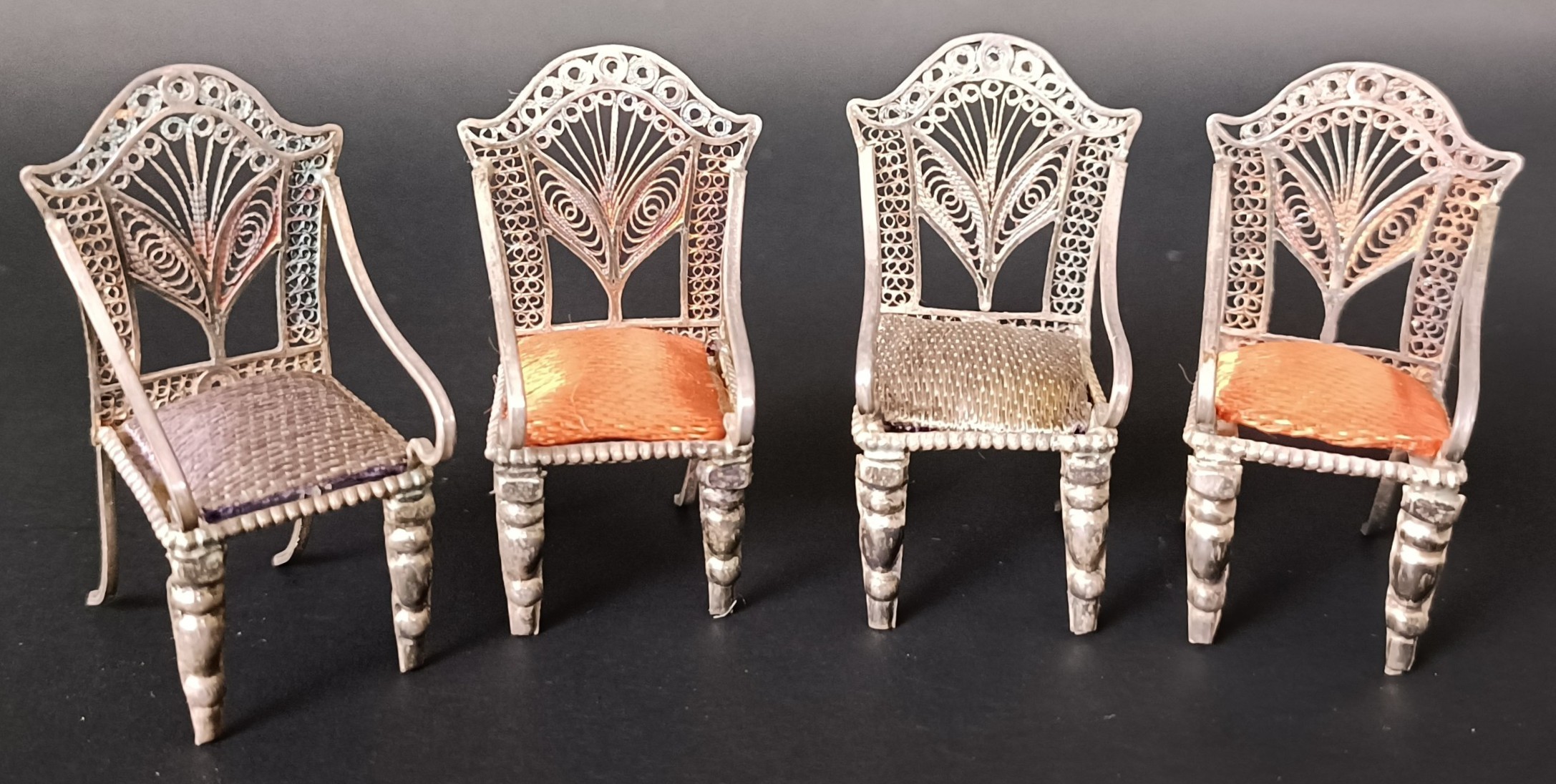 A set of four silver coloured metal Continental miniature armchairs, with silk padded seats