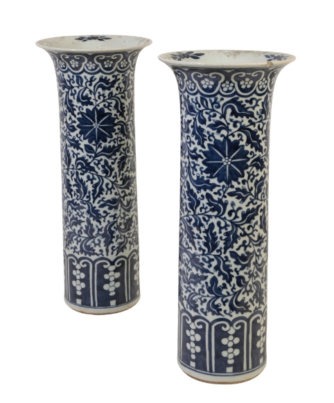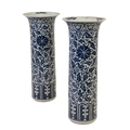A PAIR OF CHINESE BLUE AND WHITE "SLEEVE" VASES in the Kangxi style, with flared rims and cylindrical bodies decorated with blossoming foliage, over a panelled lower border, 45.5cm high