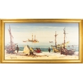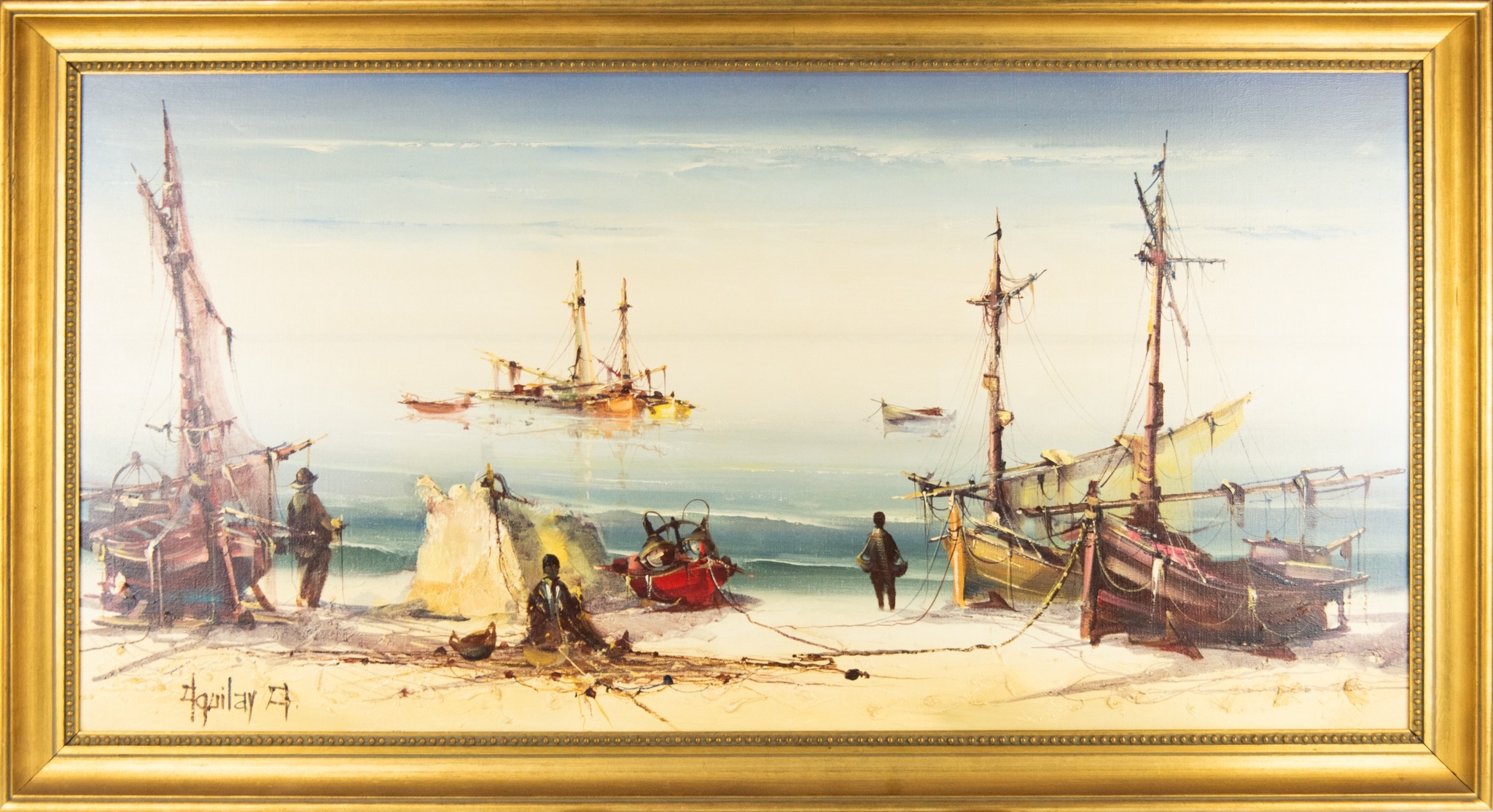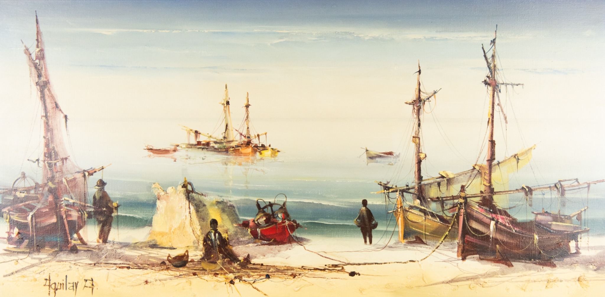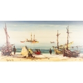 Coastal scene with figures and beached boats