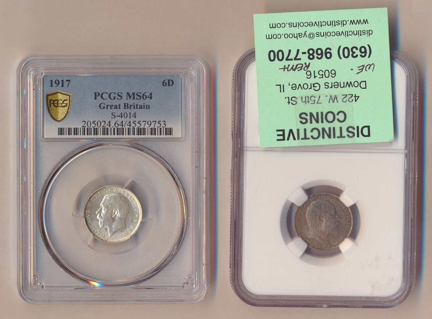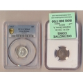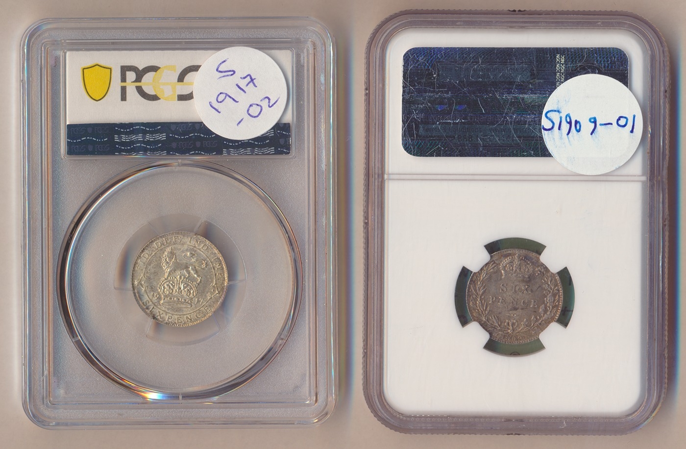 Range of sixpences in plastic holders with NGC 1787 no hearts AU55, 1909 MS61, 1923 MS64, PCGS 1917 MS64, 1927 new reverse proof PF66, 1937 proof PF65, CGS UK 1907 EF75, 1925 thin rim UNC80, 1945 UNC85, 1947 UNC85, 1948 UNC85, 1949 UNC85 and 1951 UNC85. Qty 13 (T)