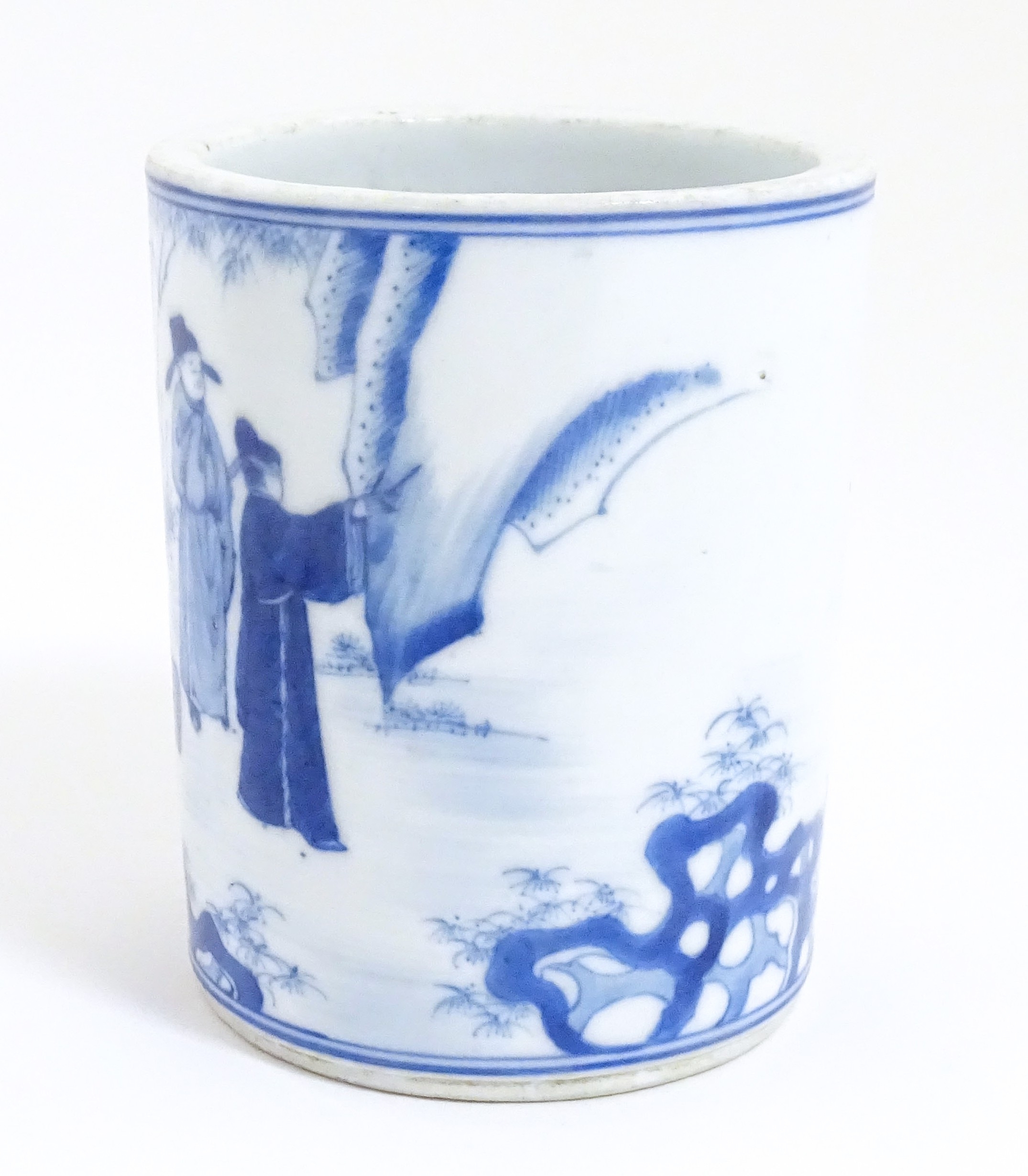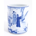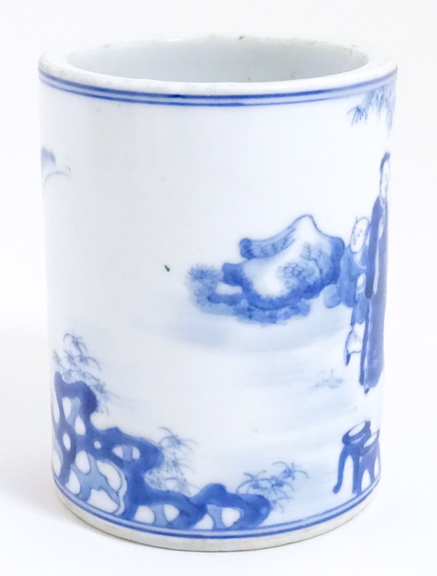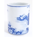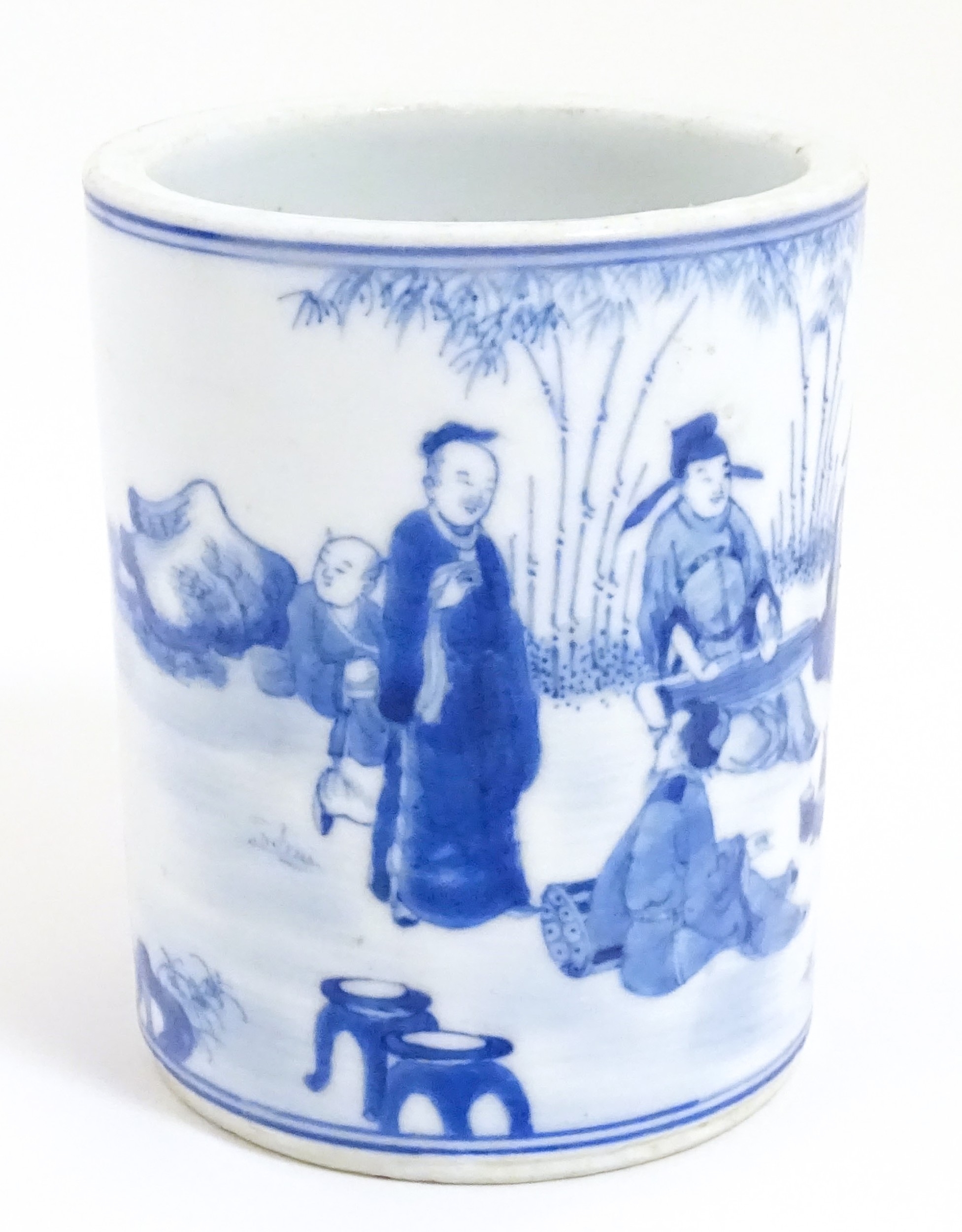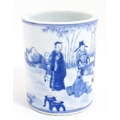 A Chinese blue and white brush pot decorated with figures in a garden landscape. Approx. 4 3/4" high