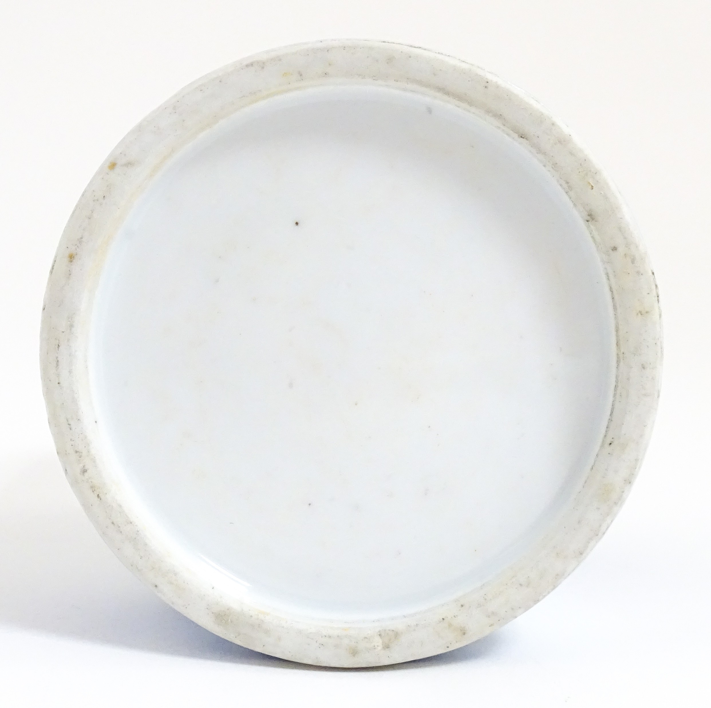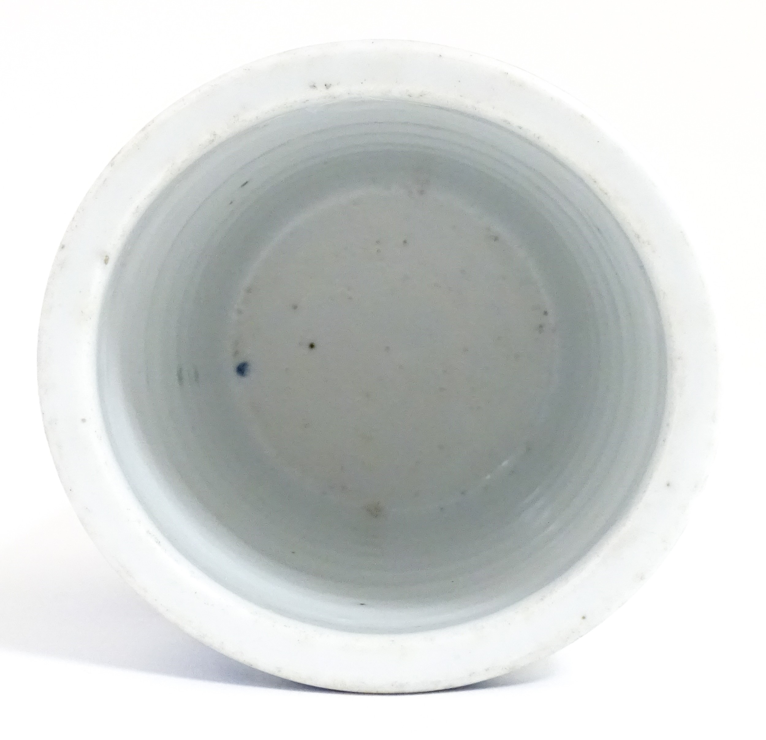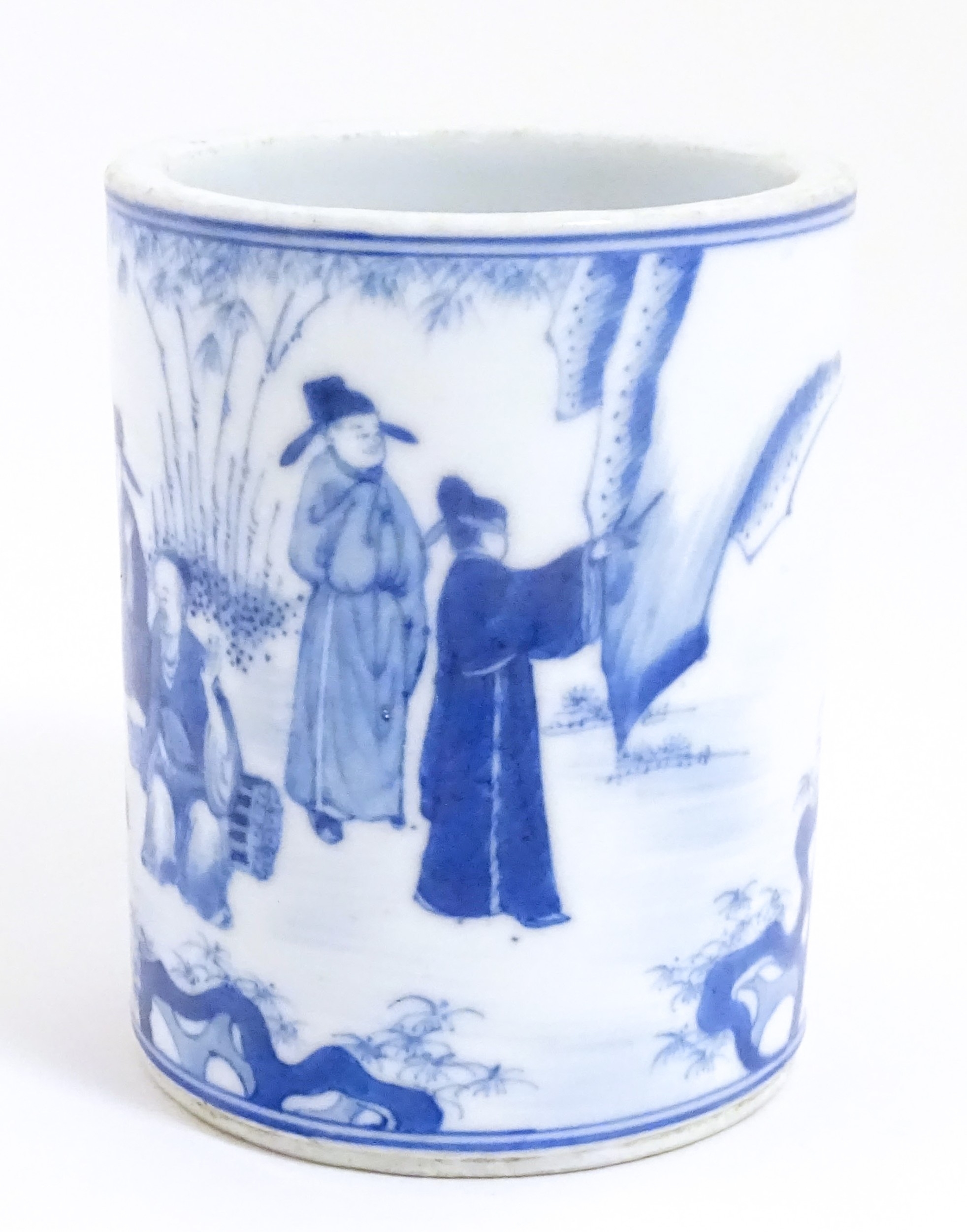 A Chinese blue and white brush pot decorated with figures in a garden landscape. Approx. 4 3/4" high