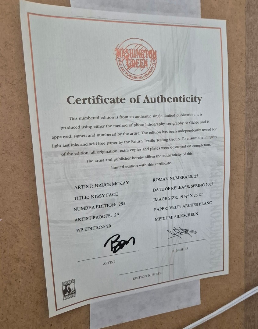 BRUCE MCKAY. KISSY FACE. silkscreen on velin arches blanc, framed and glazed, edition 79/295, signed bottom right, 66 x 49 cm.