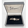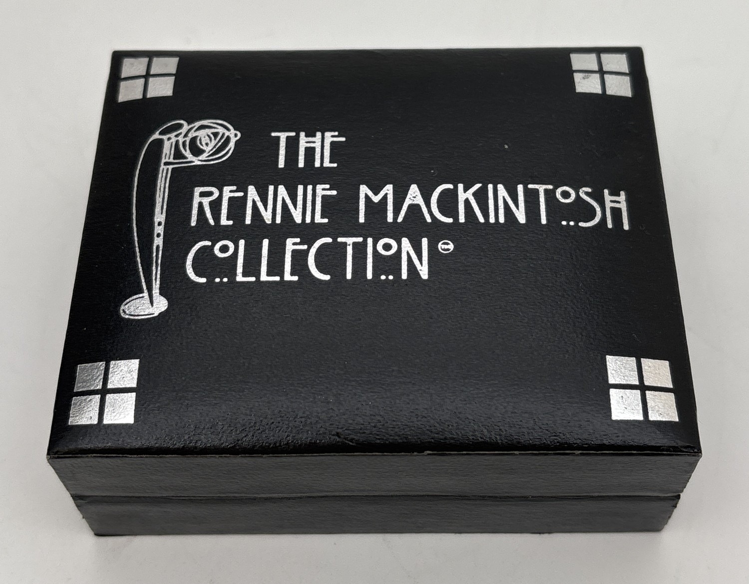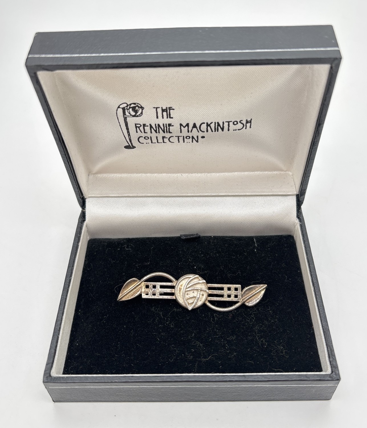 A boxed silver bar brooch with stylized rose and leaf decoration from The Rennie Mackintosh Collection. Makers mark and 925 stamped to back. Approx. 5cm long.