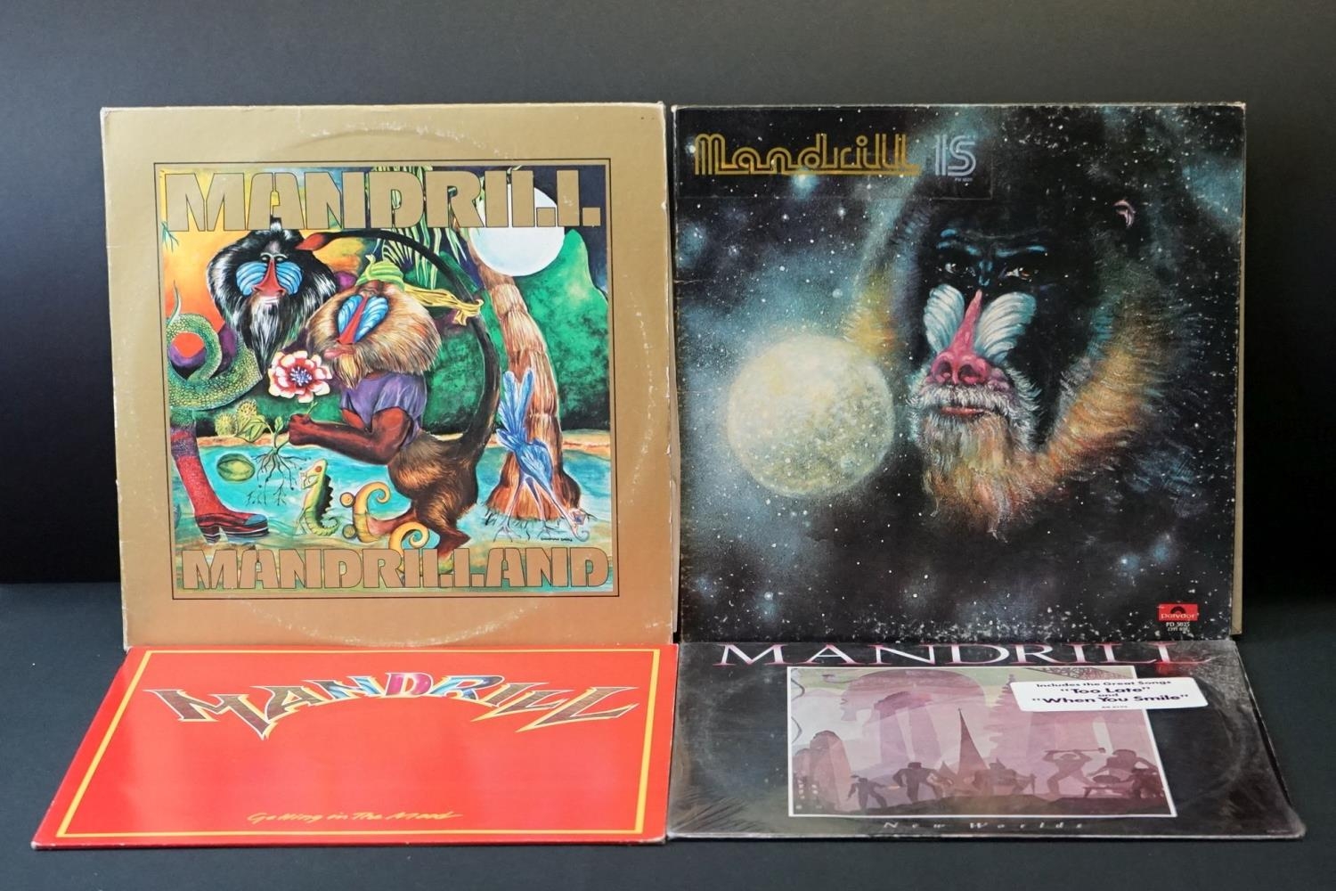 Vinyl - Mandrill - 4 Original pressing albums. “Is” (1972, UK, Polydor, PD 5025) VG+ / EX+ (Appears Unplayed). Mandrilland (1974 USA, Double album, Polydor PD2-9002) VG+ / Both albums EX (Appear Unplayed) + printed Inners. New Worlds (1978 USA, Arista, AB 4195) EX (Still in shrink), EX (Appears Unplayed) + Printed inner. Getting In The Mood (1980 USA, Arista, AL 9527) EX / EX + Printed inner