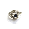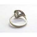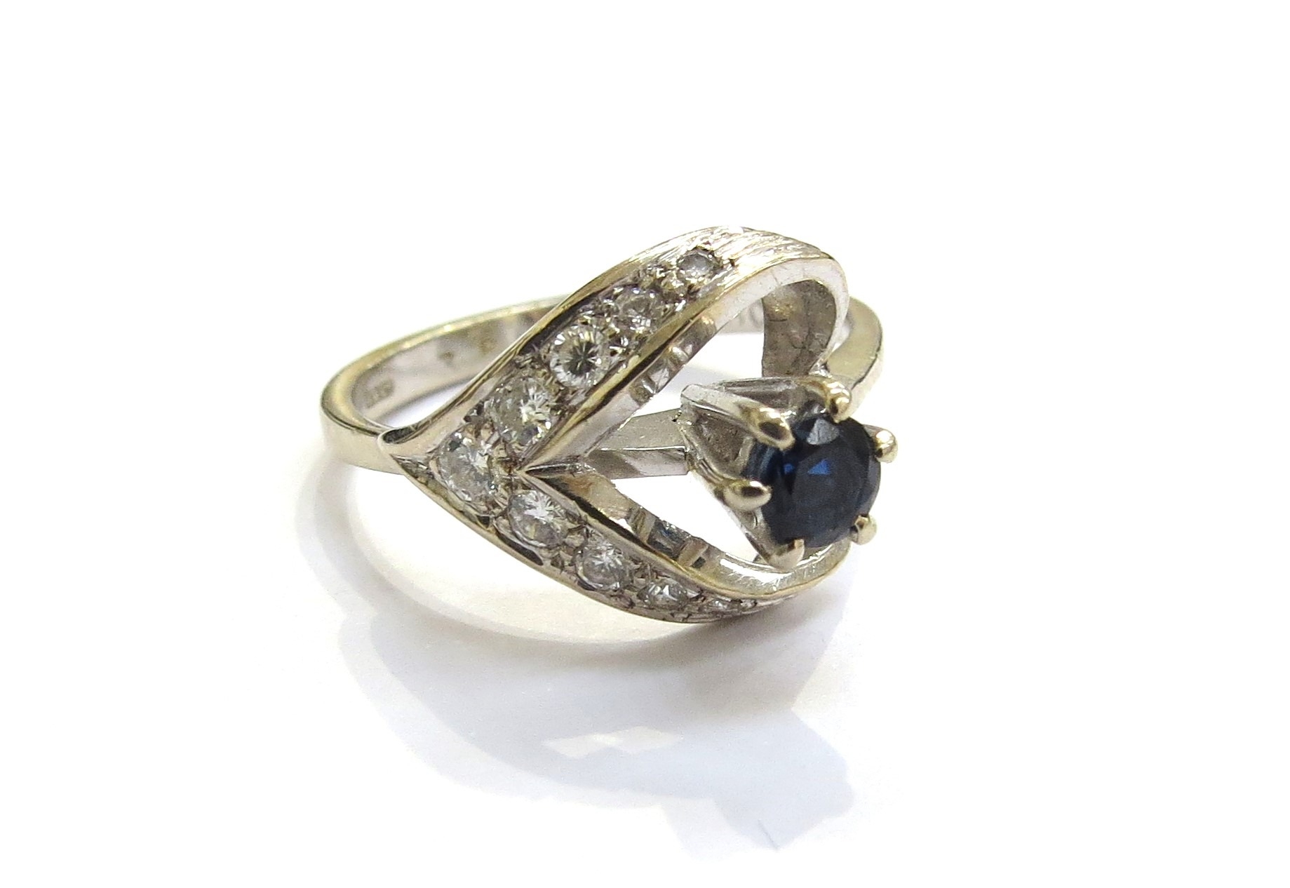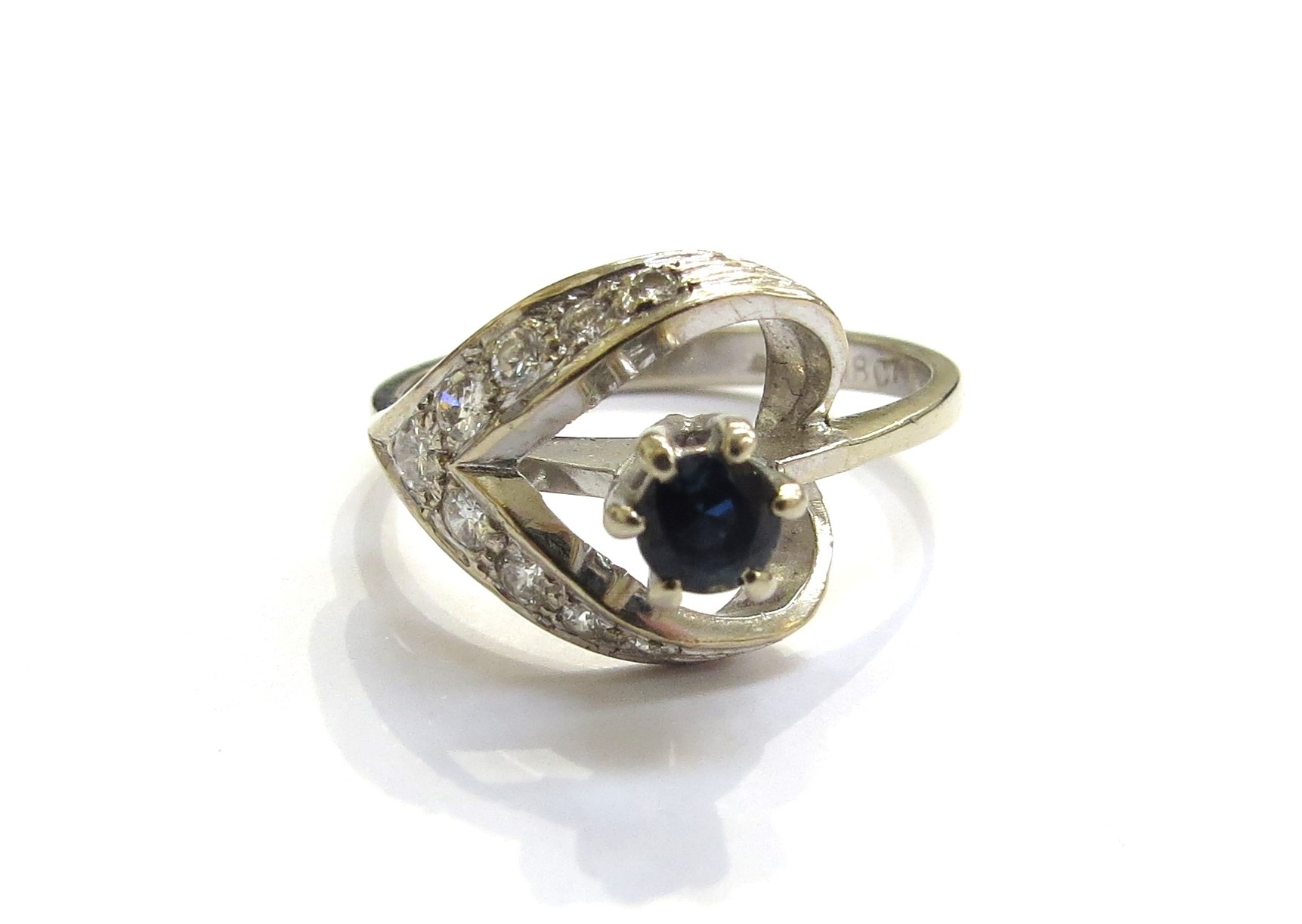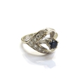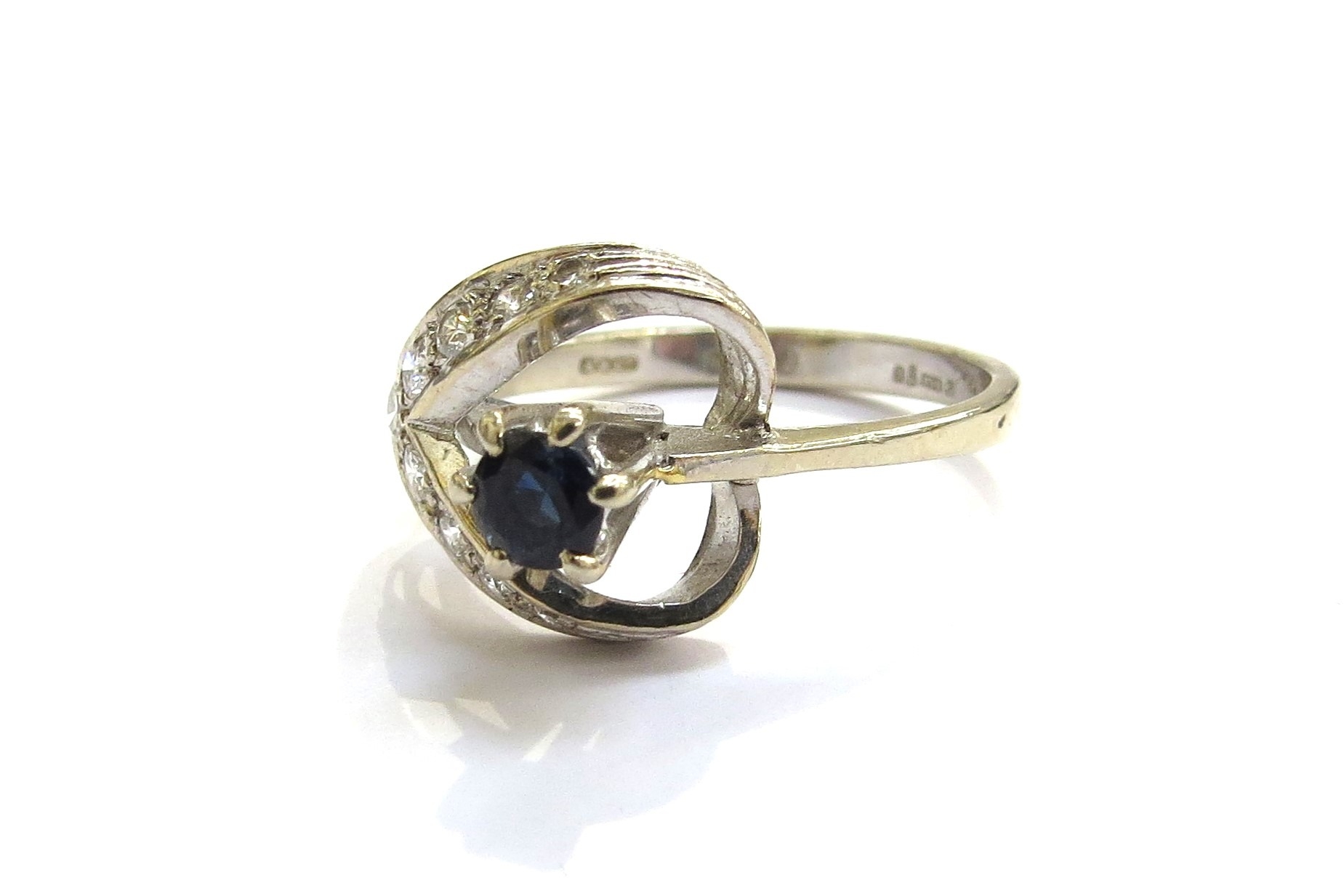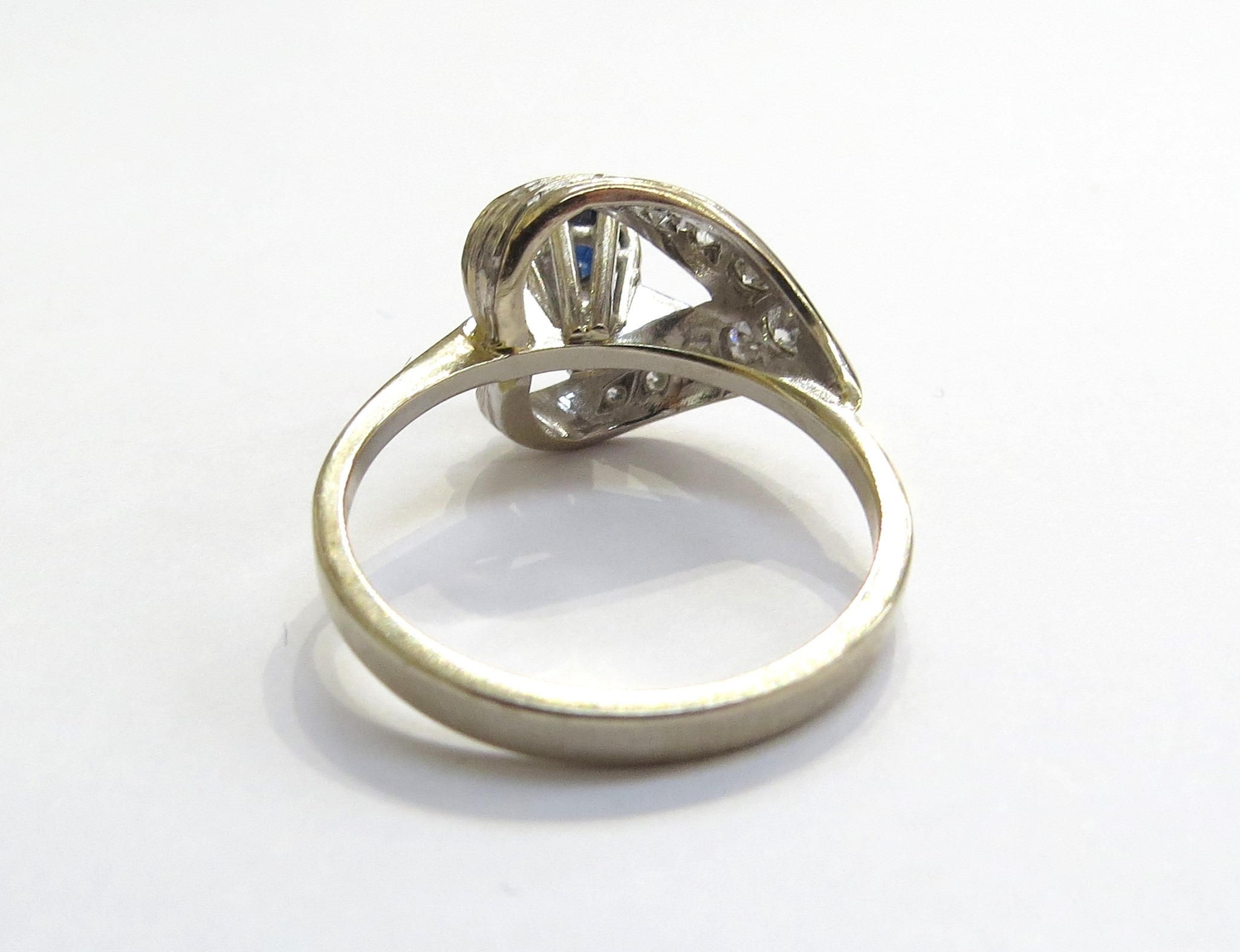 An 18ct white gold ring set with a sapphire to centre in high claw mount framed by two diamond sweeps. Size O/P, 4.2g