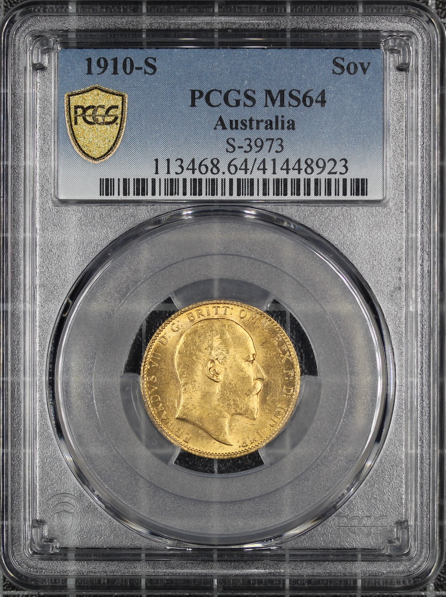 Australia, 1910-S Sovereign, Edward VII (S.3973). Sydney mint issue graded PCGS MS64. A superb example with just two examples recorded higher across both graders.