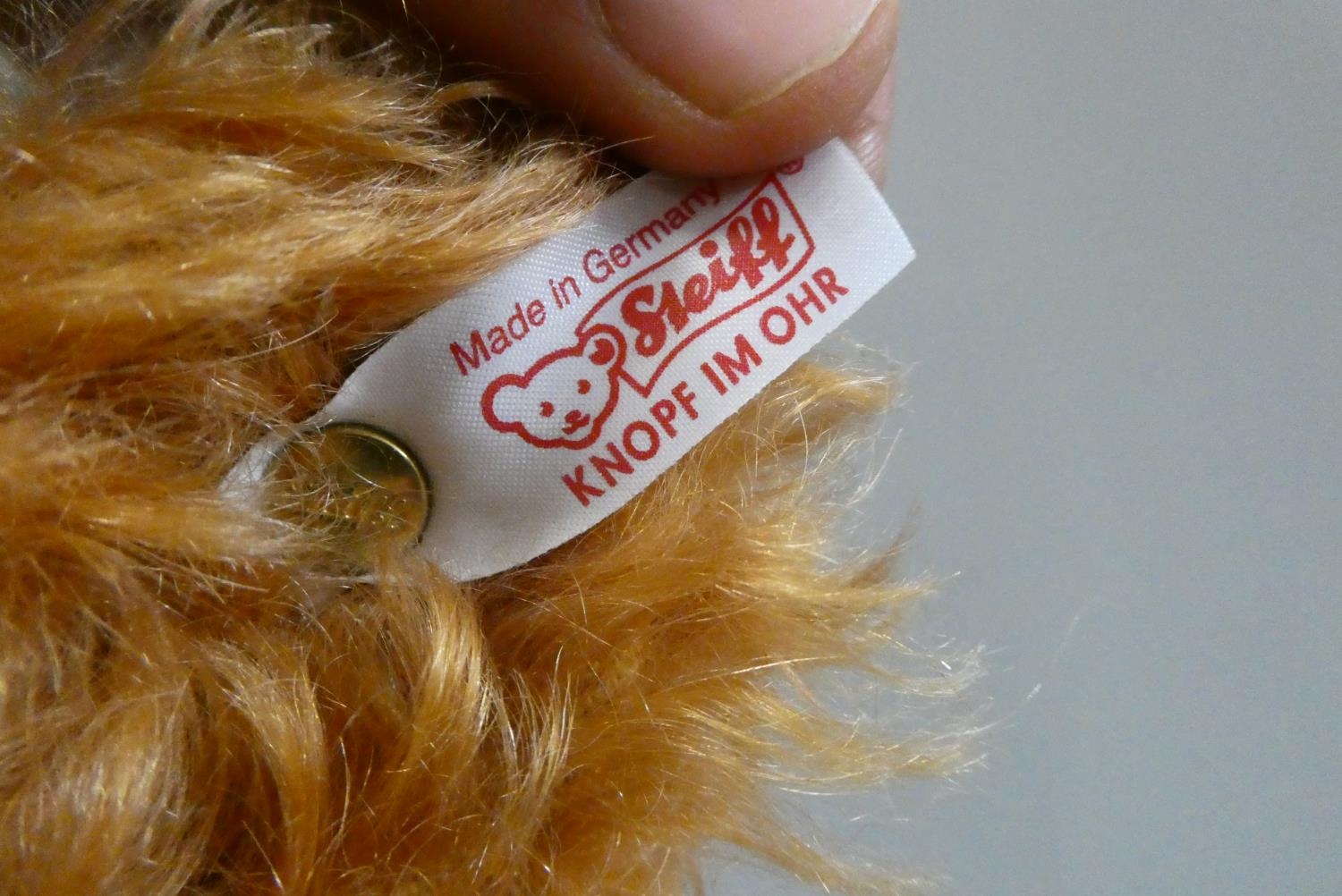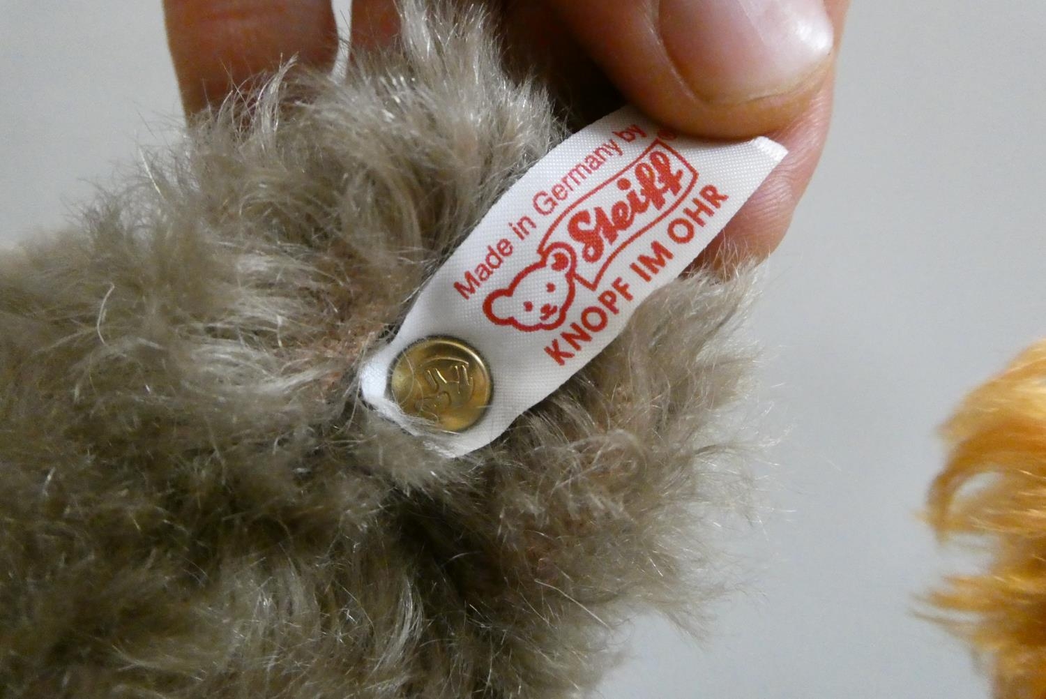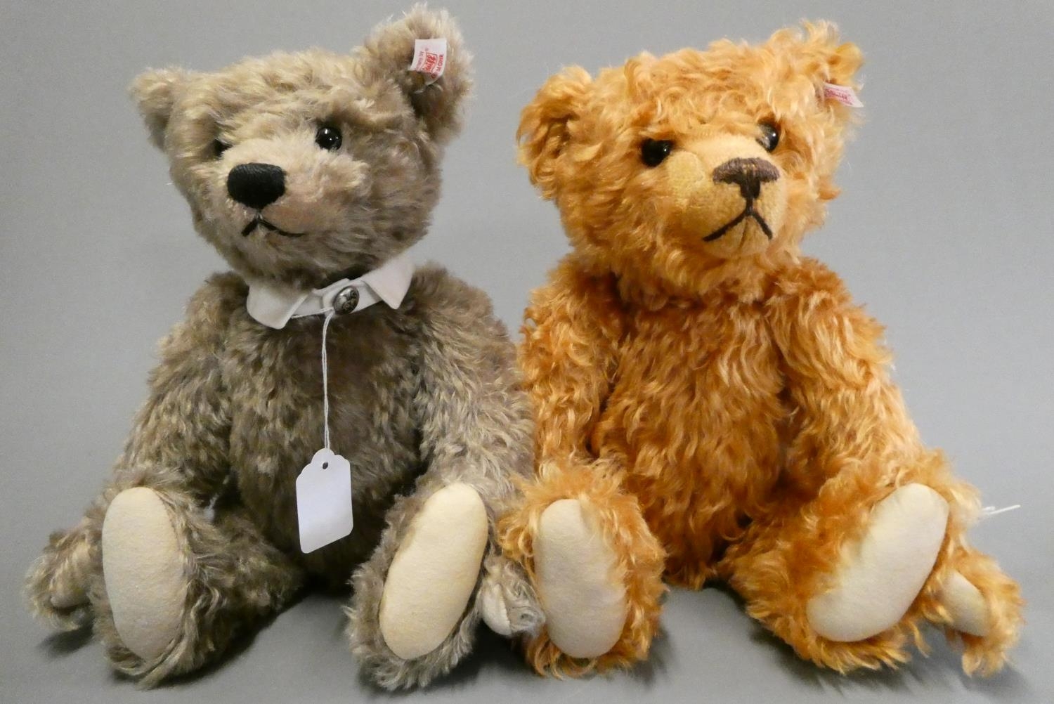 Two Steiff collector's growling teddy bears, comprising a 15 1/2" auburn bear, and a 15" grey bear in a dress collar, both with felt pads, ear studs and labels