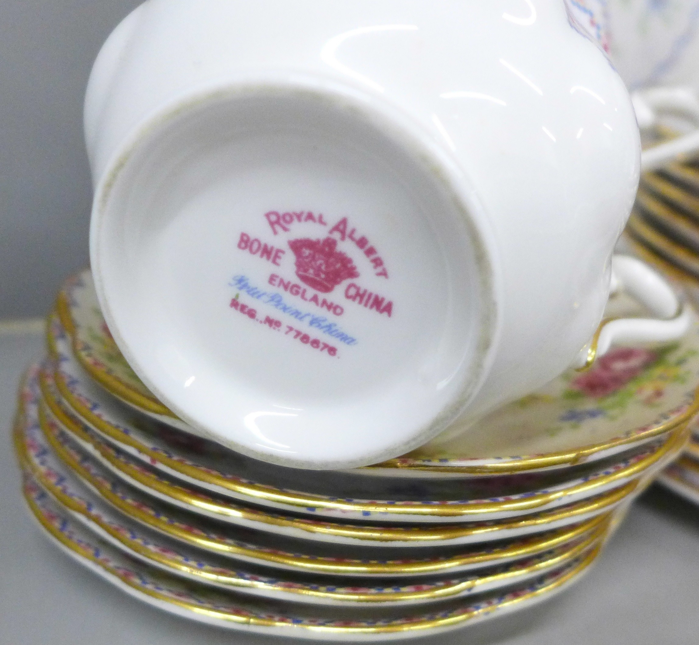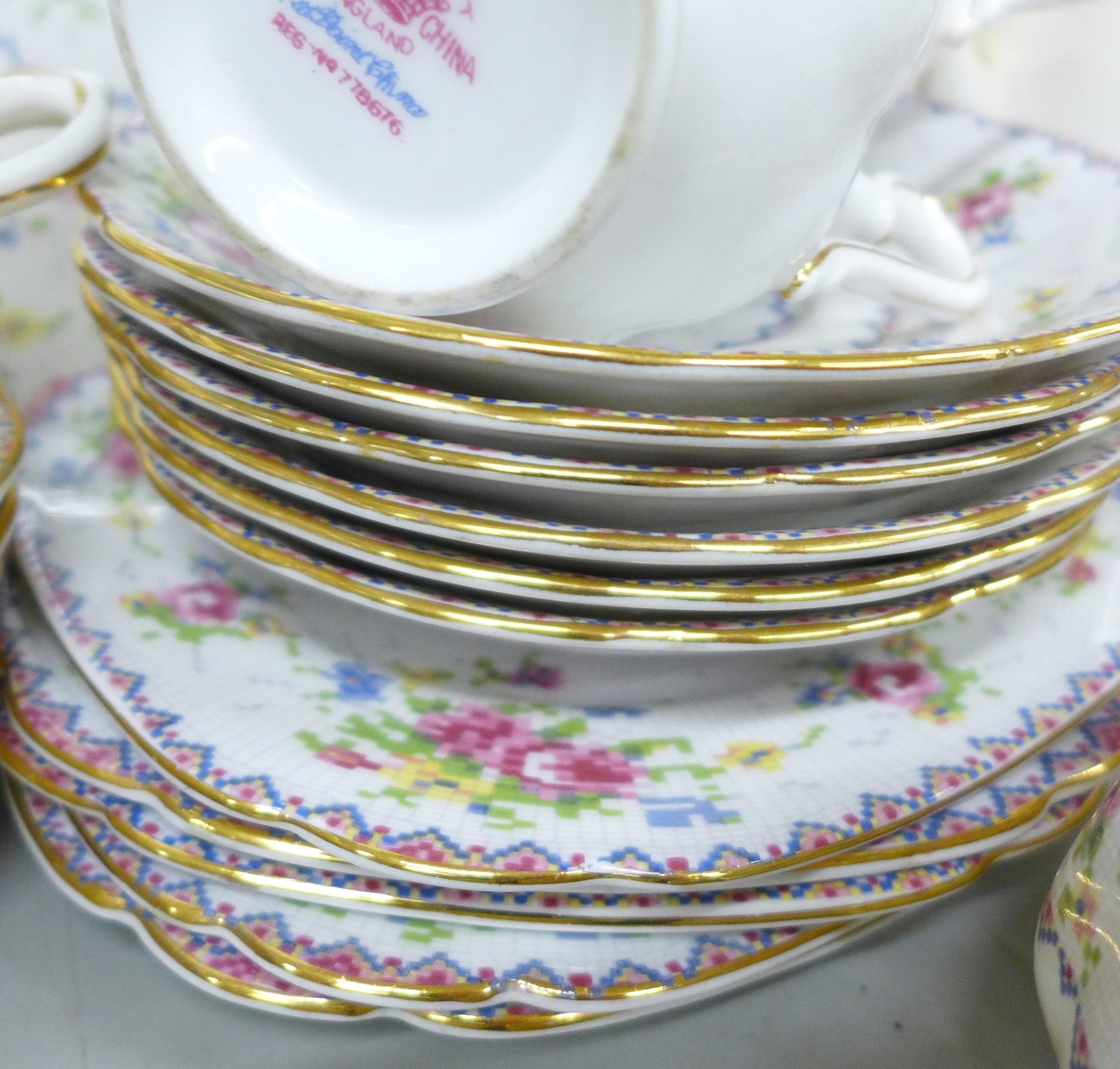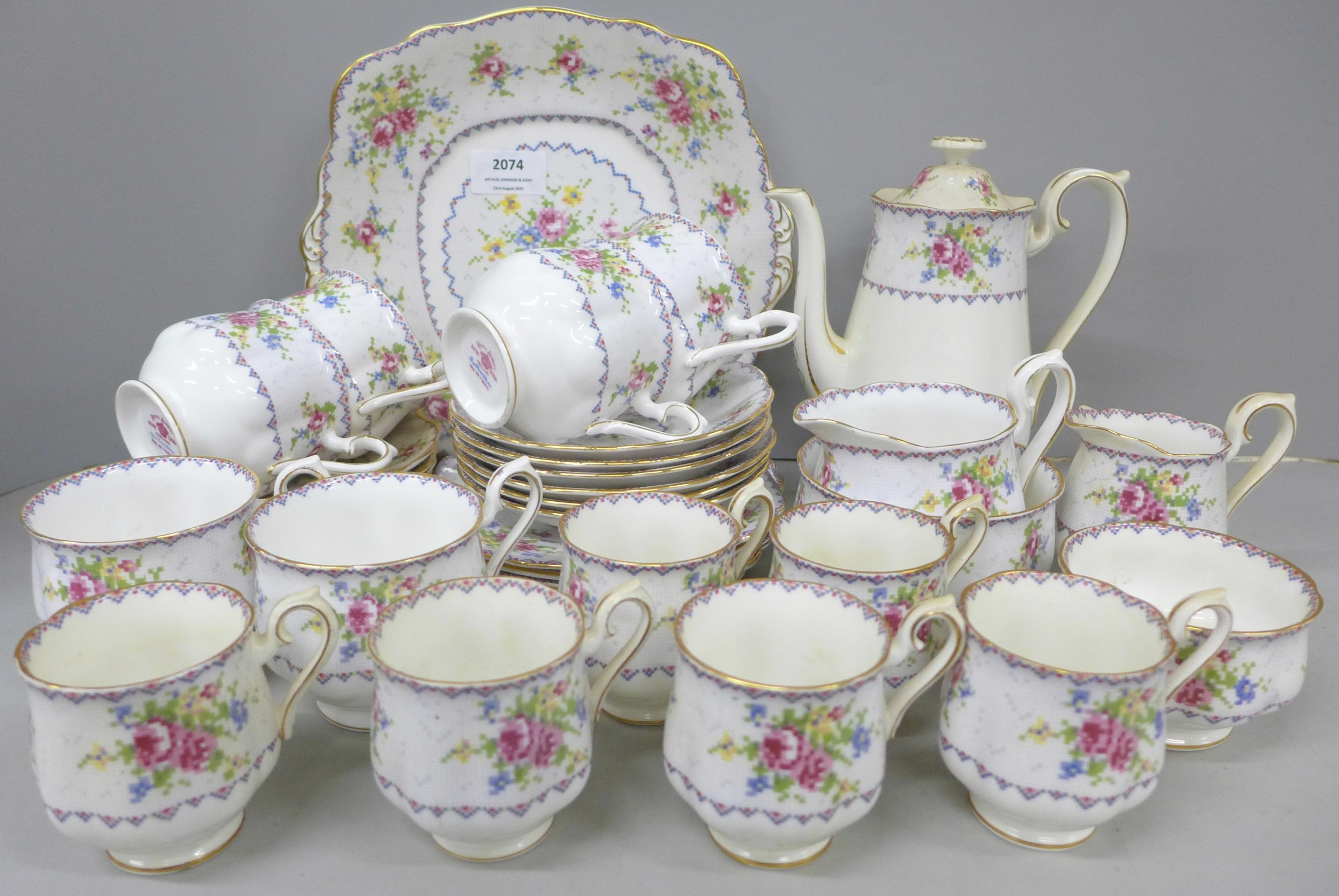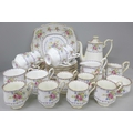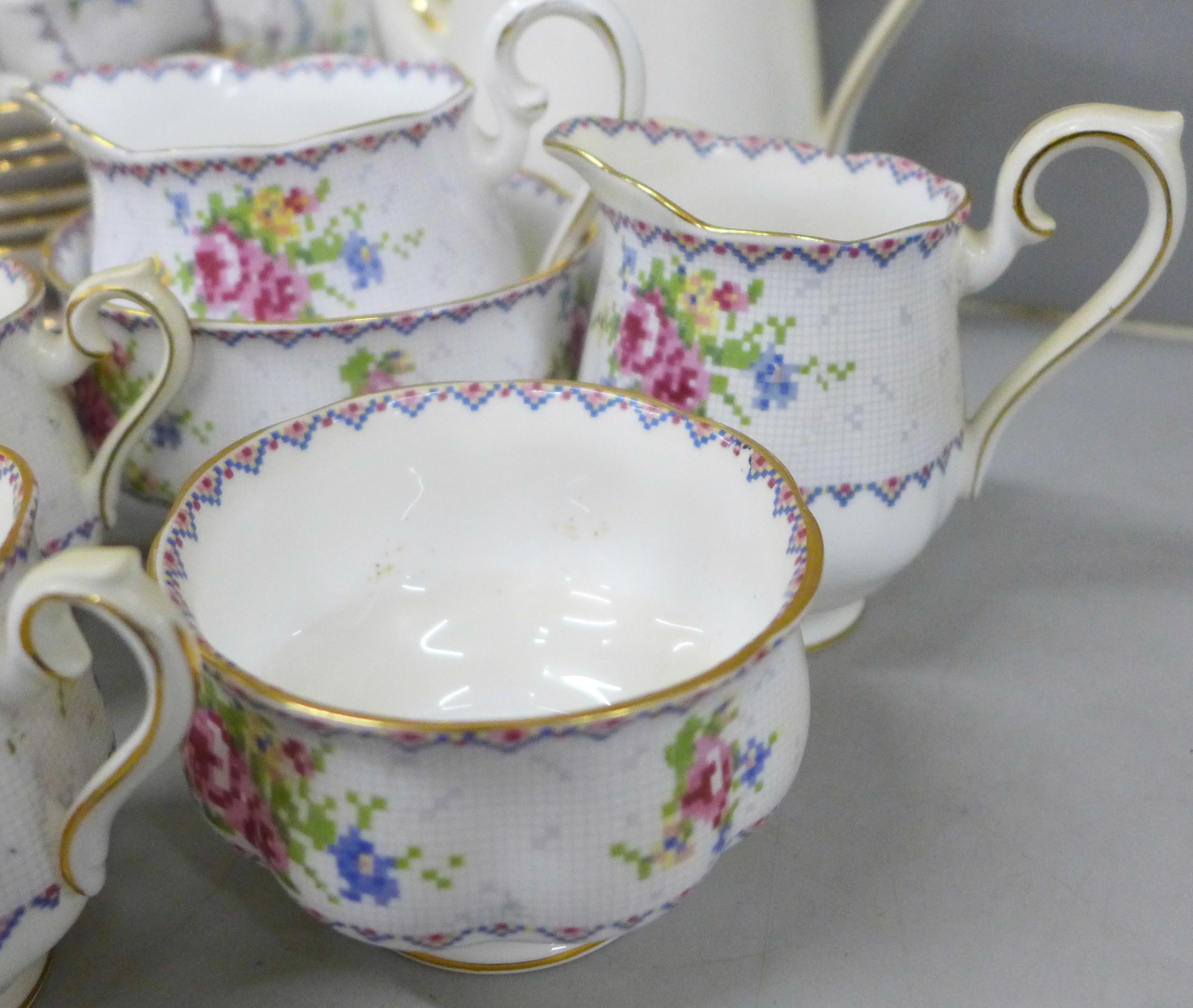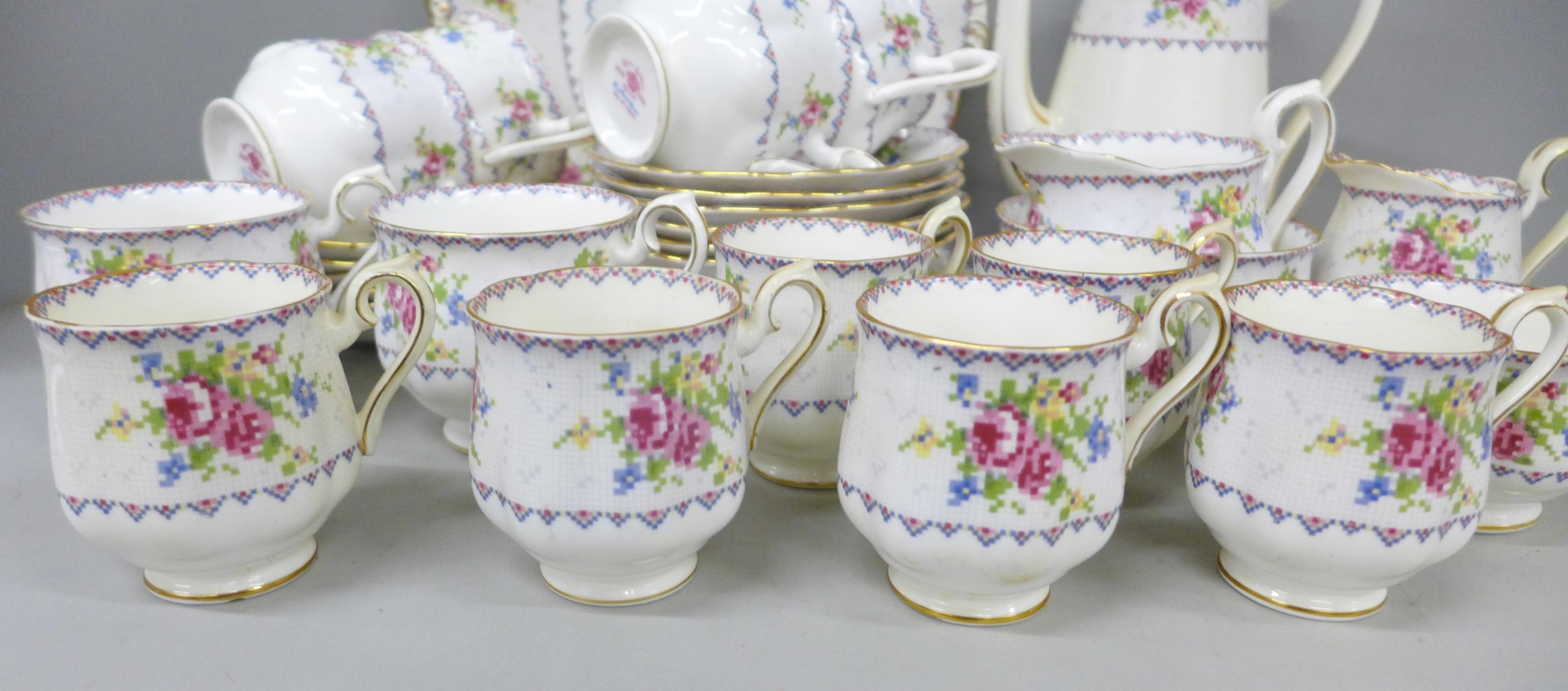 A Royal Albert Petit Point Chintz coffee service, six setting with coffee pot, cream and sugar, also six tea cups and saucers, cream, sugar and one large plate, only five side plates, 35 pieces in total *Not for Posting and Packing*