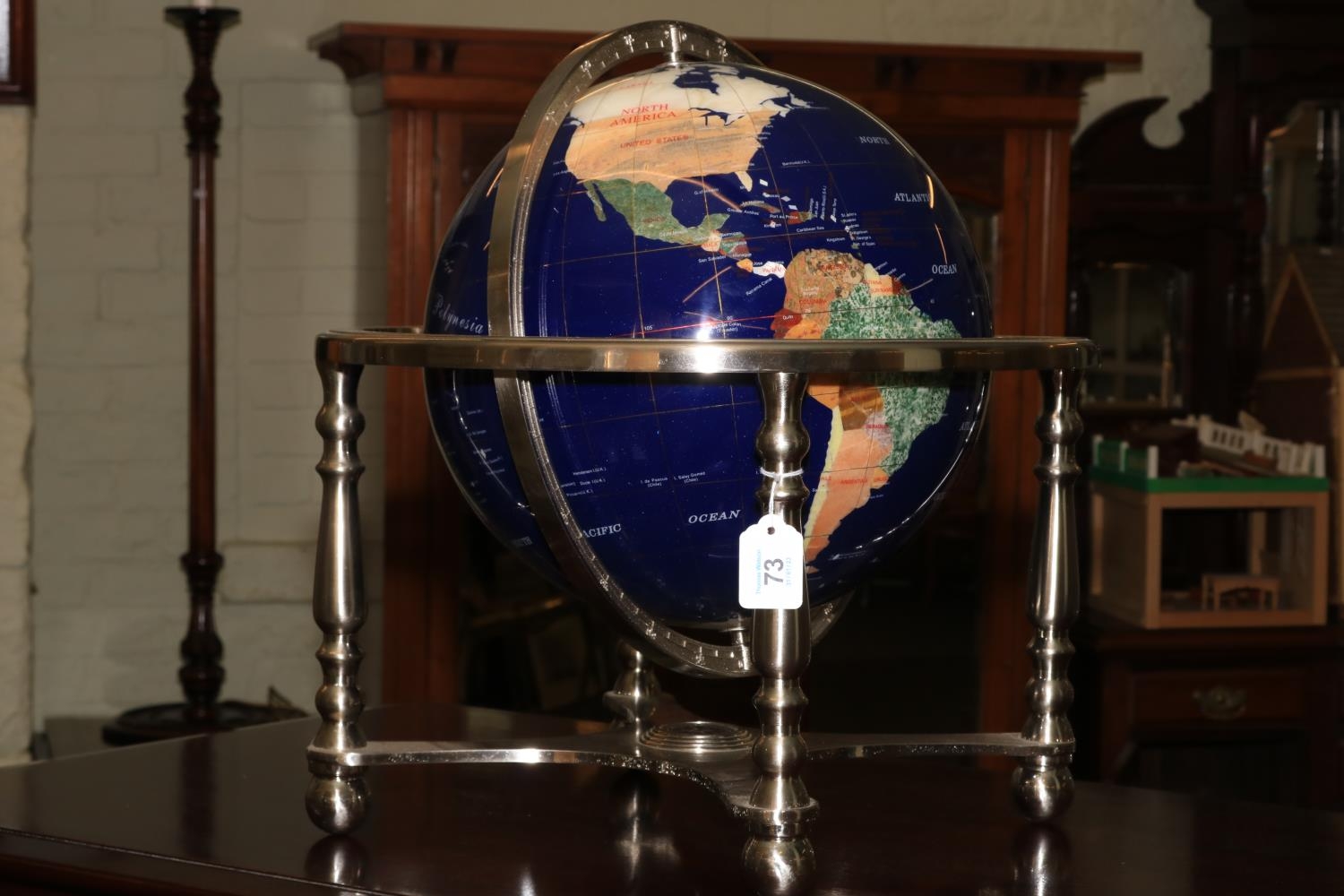 Semi-precious stone terrestrial globe and on four legged stand with centralised compass with box.