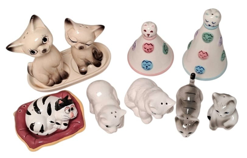 A Collection of 5 Vintage Ceramic Cat Salt and Pepper Sets. All in excellent condition. A couple have the stoppers missing.