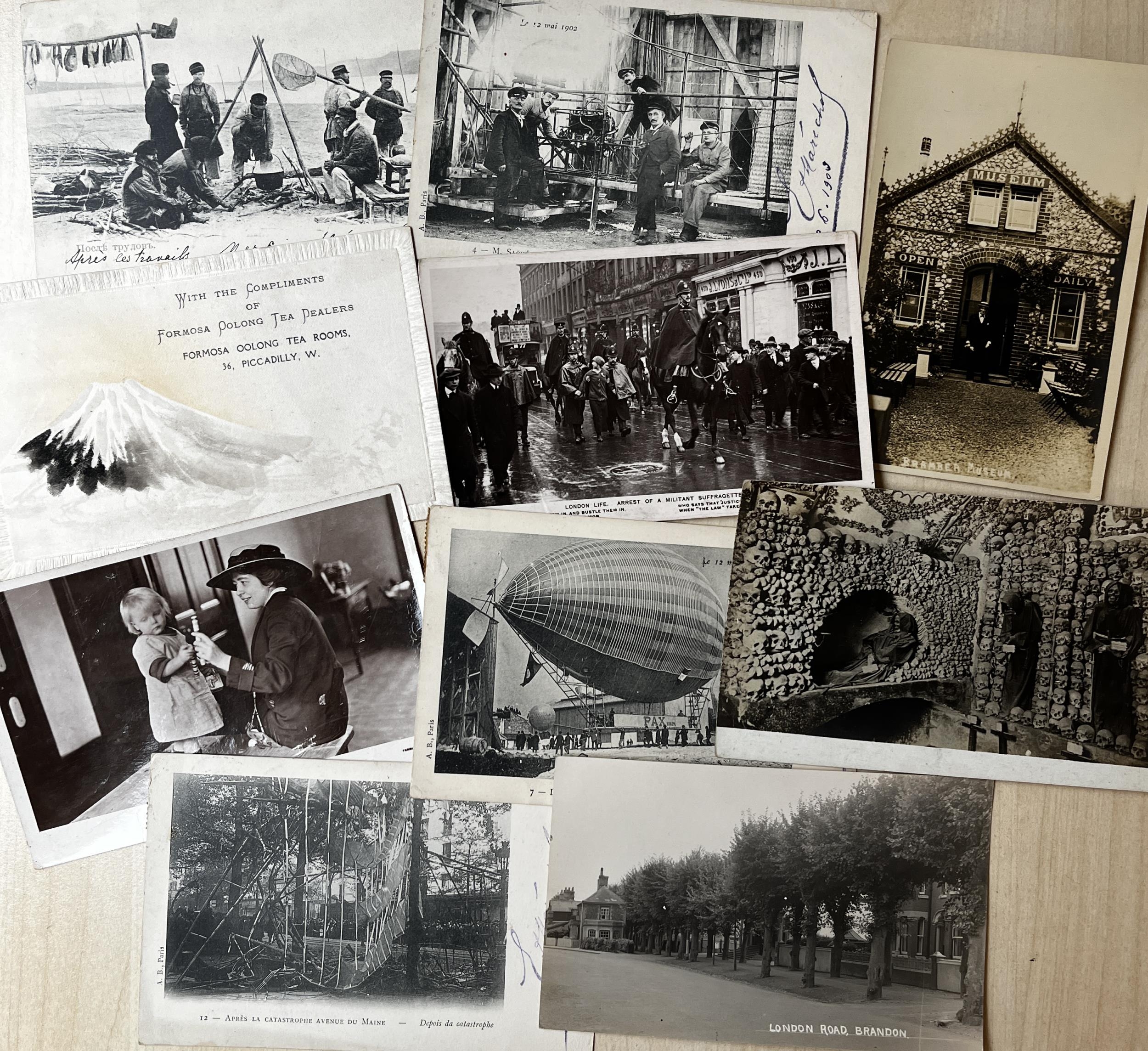 A collection of several hundred early to mid-20th Century postcards, collected on various themes including Rural Russian Life capturing the everyday life, landscapes, and traditions of rural Russia, UK Real Photos of Villages and Sea-side scenes, A series of postcards celebrating French culture, famous personalities, and iconic landmarks, including the renowned Moulin Rouge in Paris, noted x2 UK Suffragette Cards and a series of cards on early French air pioneers, including a series chronicling the flight of an air balloon and the tragic disaster that followed, condition is generally good throughout