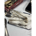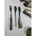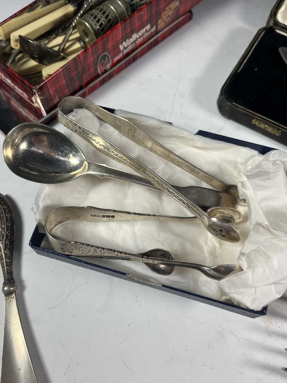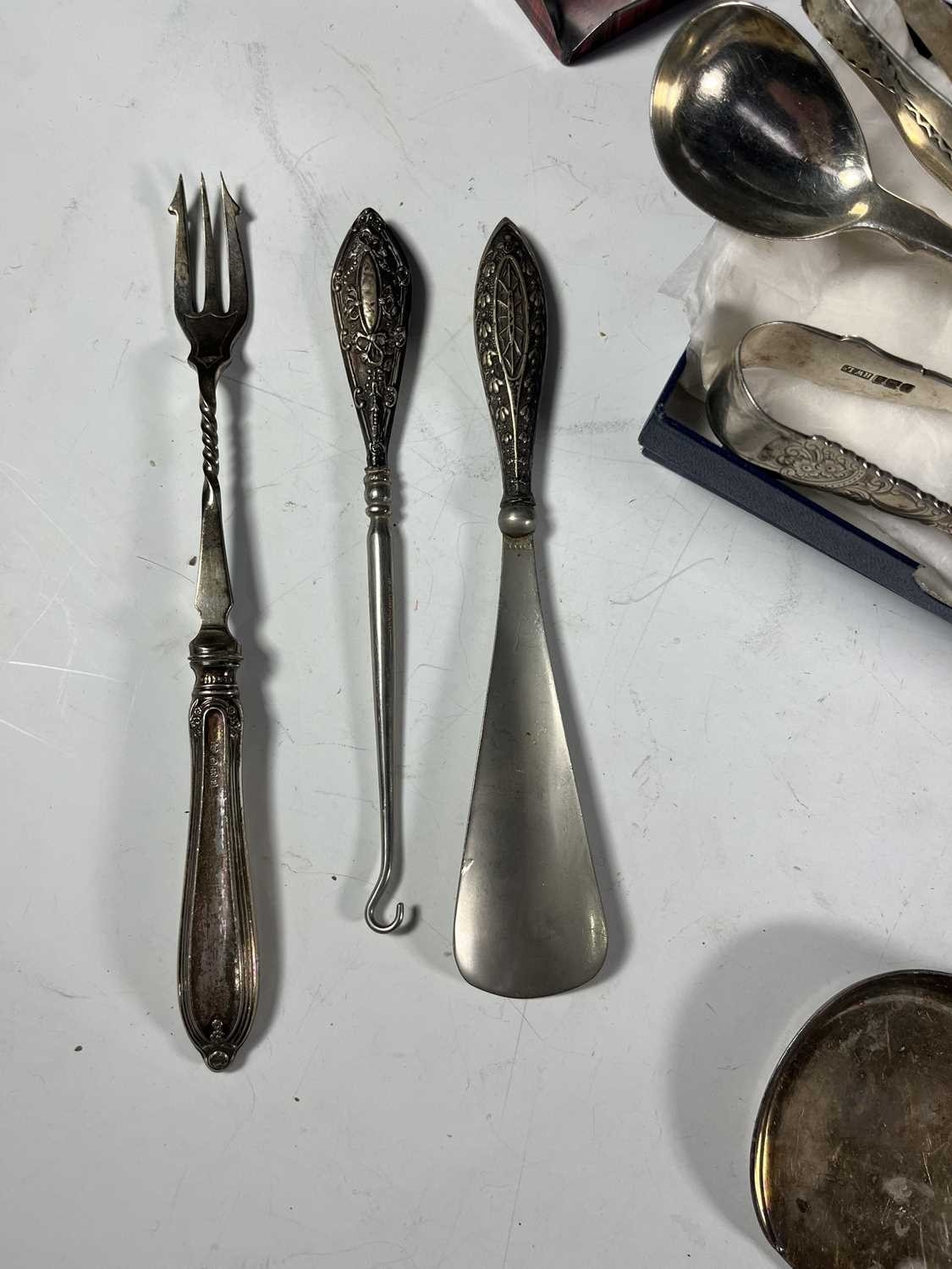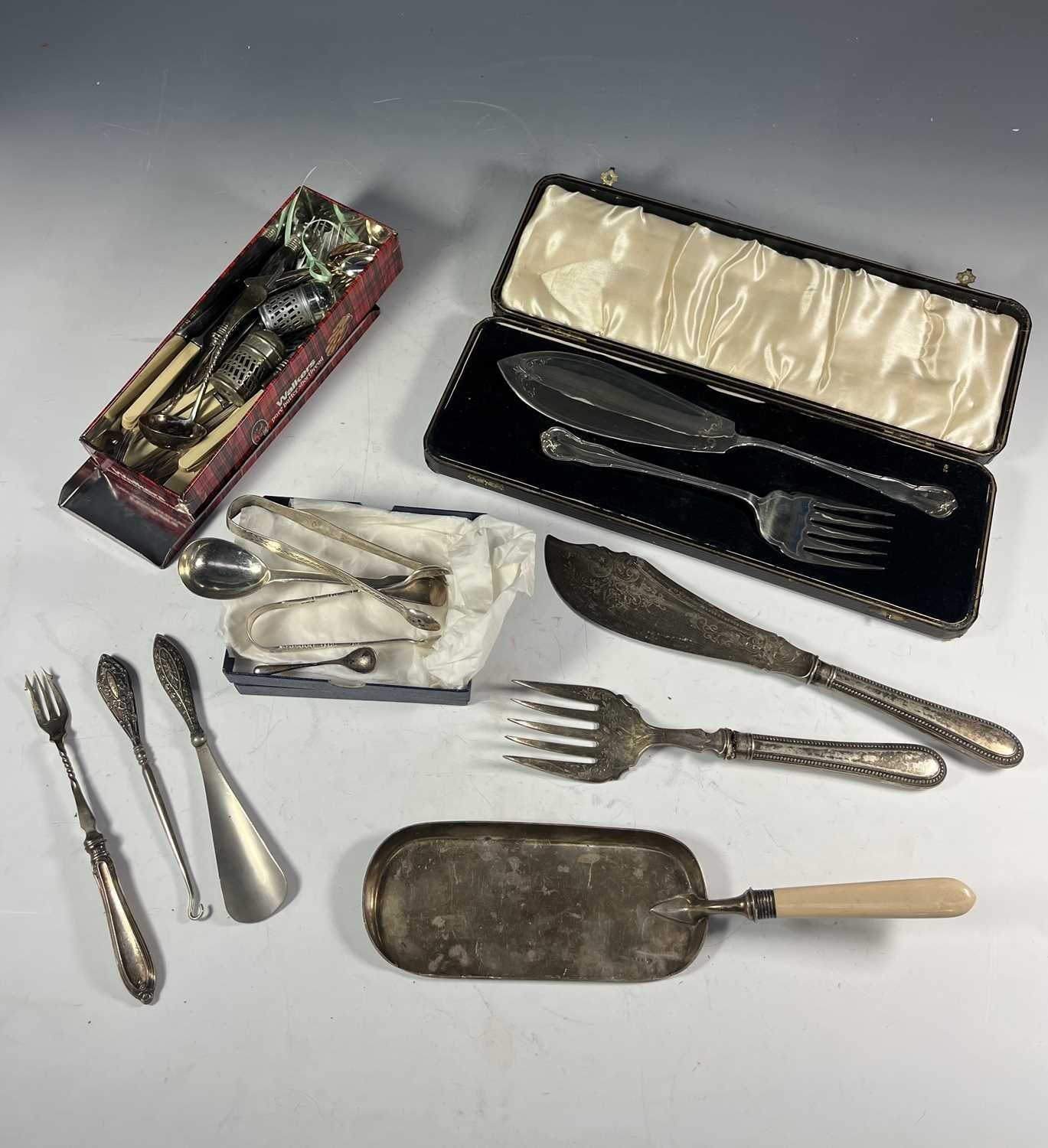 A selection of silver and silver plate to include boxed and unboxed fish servers, a bone handled crumb tray, a selection of small plated knives, forks and spoons, silver handled button hook, shoe horn, fork and approx 92g of weighable silver (1 tray)