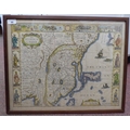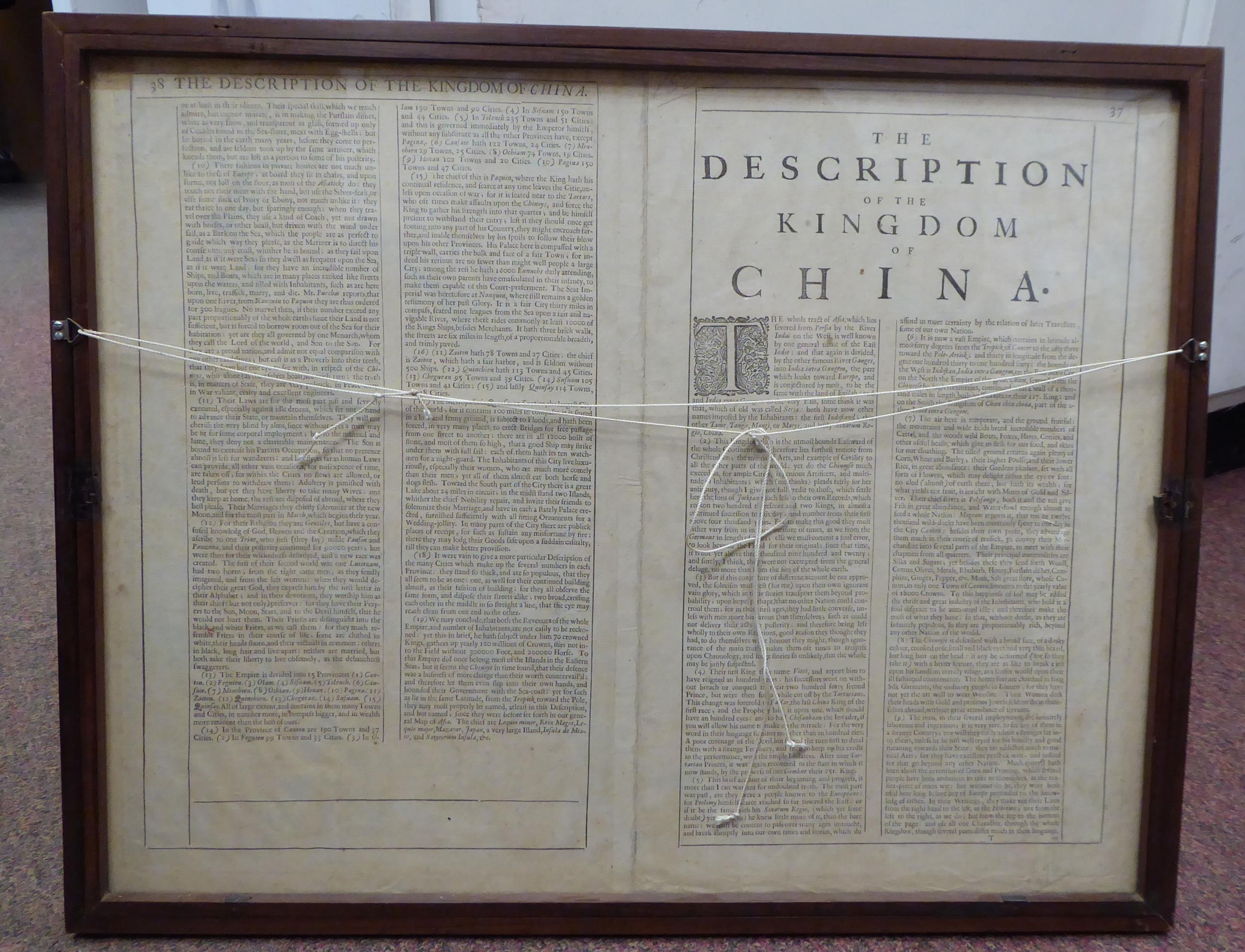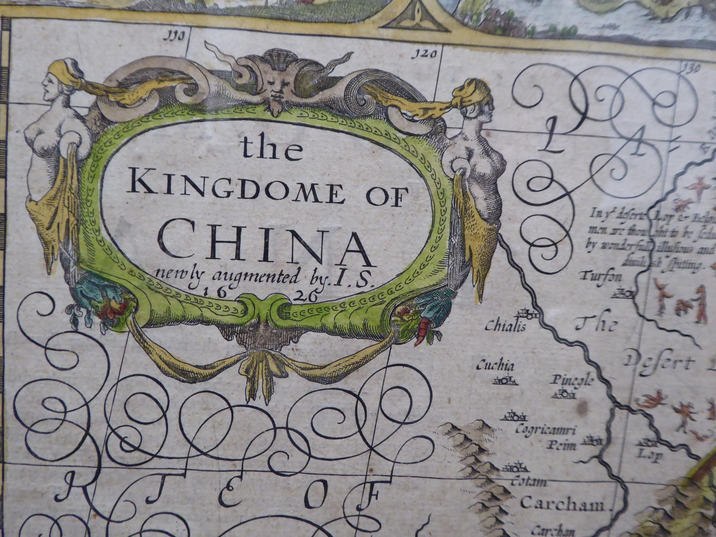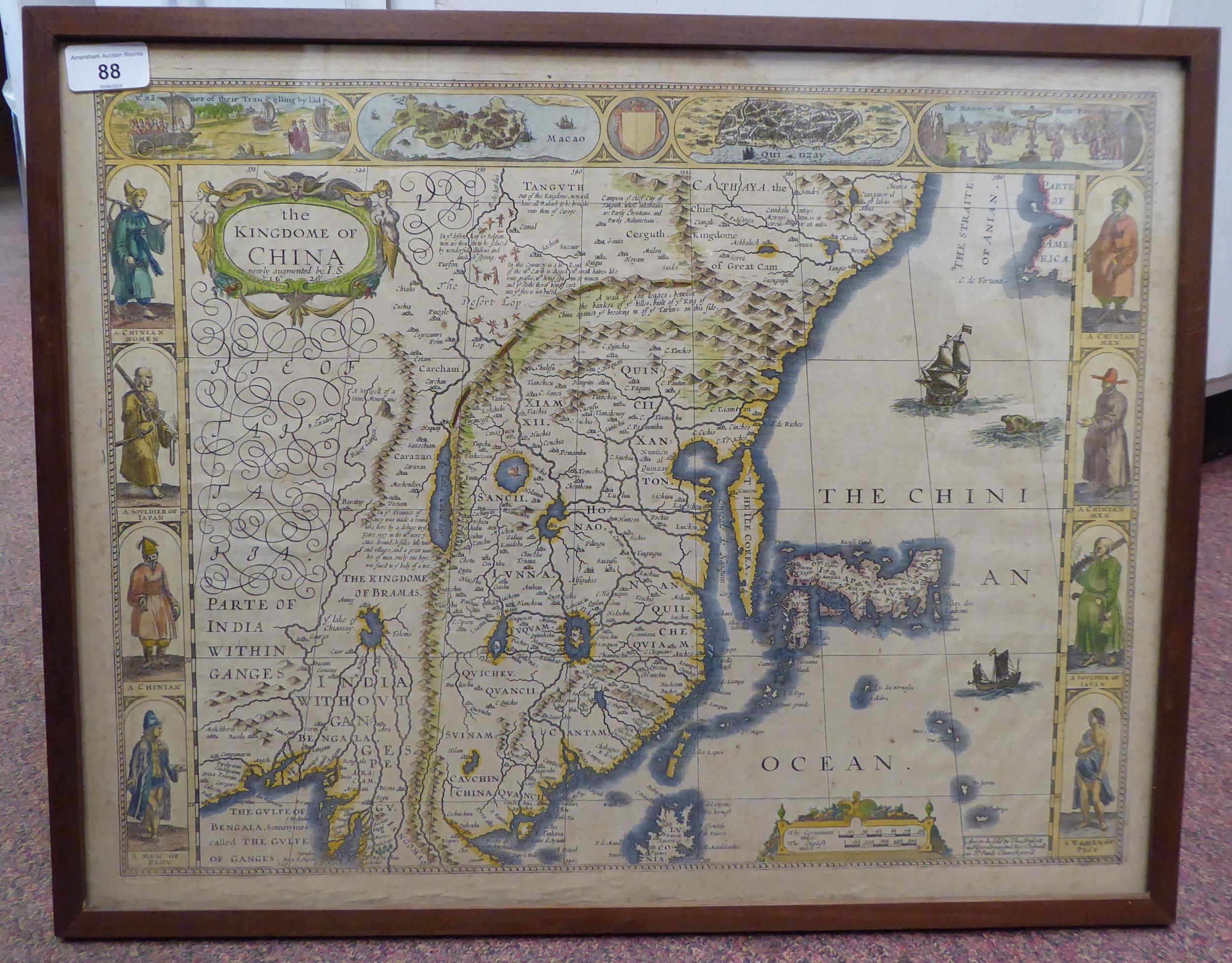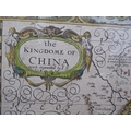 A John Speed coloured map 'The Kingdome of China, Newly Augmented by I.S 1626, a double page map with printed text verso, incorporating Korea and some islands of Japan, featuring a figural, title cartouche, the margins with views of Islands of Macau, Quinzay and other illustrations 16.5" x 21" framed