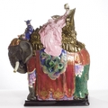 The Princess modelled holding an exotic feathered fan whilst enthroned high upon the back of an elephant draped in magnificent, colourful silks heightened with elaborate gilt arabesque detail Height 51cm