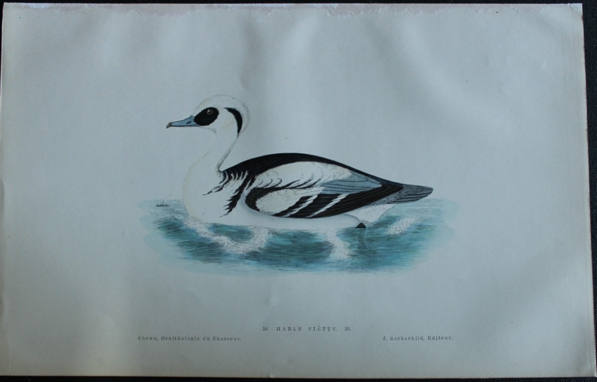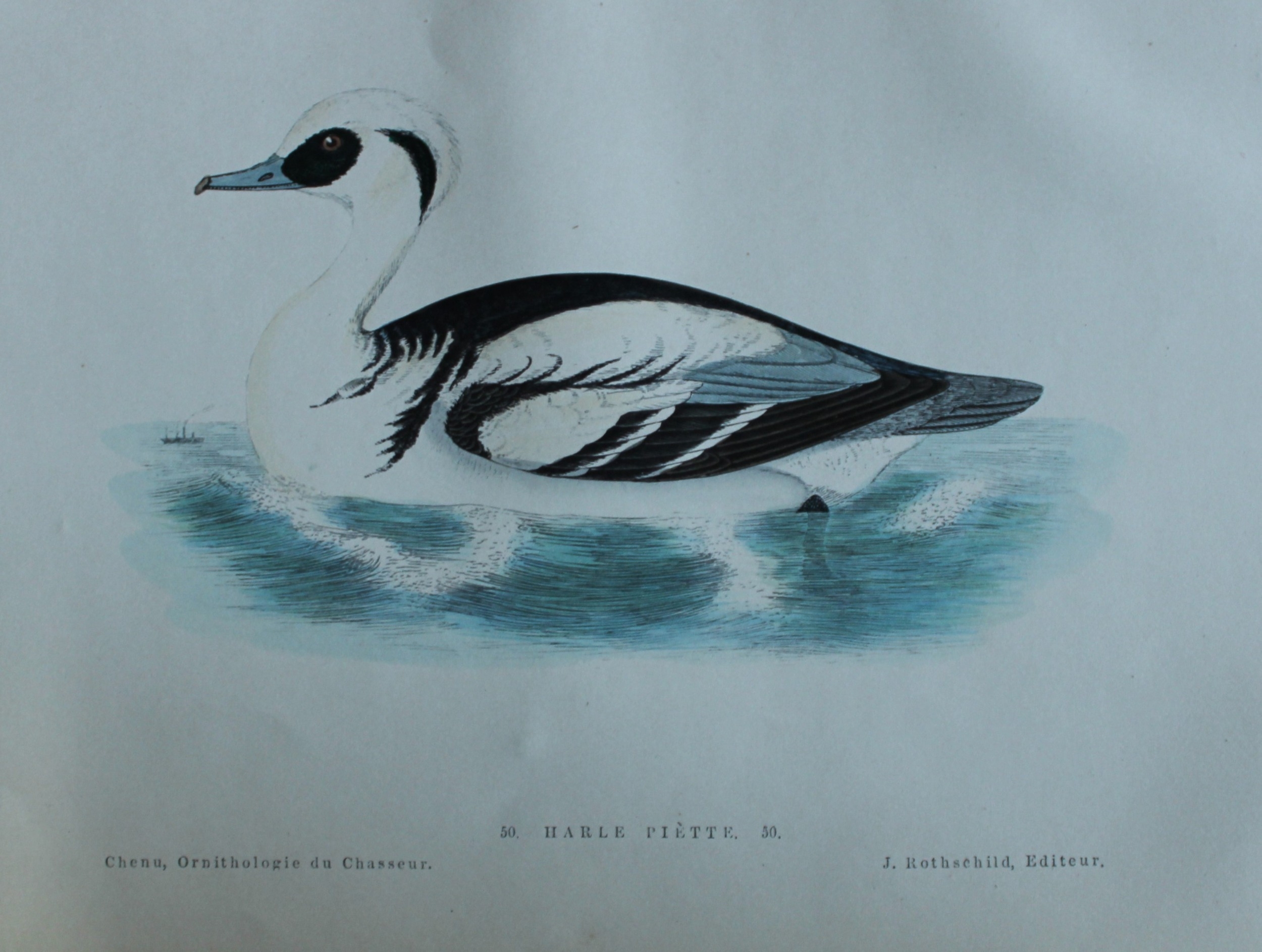 The birds featured are: Harle Piette (Smew), Canard a Iris Blanc (White-eyed Duck) and the Canard Ridenne (Gadwall).