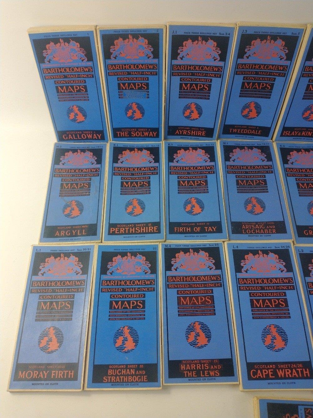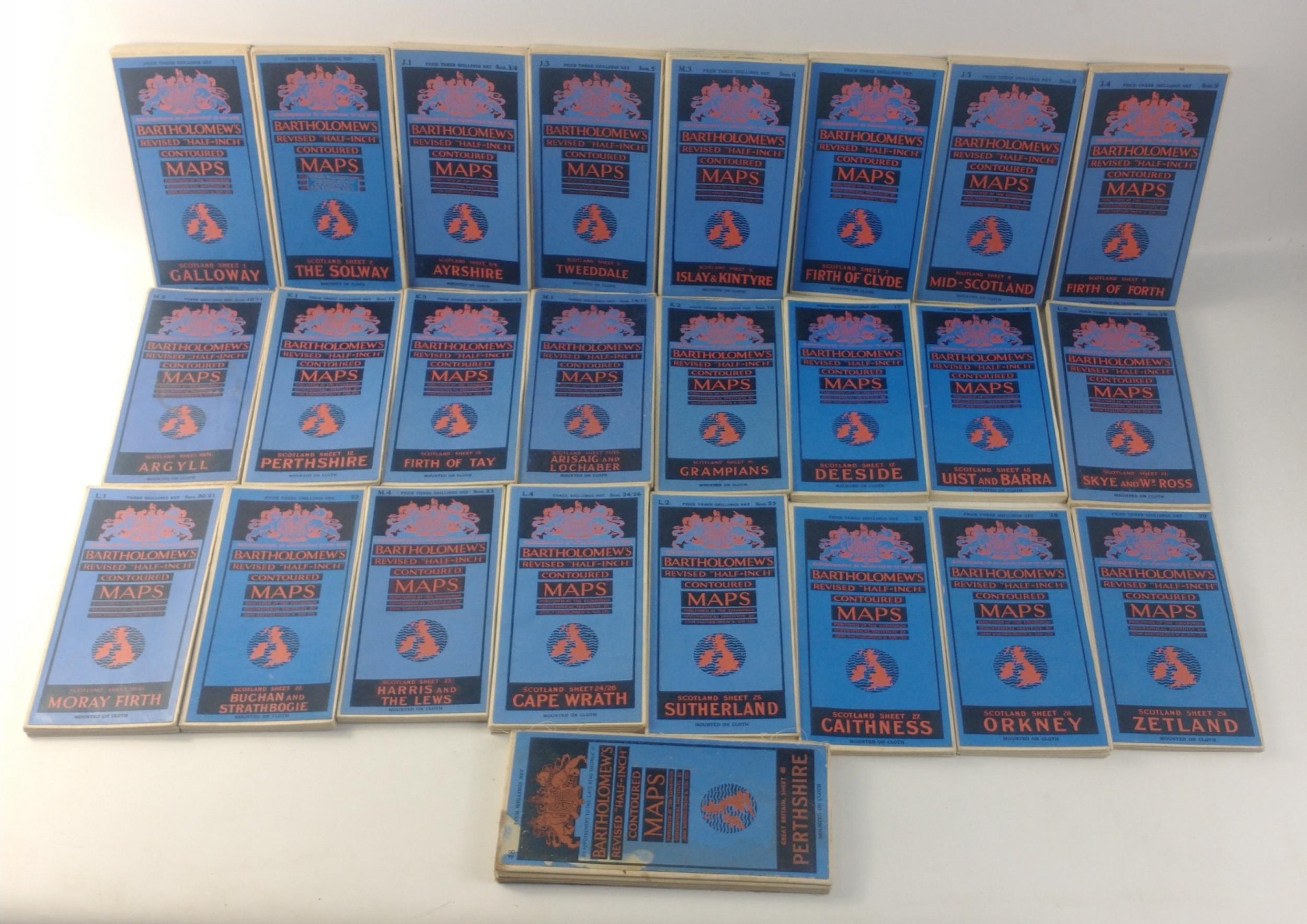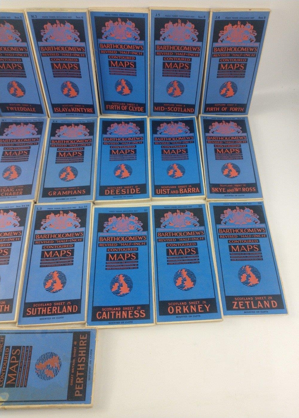 A great lot for afficionados of cloth-mounted maps! A selection of BARTHOLOMEW'S REVISED HALF-INCH CONTOURED MAPS of SCOTLAND to include areas such as Galloway, Perthshire, The Solway, Ayrshire and Tweeddale among many others.