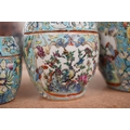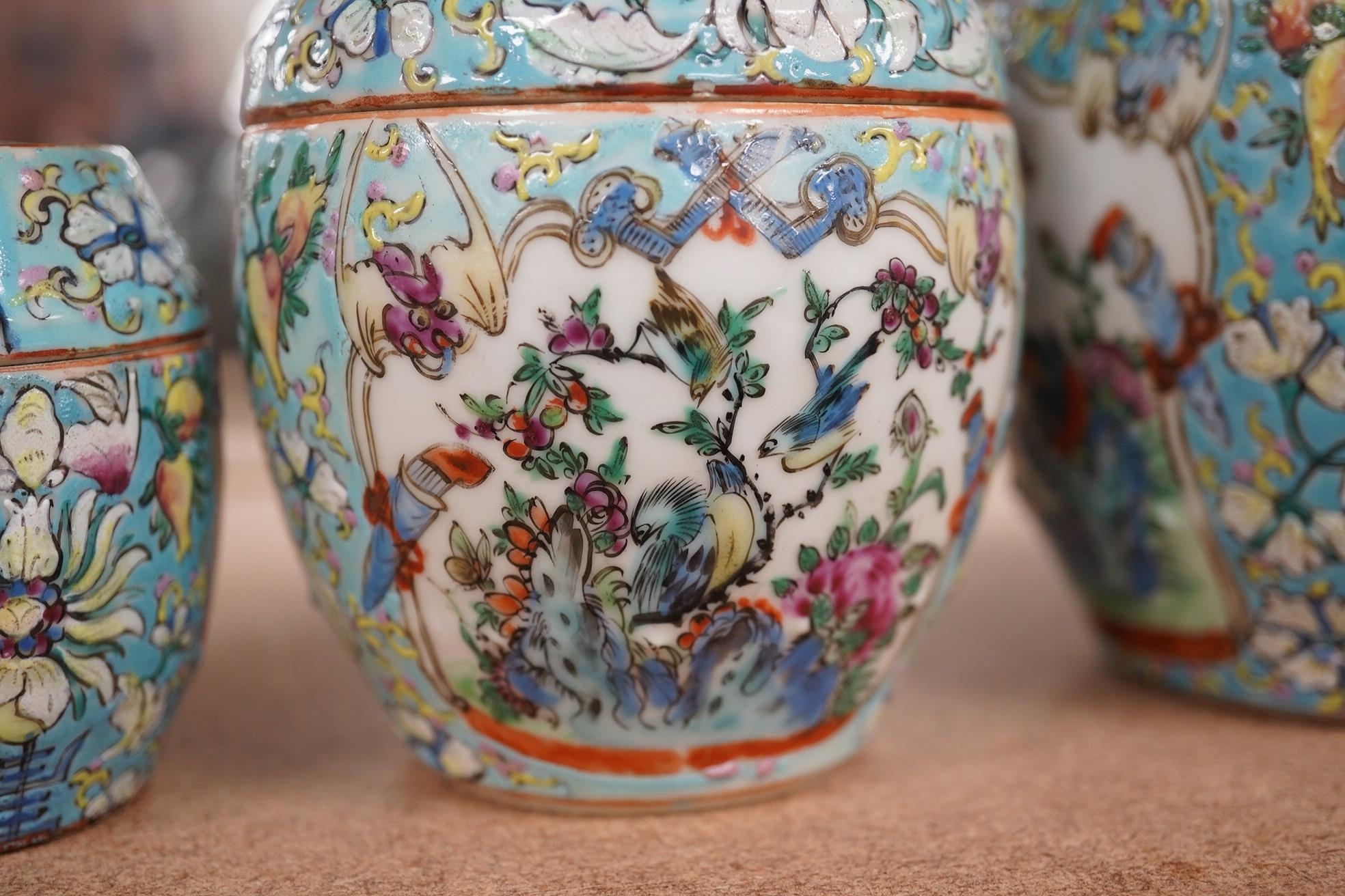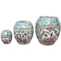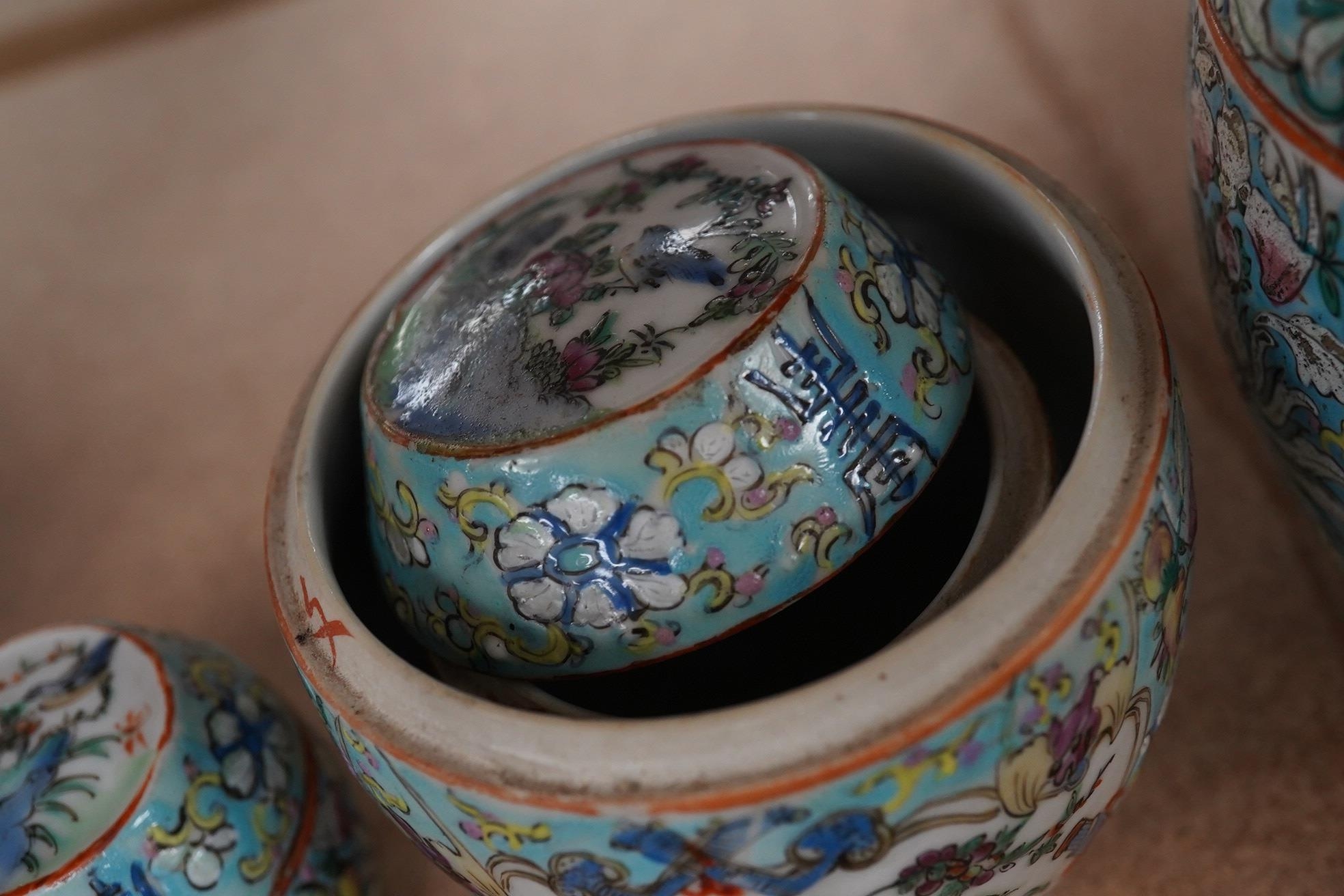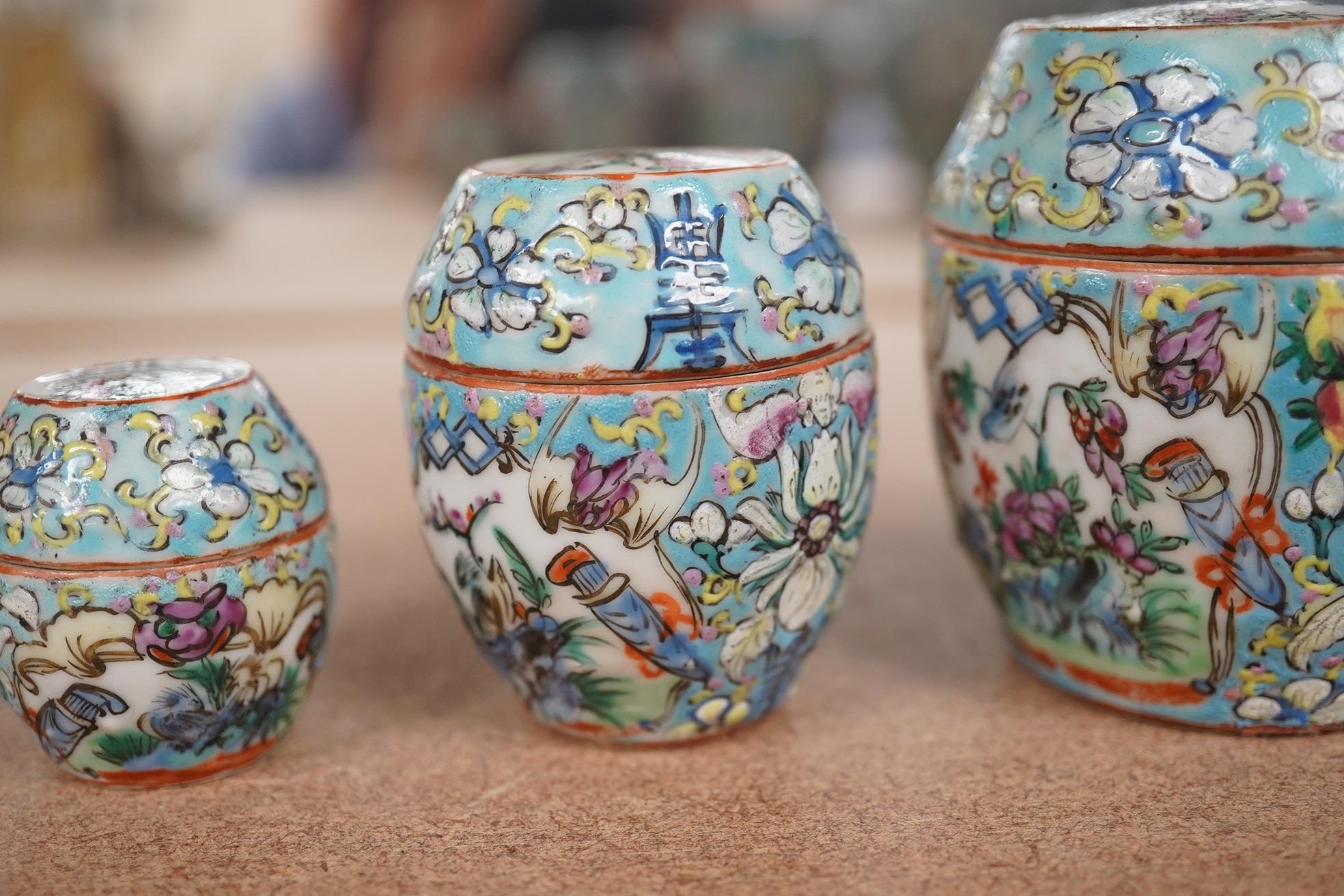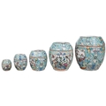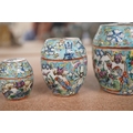A Chinese porcelain nest of five enamelled porcelain barrel shaped boxes, c.1900, largest 12cm high. Condition - fair, some minor chipping