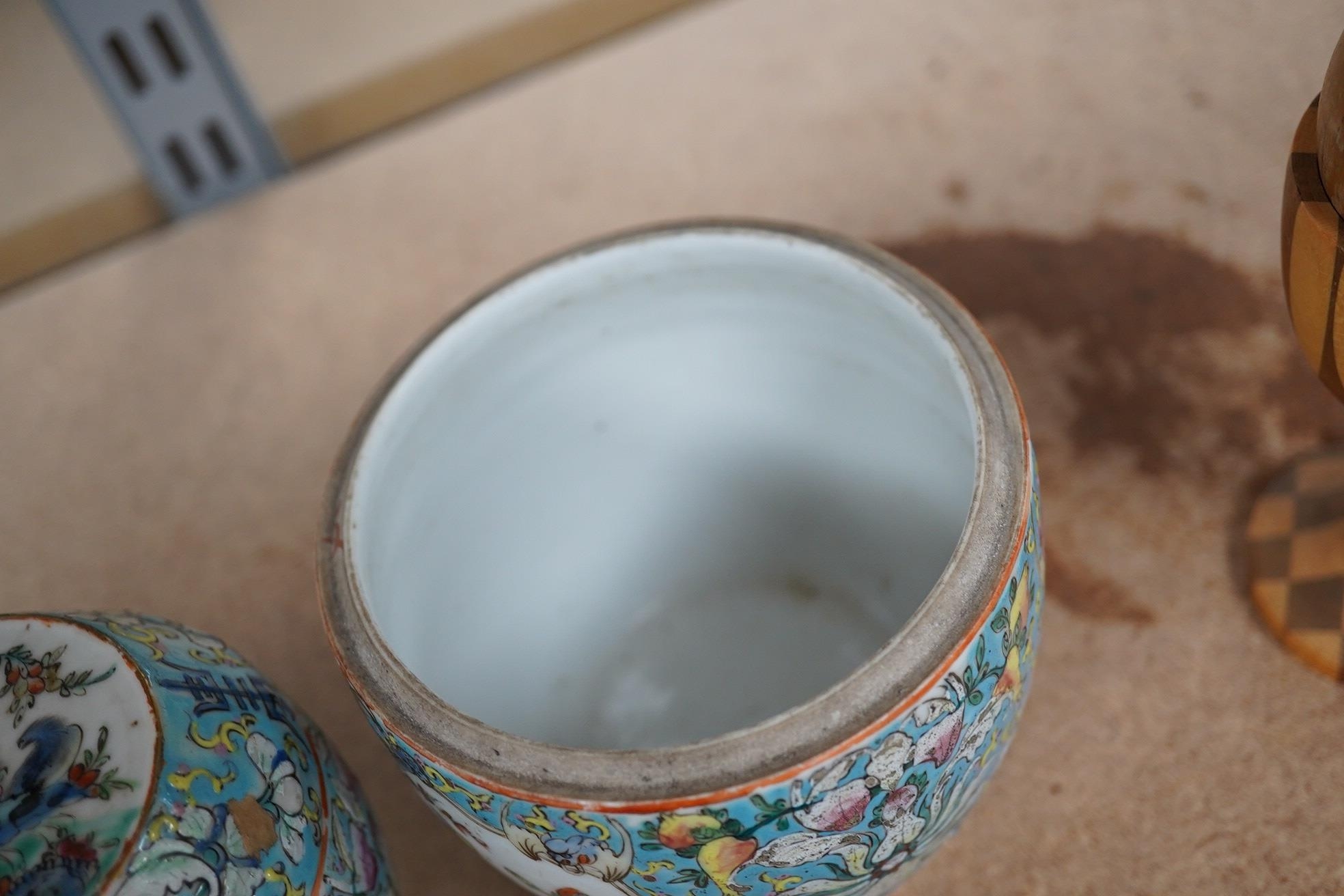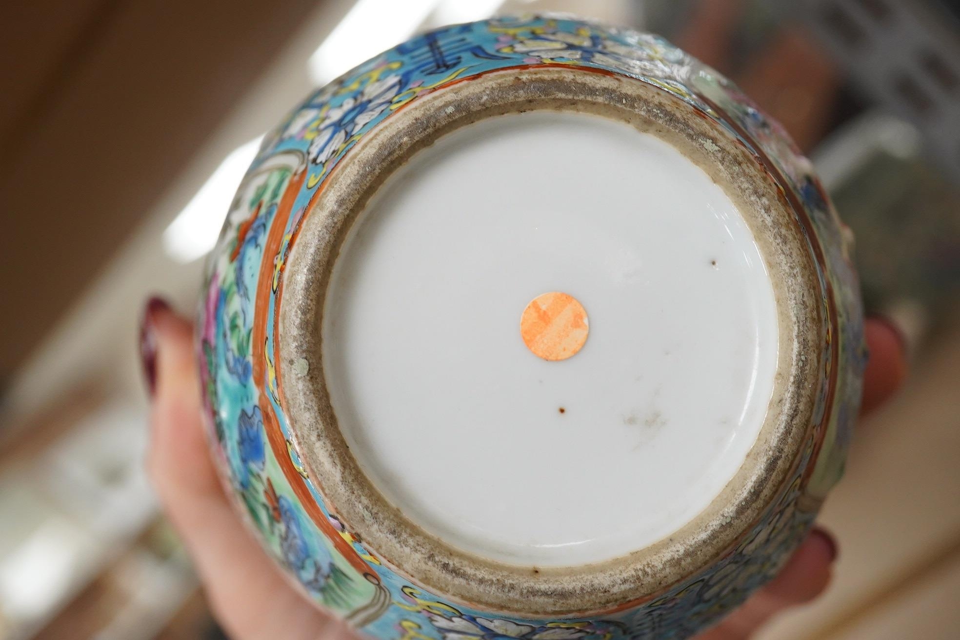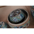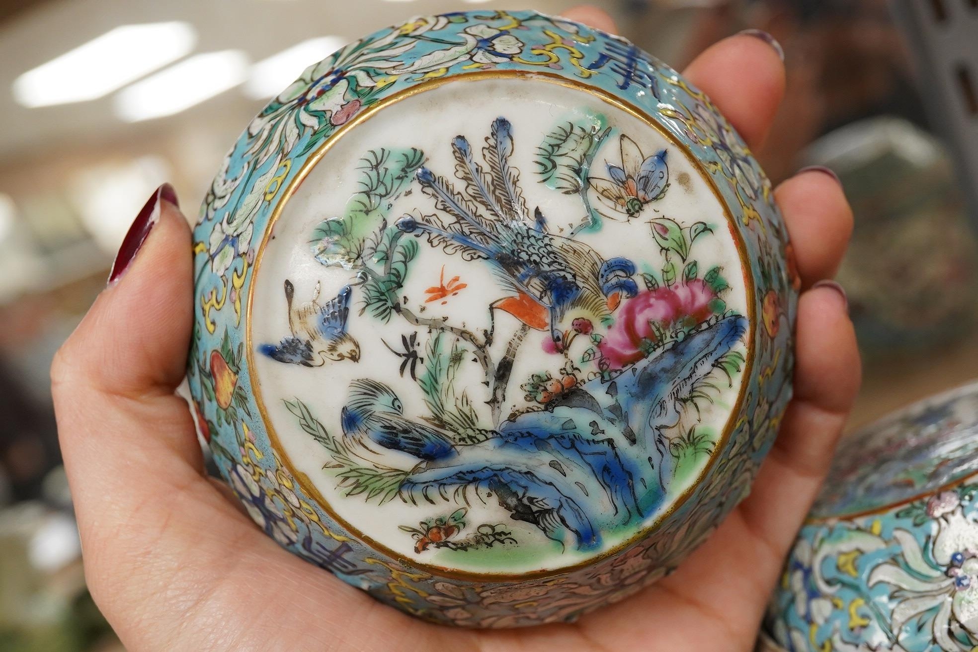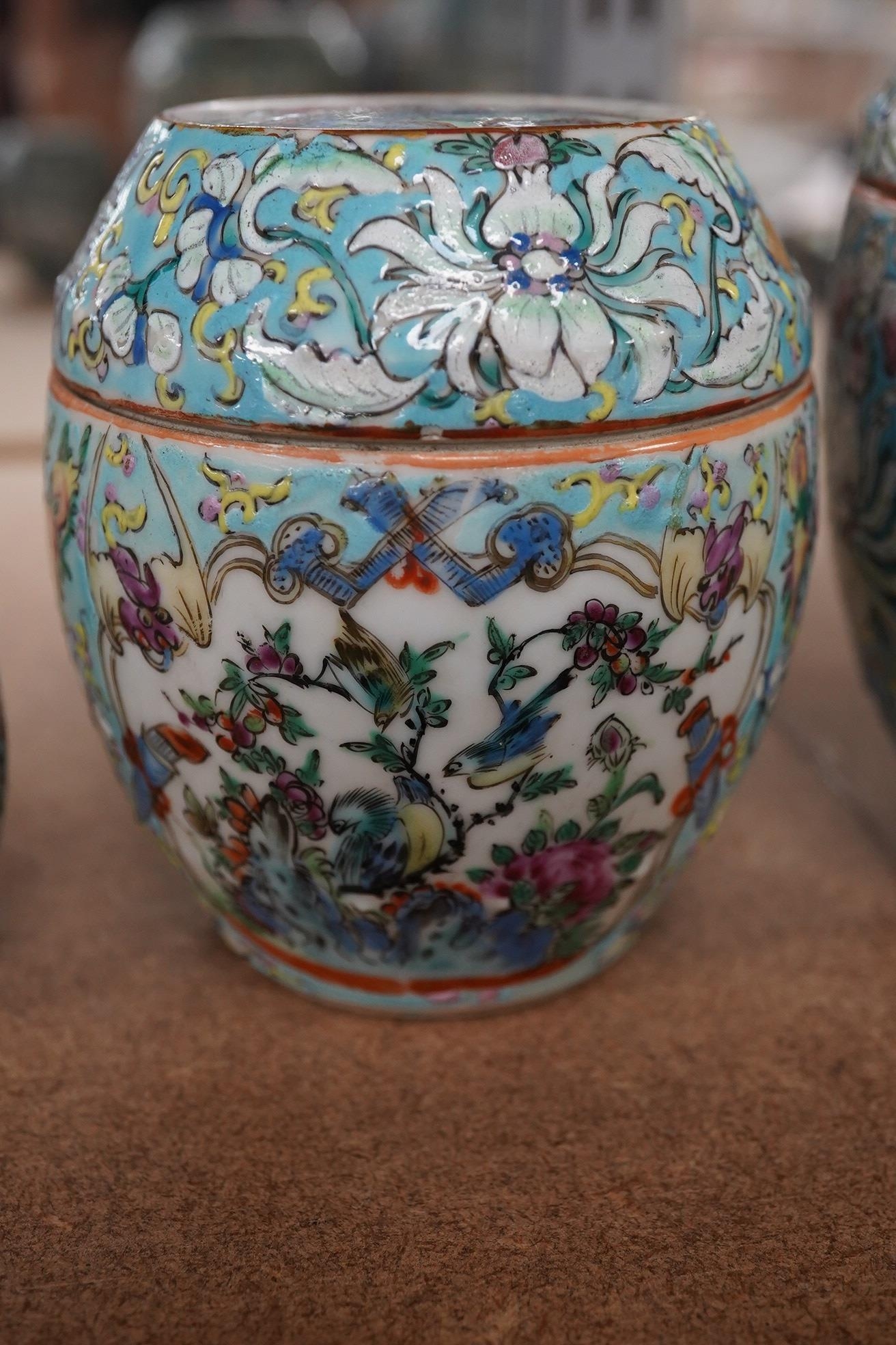 A Chinese porcelain nest of five enamelled porcelain barrel shaped boxes, c.1900, largest 12cm high. Condition - fair, some minor chipping